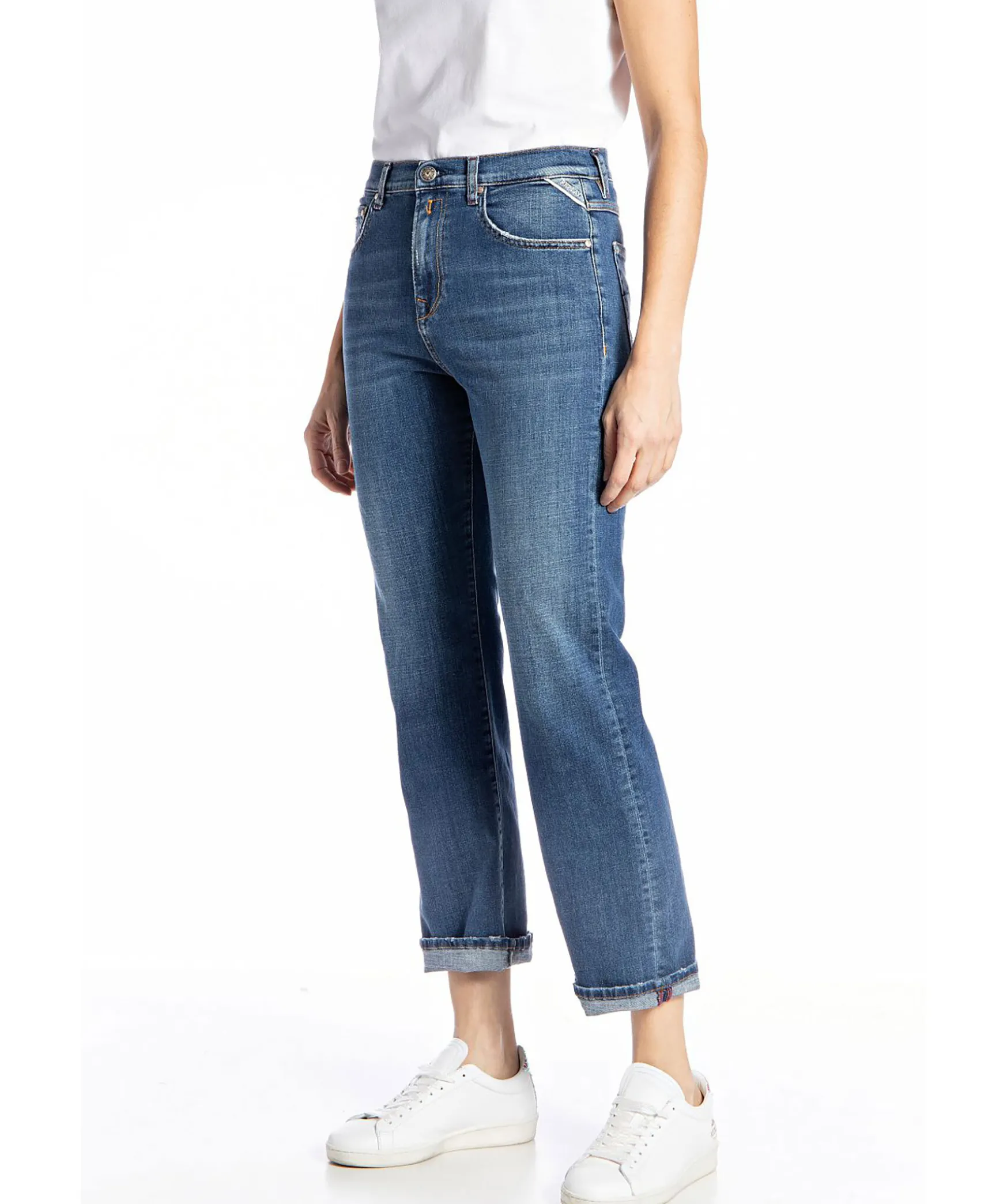 Mellanblaa Jeans Med Rak Passform Fran Replay. Tillverkade I Stretchig Bomull Och Har En Hog Midja Och Raka Ben. Fem Fickor, Triangelformad Replay-Etikett Pa Vanster Framficka, Myntficka Och Bakfickor Med Ikoniska Replay Monster. Hallor For Balte I Midjan, Svart Och Lackad Etikett Bak Pa Linningen Samt Stangs Fram Med Dold Dragkedja Och Knappgylf. Modellen Ar 175 Cm Lang Och Har Pa Sig Storlek 27″30.
