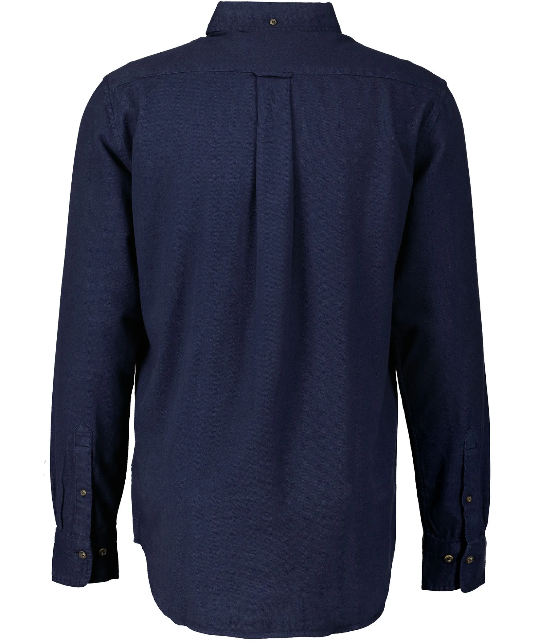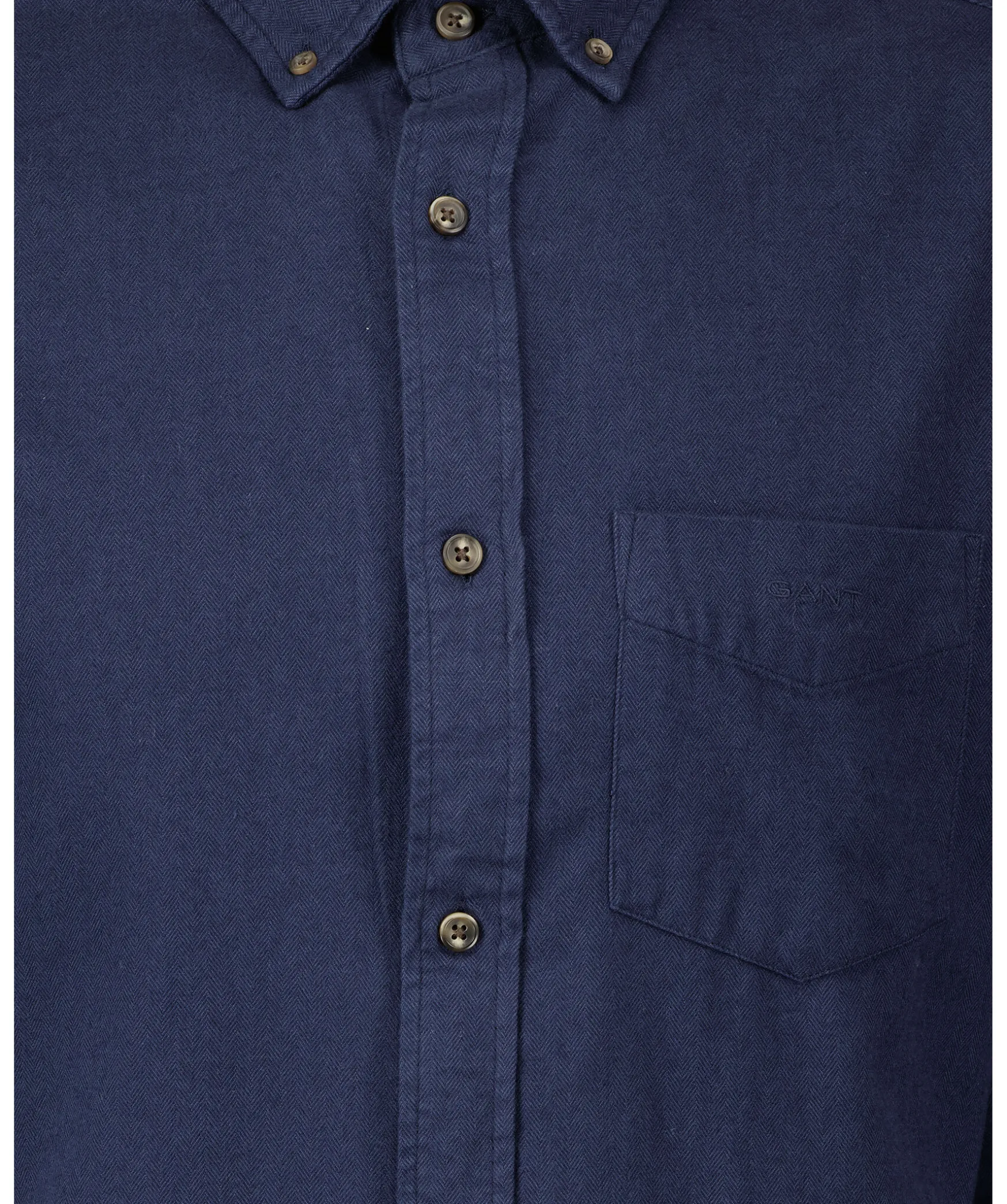 Morkbla Fiskbensmonstrad Flanellskjorta Fran Gant. Brostficka Pa Vanster Sida Med Broderad Logotyp. Enkla Manschetter. Button Down-Krage. Tillverkad I 100% Bomull. Boxpleat Med Locker Loop I Ryggen.