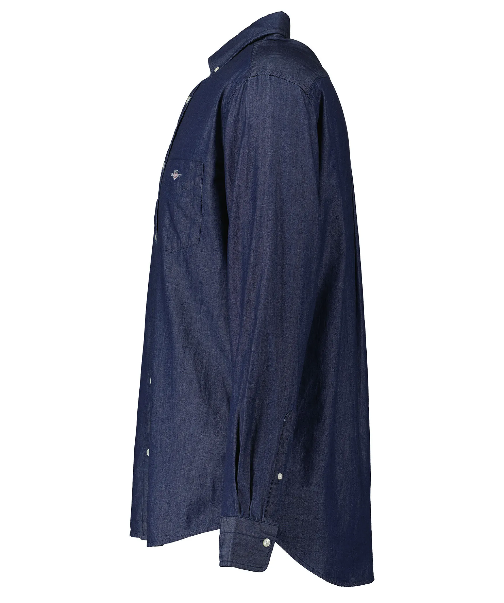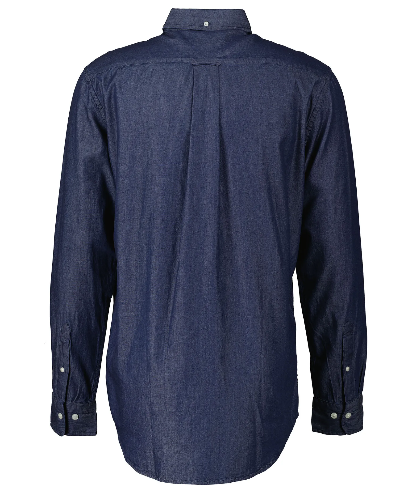 Morkbla Jeansskjorta Fran Gant. Stangs Framtill Med Knappar. Enkla Manschetter. Button Down-Krage. Brostficka Pa Vanster Sida Med Broderad Logotyp. Boxpleat Med Locker Loop I Ryggen.