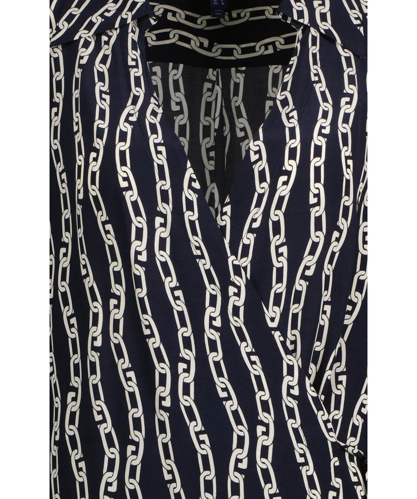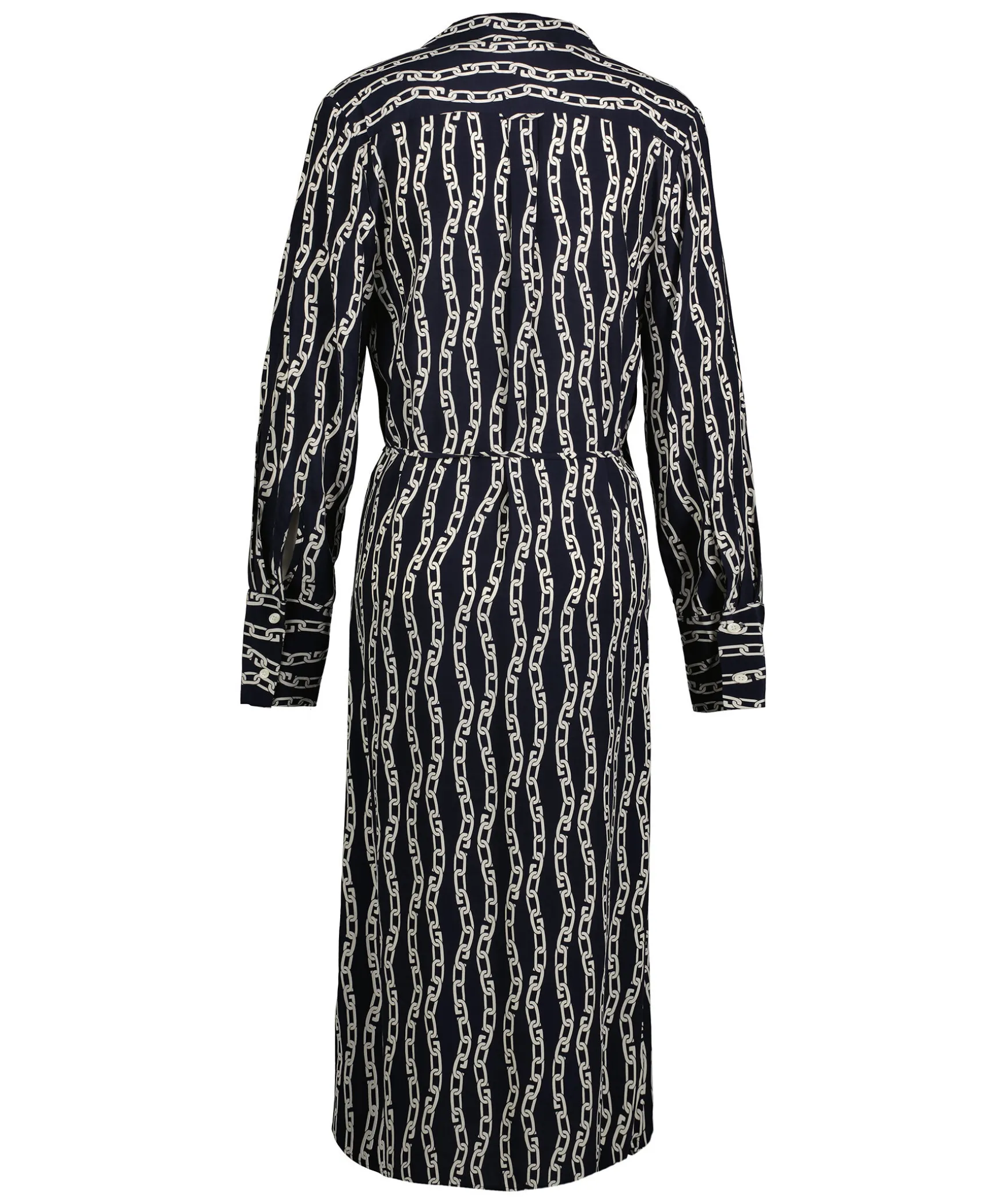 Marinbla, Langarmad Omlottklanning Med Ett Heltackande Kedjemonster I Vitt Fran Gant. En Langd Som Slutar Strax Nedanfor Knat Och Breda Manschetter Med Tva Knappar Och Knytband I Midjan. V-Ringning Fram Och En Fin, Spetsig Krage Fram.