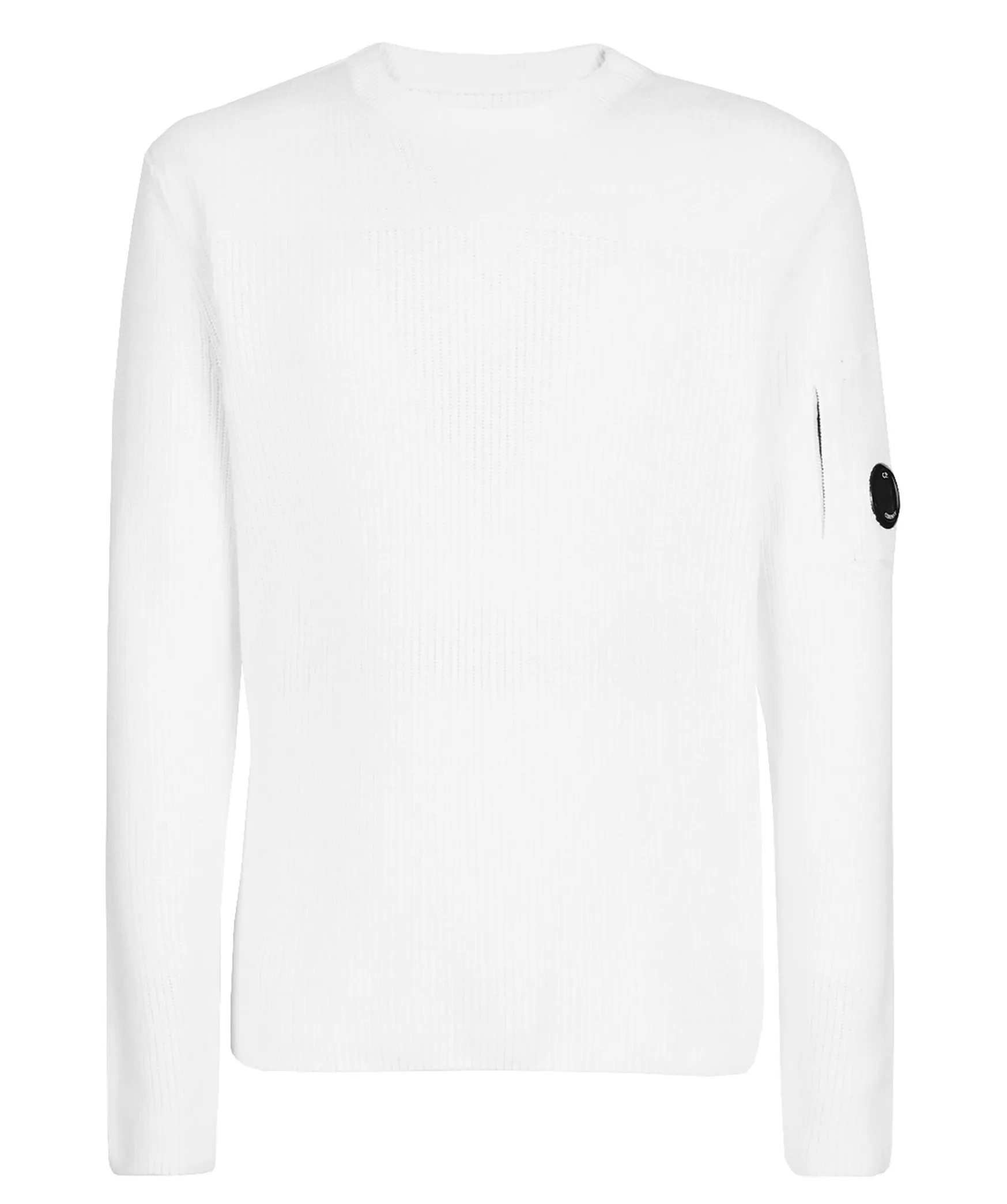Vit Ribbstickad Troja Fran C.P Company. Tillverkad I 100% Bomull. Ficka Pa Vanster Arm Med Dold Dragkedja Och Runt Patch I Plast Med Logotyp. Rundad Halsringning.