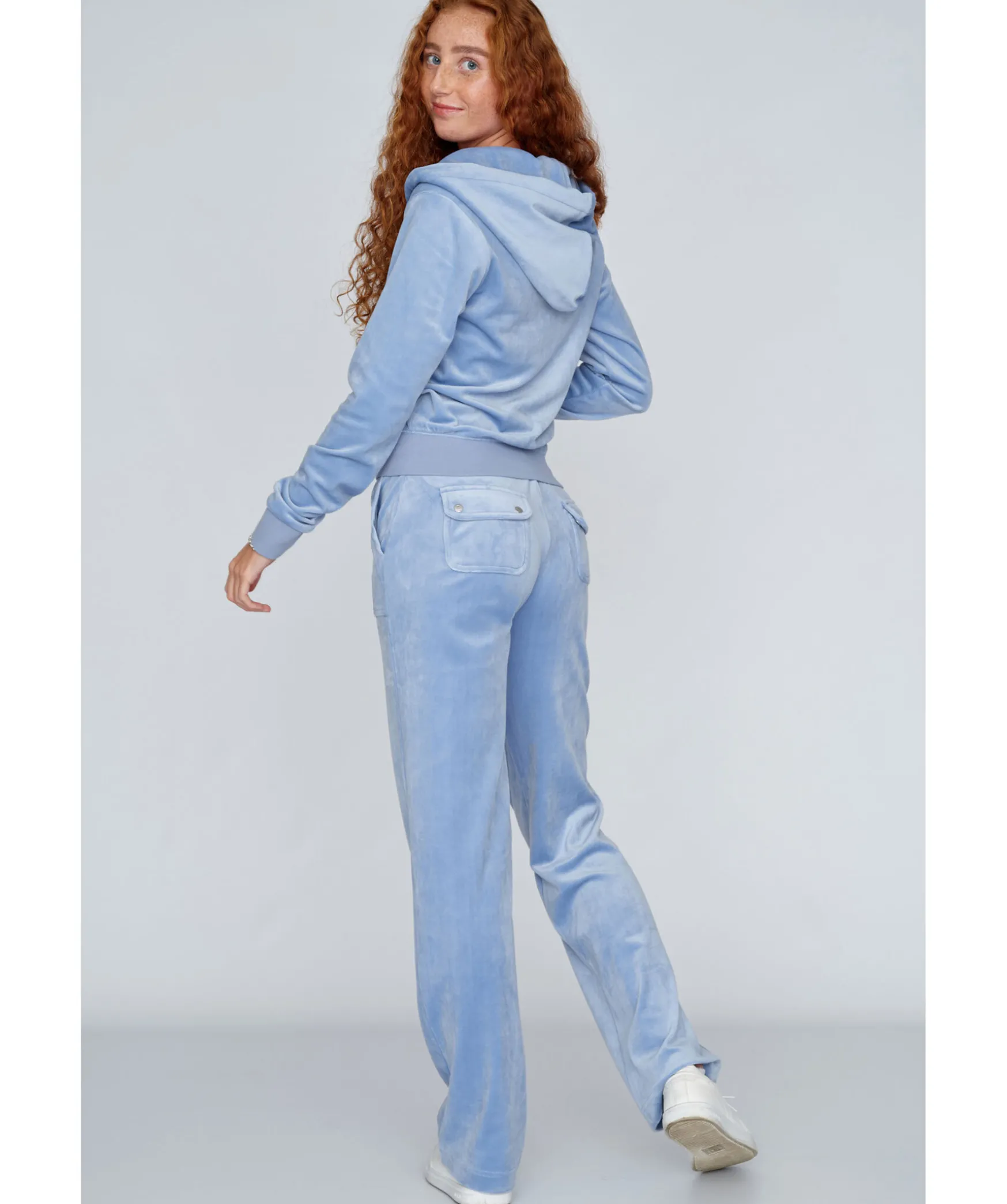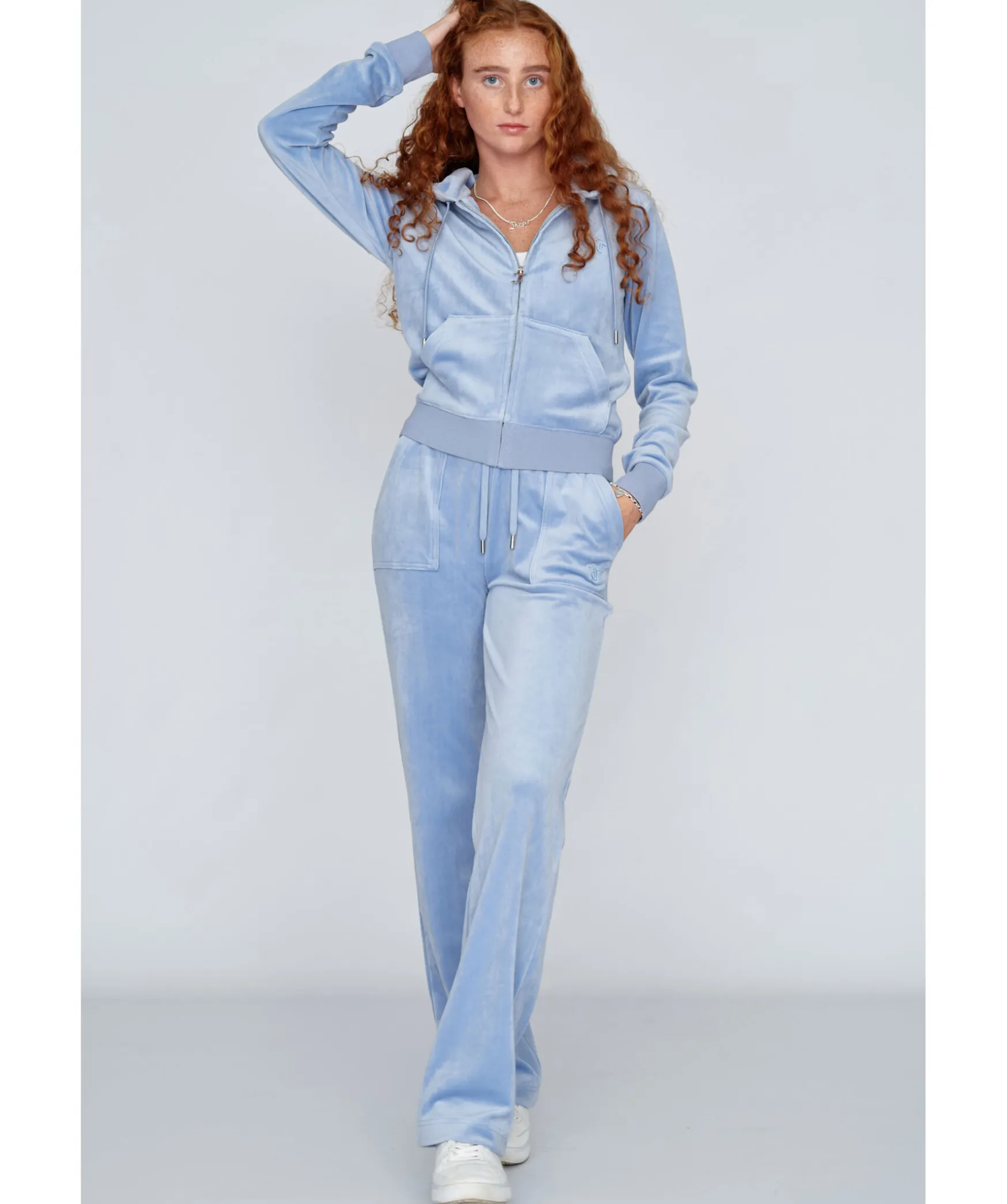 Ljusbla Hoodie Med Dragkedja Fram I Velour Fran Juicy Couture. Bred Mudd I Plaggslut Och I Armslut, Broderad Logotyp I Ton-I-Ton Pa Brostet Pa Vanster Sida. Snorning I Luvan Och Fickor Fram.