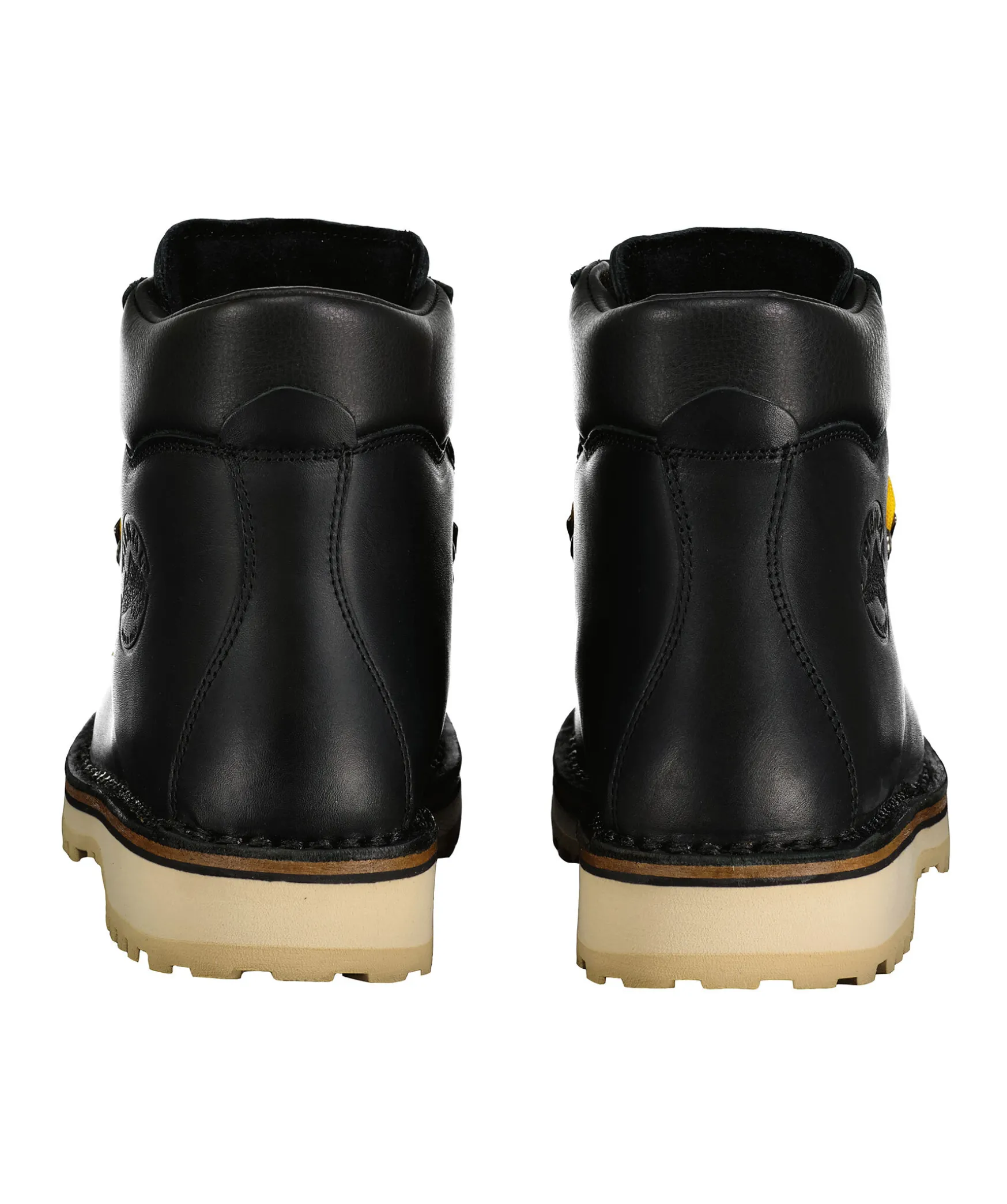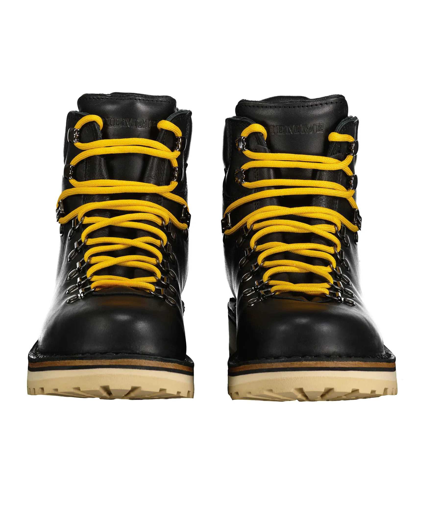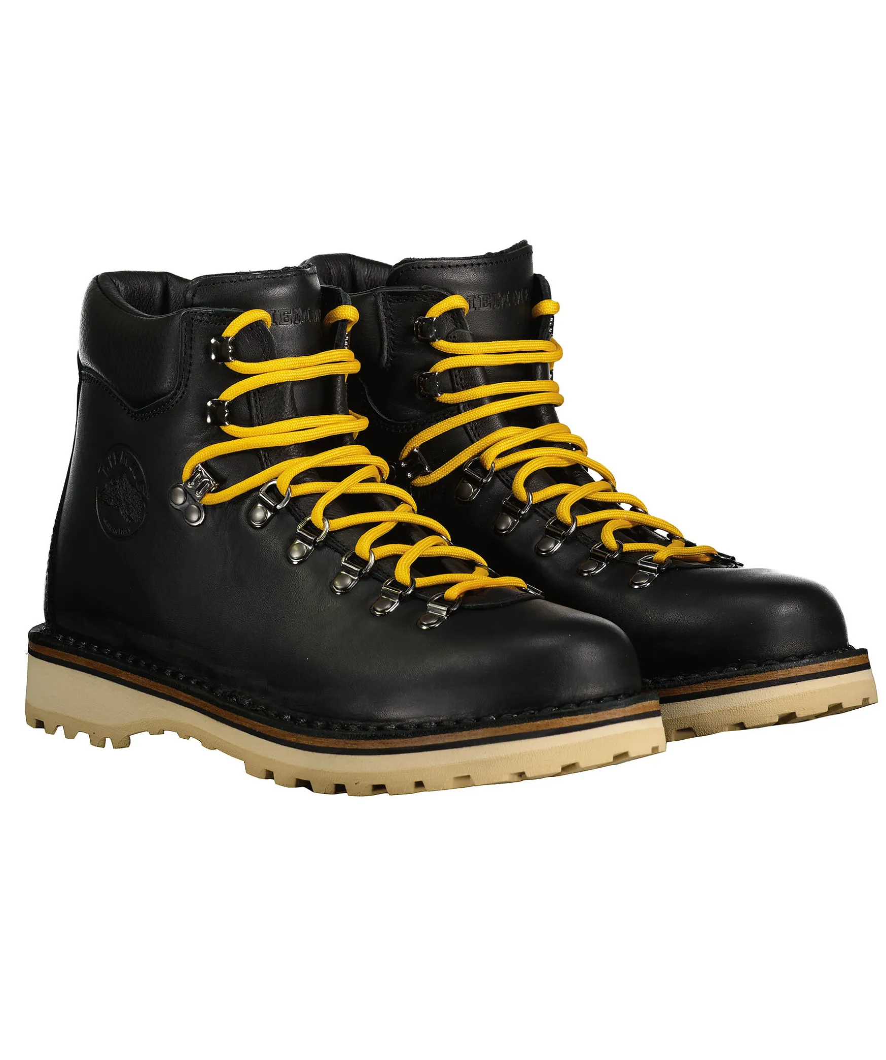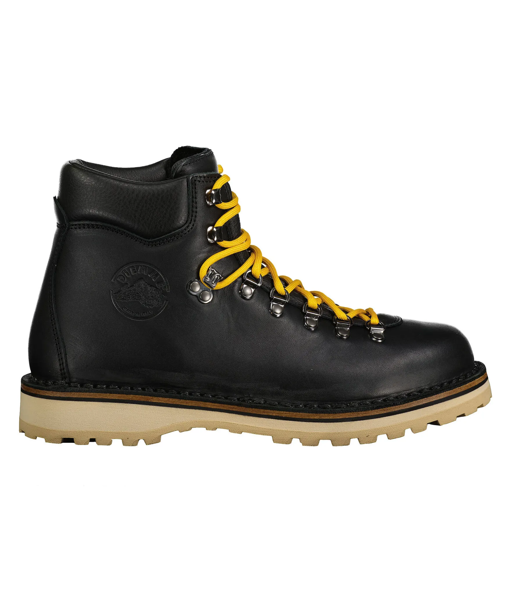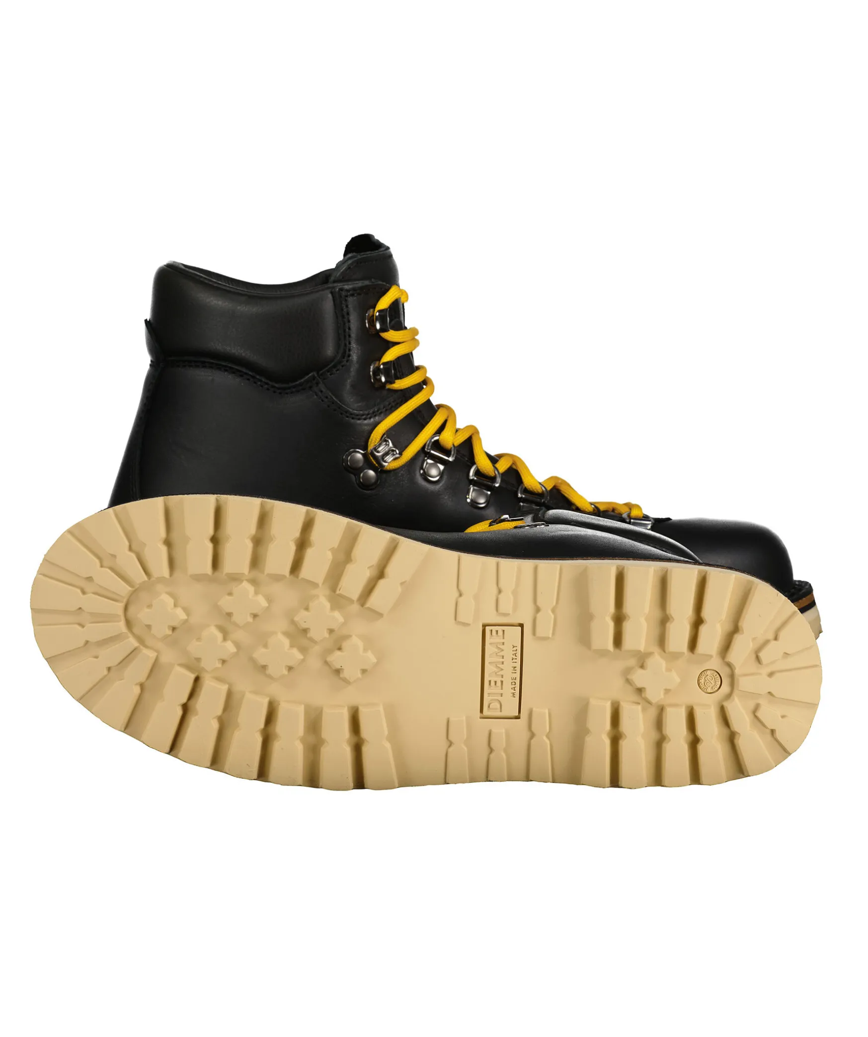 Svarta Vildmarksinspirerade Kangor Fran Diemme Tillverkade I Lader. Gula Runda Skosnoren, Tillkommer Svarta Skosnoren. Grov Sula I Beige Gummi. Stansad Logotyp Pa Skons Yttersida.