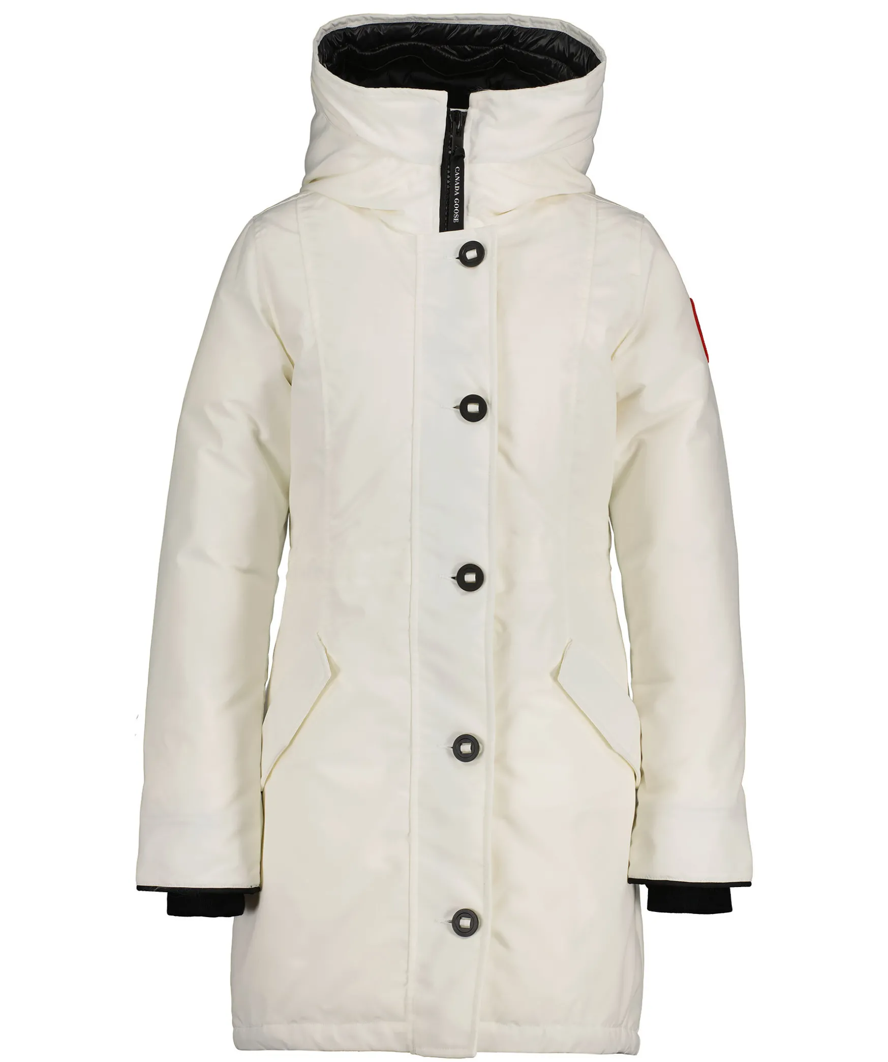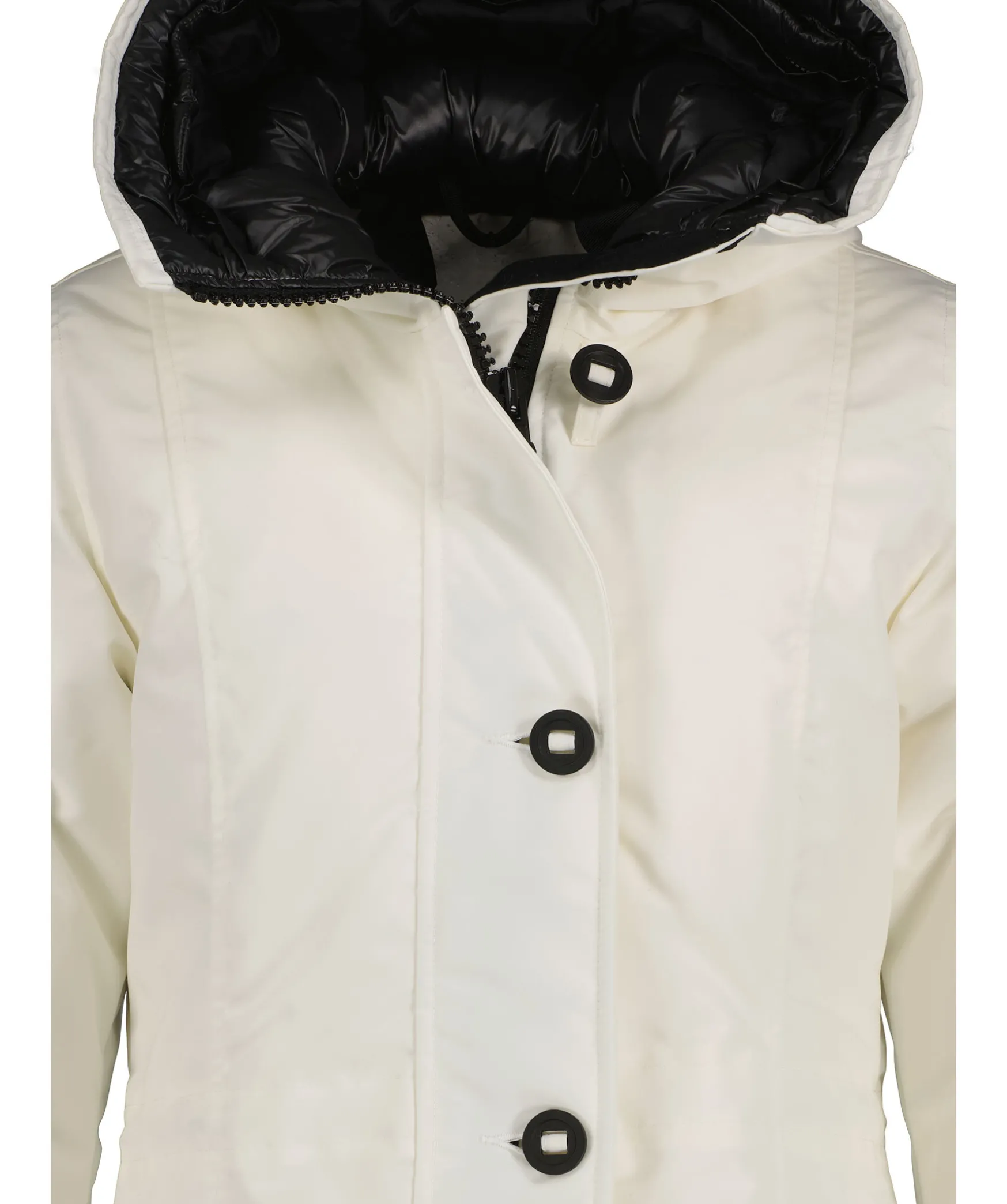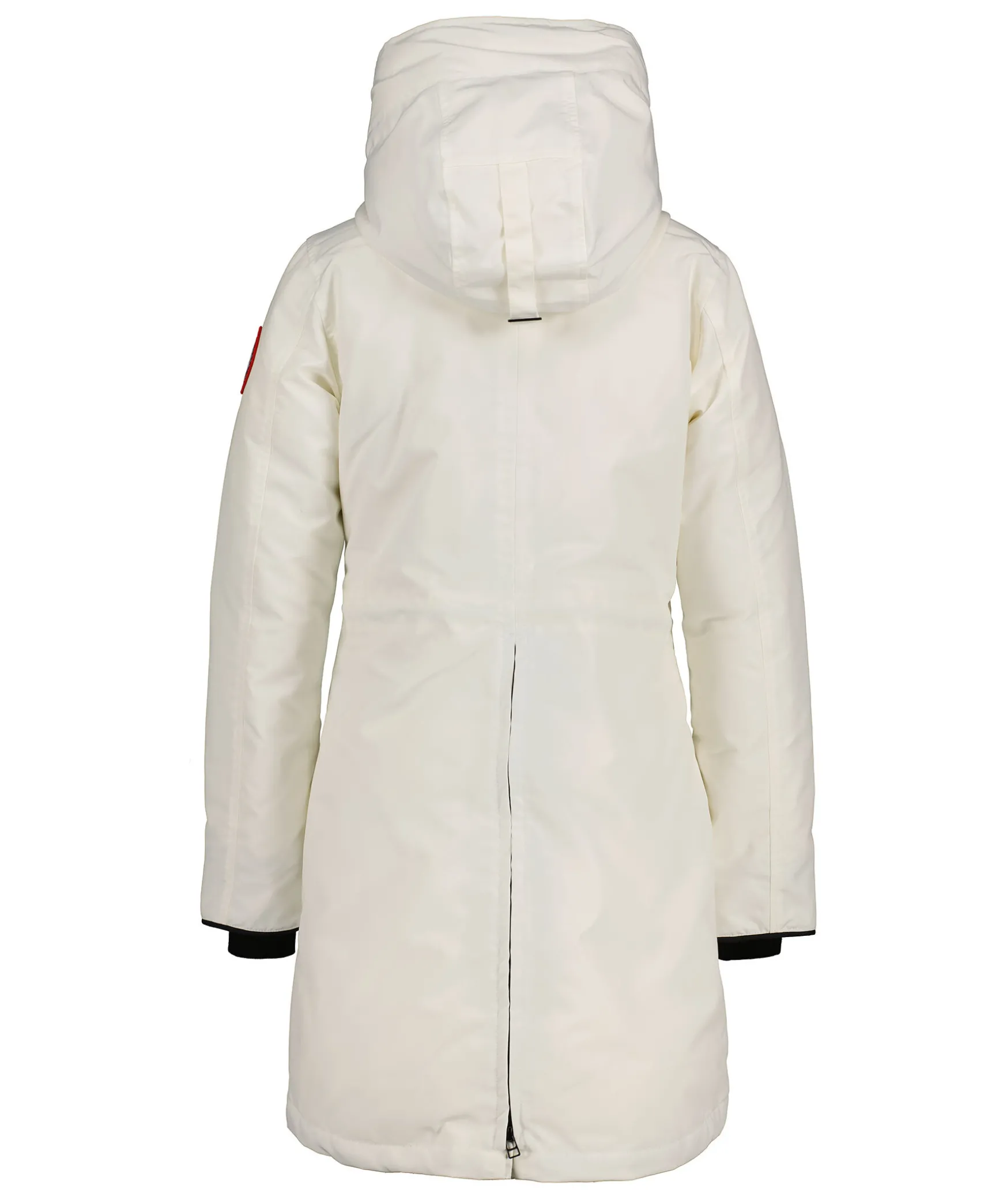 Vit Dunjacka Fran Canada Goose. Medellang Jacka Med Hog Krage Och Fast Huva. Jackan Har Elastiska Band Pa Insidan Som Kan Sattas Over Axlarna Och Lata Jackan Hanga Fritt Om Man Vill Ha Den Oppen. Stangs Med Tvavagsdragkedja Och Knappar. Tva Snedstallda Frontfickor Med Ficklock Och Tryckknappar Samt Tva Innerfickor. Ribbstickad Mudd. Klassiskt Canada Goose Marke Pa Vanster Arm.