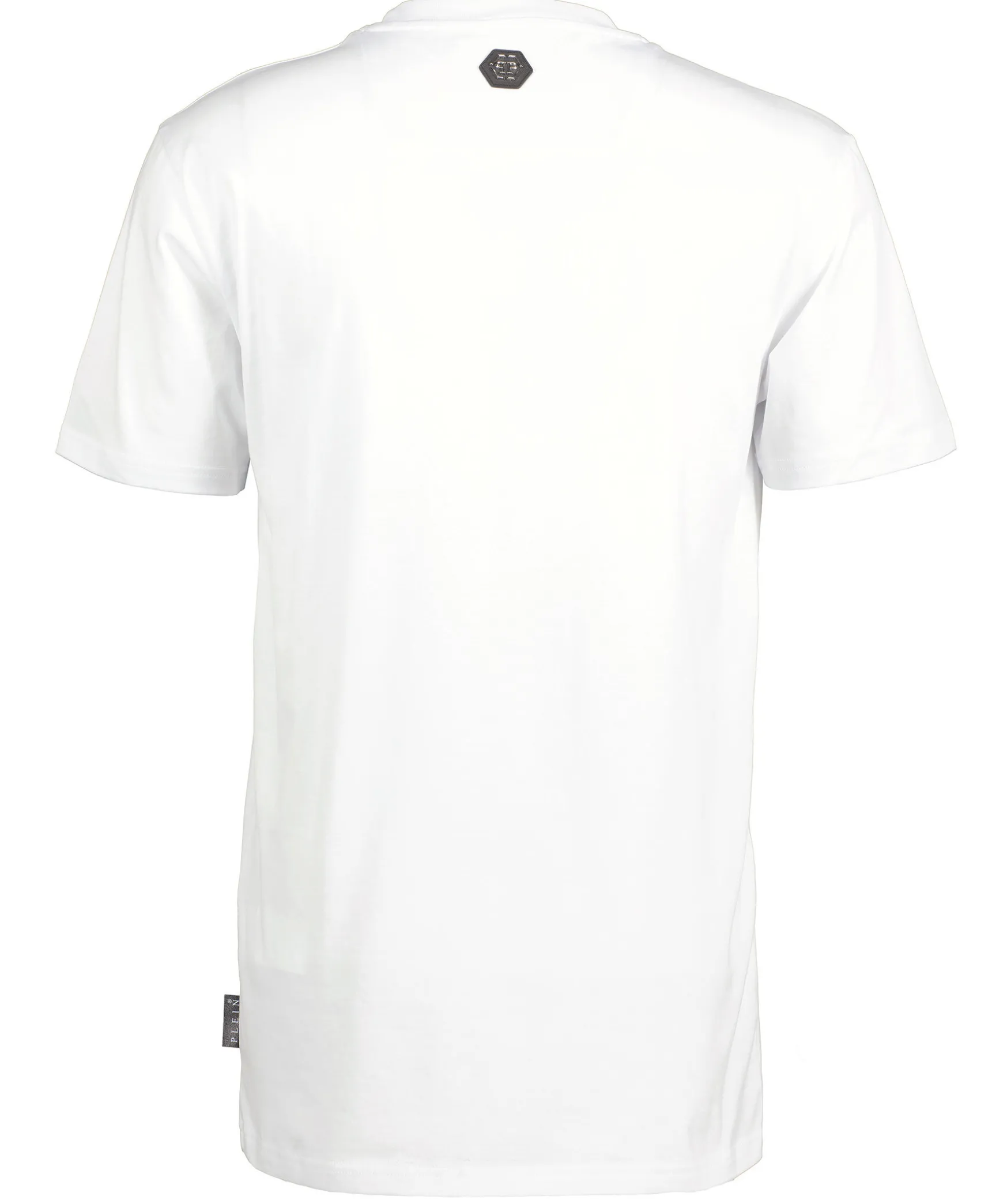 Vit T-Shirt Fran Philipp Plein Med Multifargat Tryck Pa Magen. Tillverkad I 100% Bomull. Rundad Halsringning Med Ribbstickad Mudd. Svart Patch Med Logotyp I Metall.