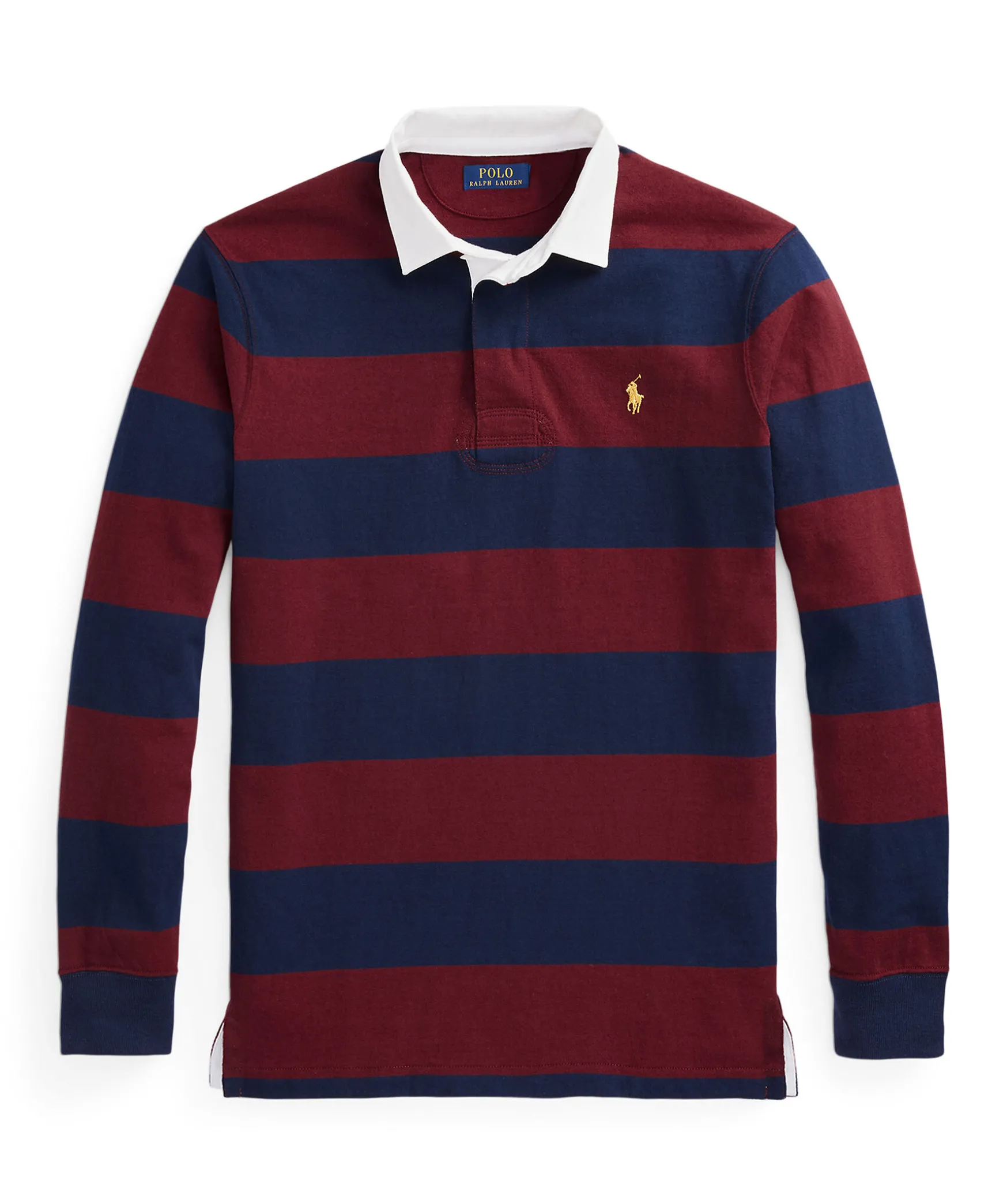 Randig Rugbytroja I Vinrott Och Marinblatt Fran Polo Ralph Lauren. Broderad Polo-Logotyp Pa Brostet. Gjord I Kraftigt Bomull. Vit Krage.