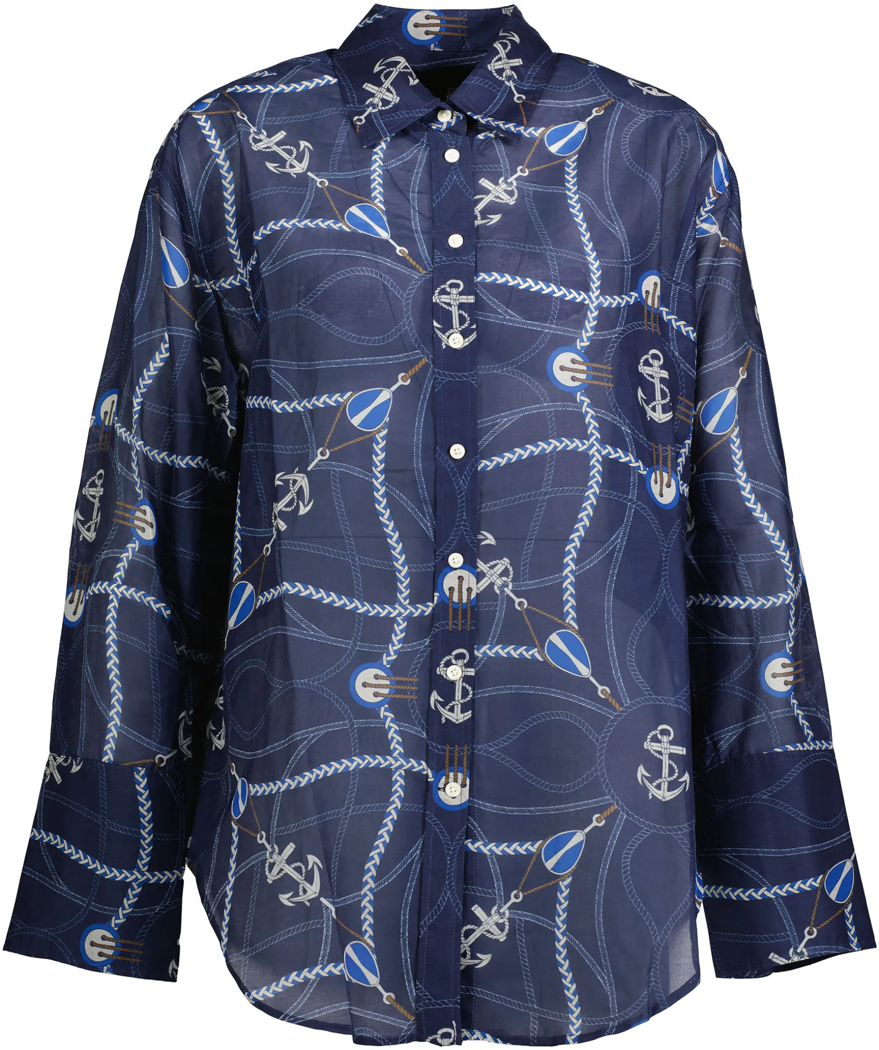 Morkbla, Monstrad Halvtransparent Skjorta Fran Gant. Breda Manschetter. Relaxed Passform. Boxpleat Och Locker Loop. Tillverkad I Bomull Och Silkesblandning.
