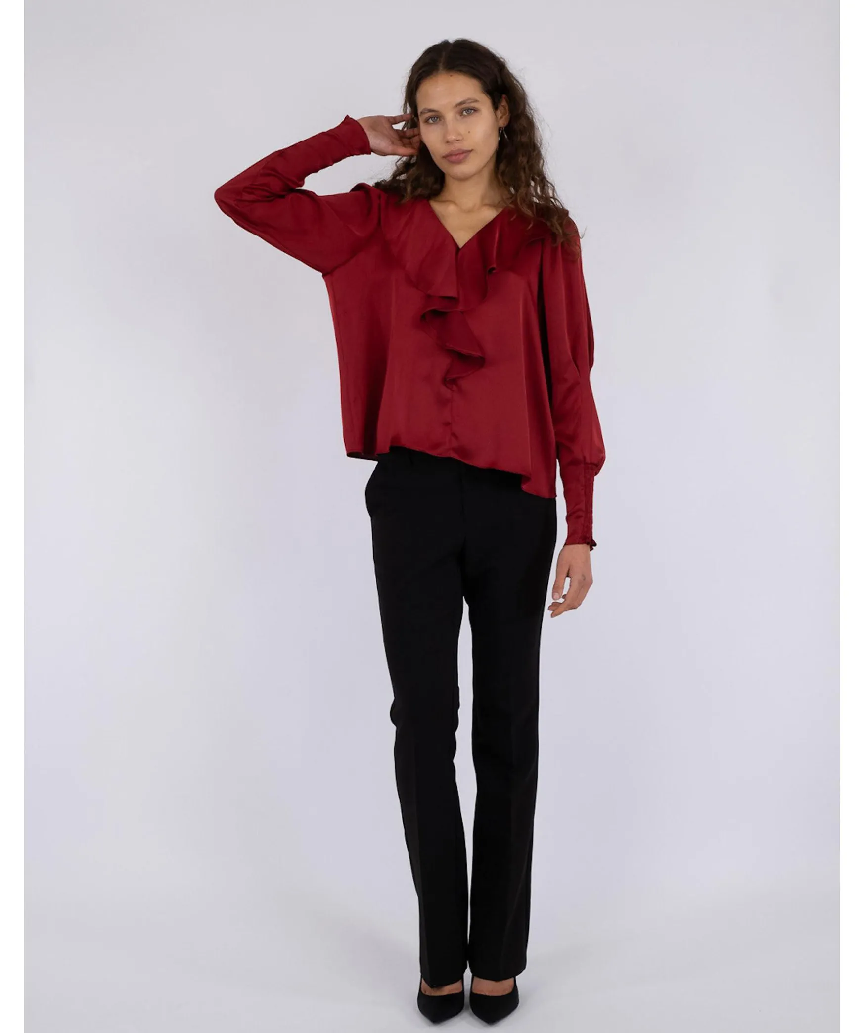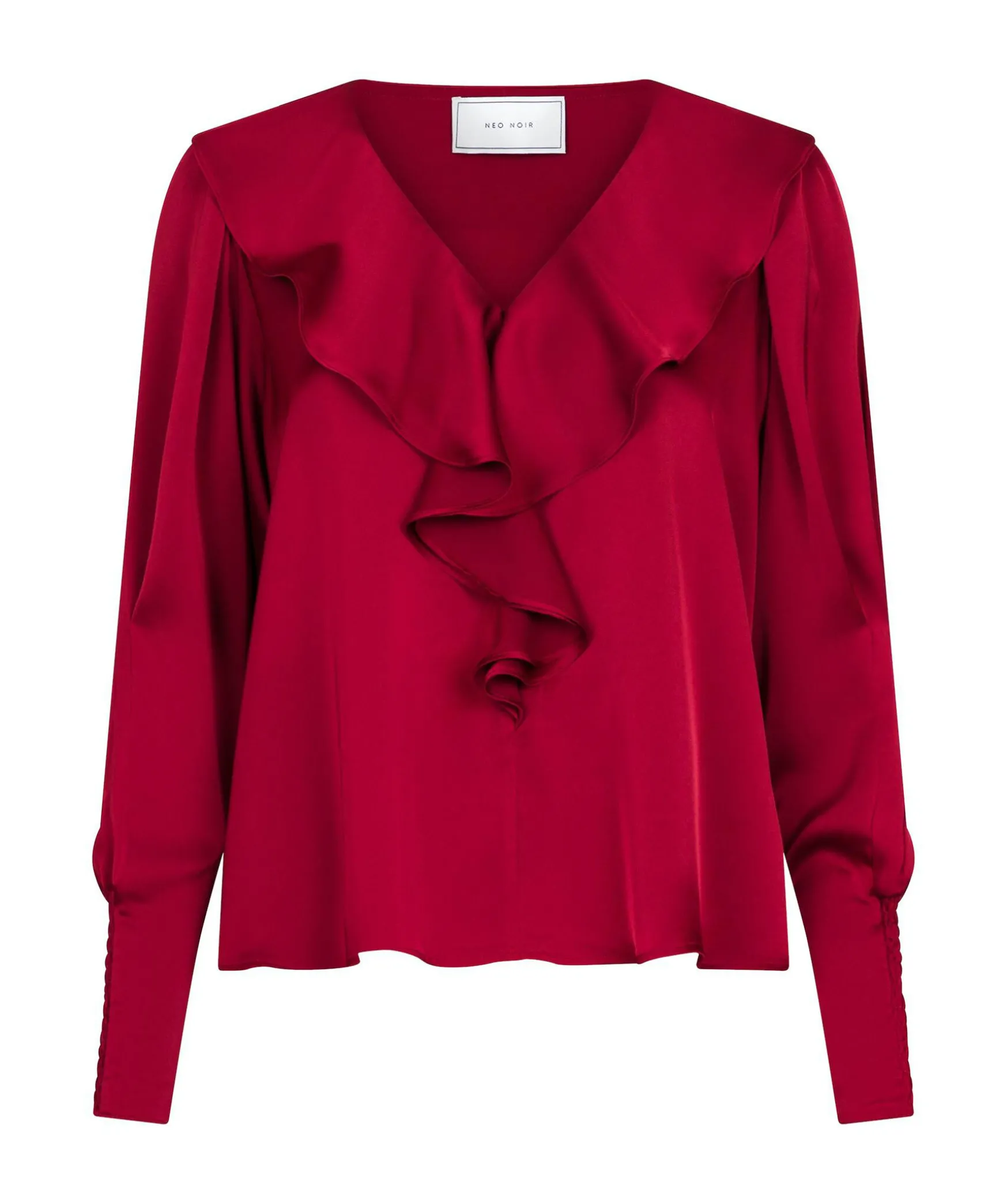 Vinrod, Feminin Blus Fran Neo Noir. Blusen Har Volangkrage Och V-Ringning Och Ar Tillverkad I Mjuk Satin. Armsluten Ar Forsedda Med En Mjuk Smock.