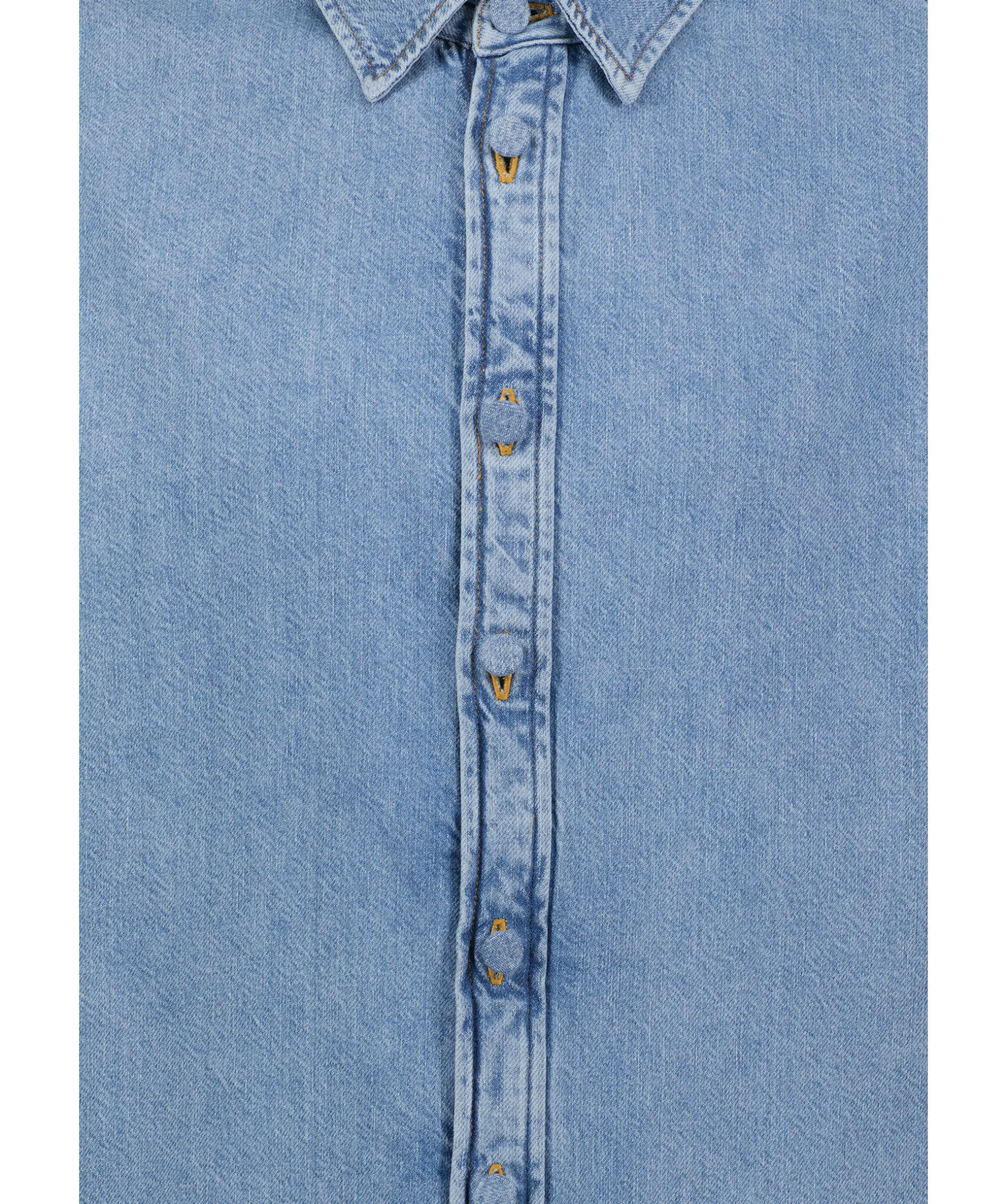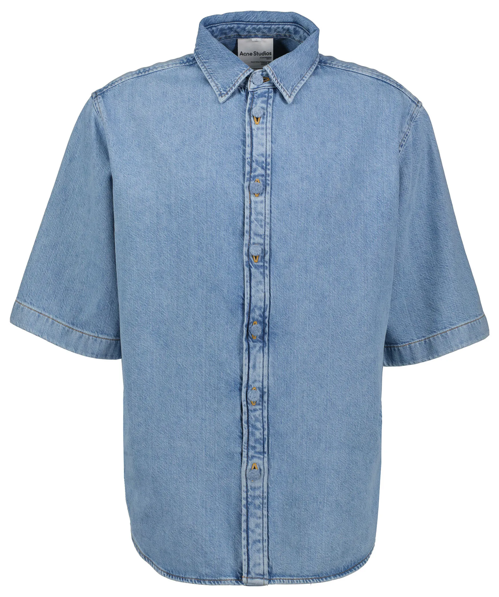 Ljusbla Kortarmad Jeansskjorta Fran Acne Studios. Stangs Framtill Med Jeansbekladda Knappar. Spetsig Krage. Oversized Passform. Fickor I Sidorna. Rosa Ogla Med Logotyp I Nacken. Tillverkad I 100% Bomull.