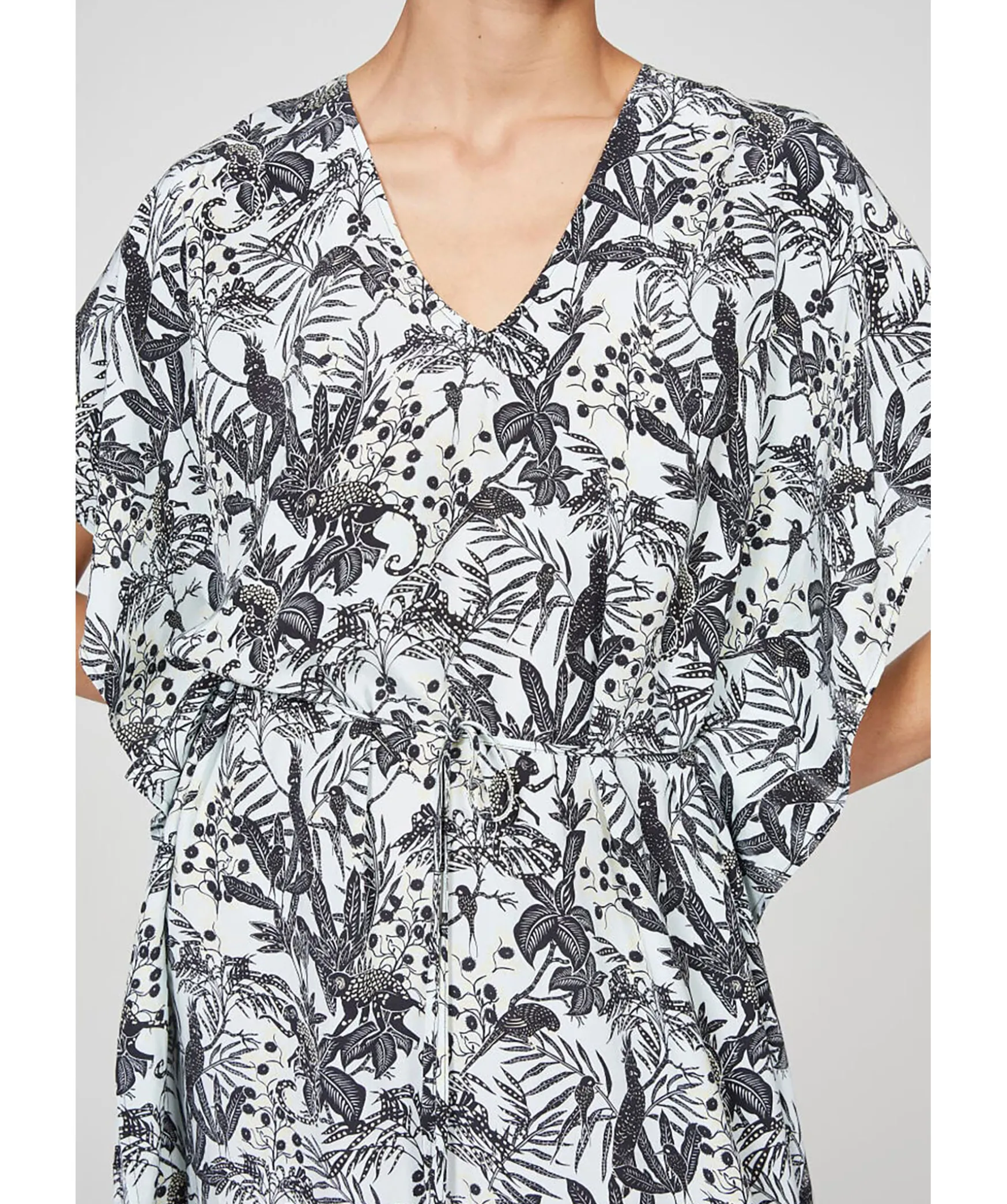 Vit Klanningstunika I Ett Svart Djungelmonster Fran Rodebjer. Tillverkad I Viskosblandning. Balte I Tunnt Skal Och Oppningar I Midjan For Smidig Rorelse. Rena Armar Och Fallkanter For En Polerad Look. Materialet Kommer Fran Hallbart Odlade Och Skotta Skogar.