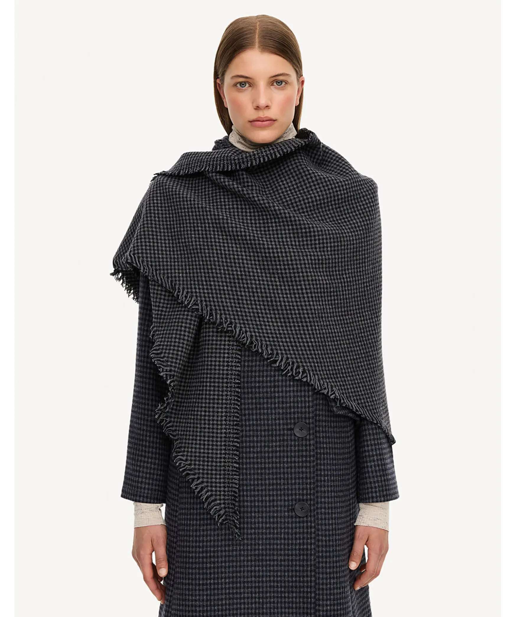 Hundtandsmonstrad Scarf I Gratt Och Svart Fran By Malene Birger. Gjord I En Mjuk Vav Av Ull. Triangel Form Med Sliten Fall. Matt: 240 X 77 Cm