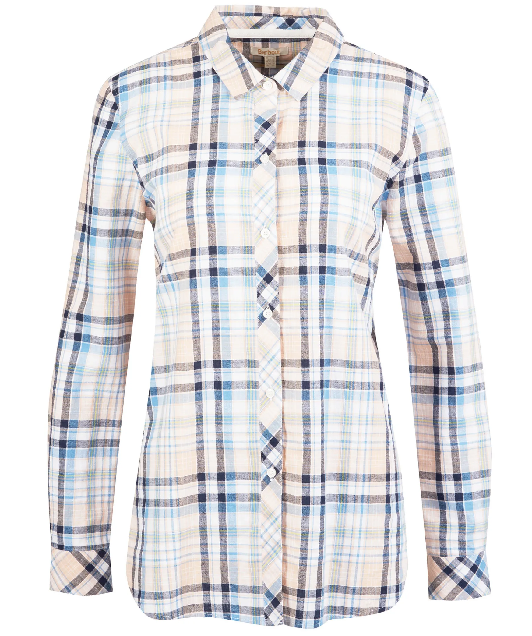 Rutig Skjorta I Beige, Blatt Och Vitt Fran Barbour I En Avslappnad Passform. Nagot Langre Baktill, En Brostficka Och Langa Armar Med Tva Knappar I Armslut. Gjord I En Luftig Blandning Av Bomull Och Lin Och Har Vita Knappar Hela Vagen Fram. Liten Bricka Fastsydd I Metall I Nacken Med Graverad Logotyp.