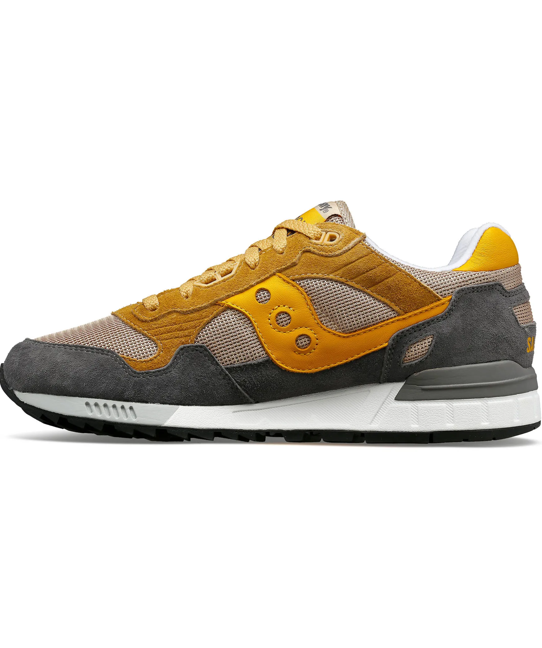 Graa Och Gula Sneakers Fran Saucony. En Retroinspirerad Sneaker Som Varumarket Skapade Pa 80-Talet Tillverkad I Mocka Och Har En Mjuk Och Flexibel Sula Som Ger Hog Komfort Och Dampning. Beigea Och Gula Detaljer Med Beigea Skosnoren. Skorna Ar Sma I Storlek, Vi Rekommenderar Att Ga Upp En Storlek.