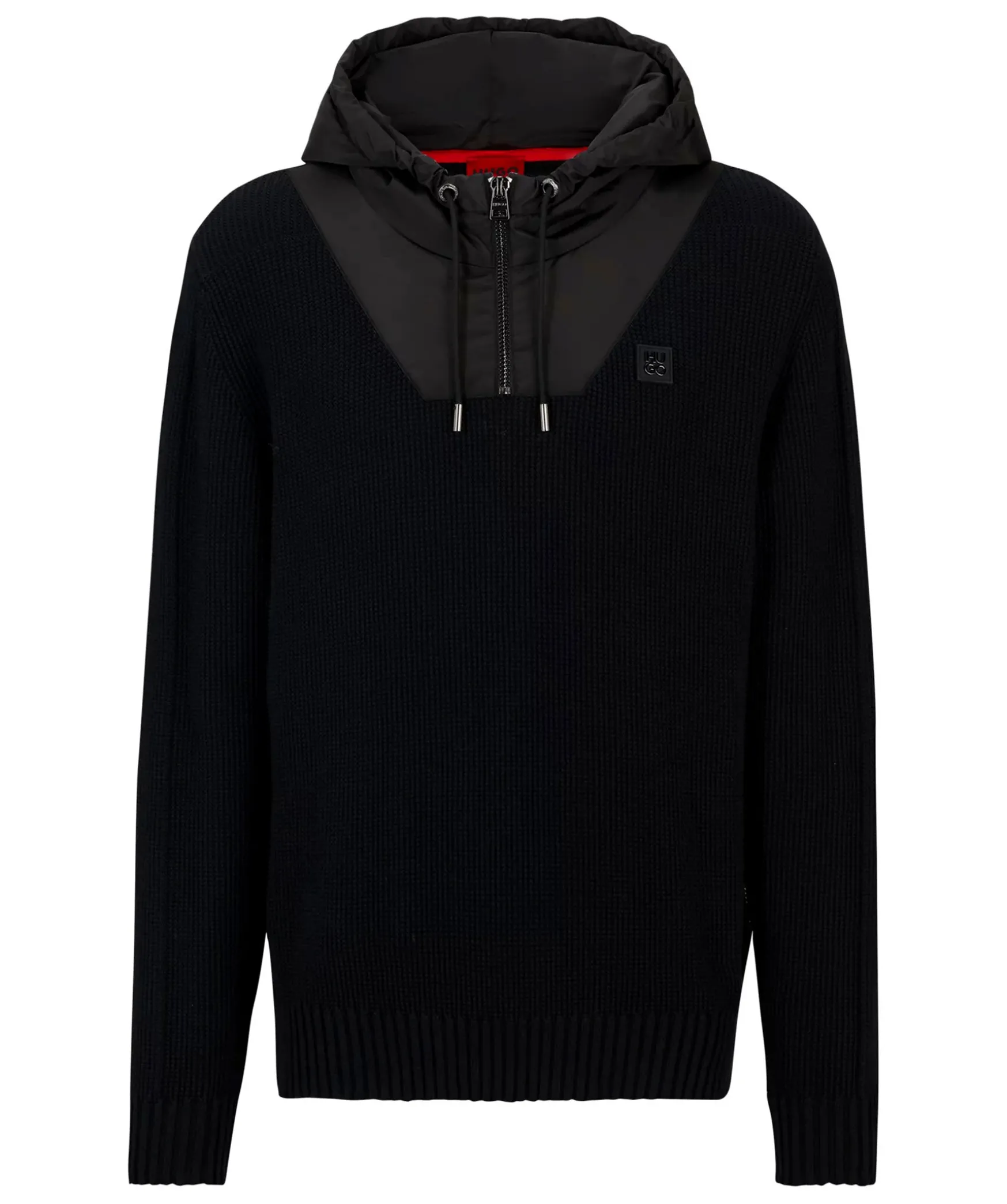 Svart, Ribbstickad Hoodie Fran Hugo I Relaxed Fit. Huvtrojan Har Blixtlas Framtill. Tillverkad Av Blandade Material, Bland Annat Stickad Bomull. Prydd Med Logotyp Pa Brostet.