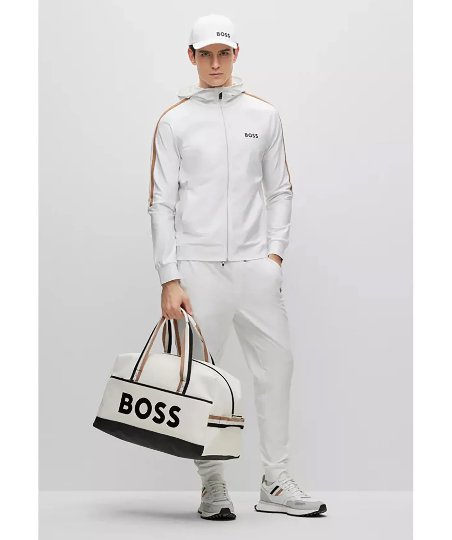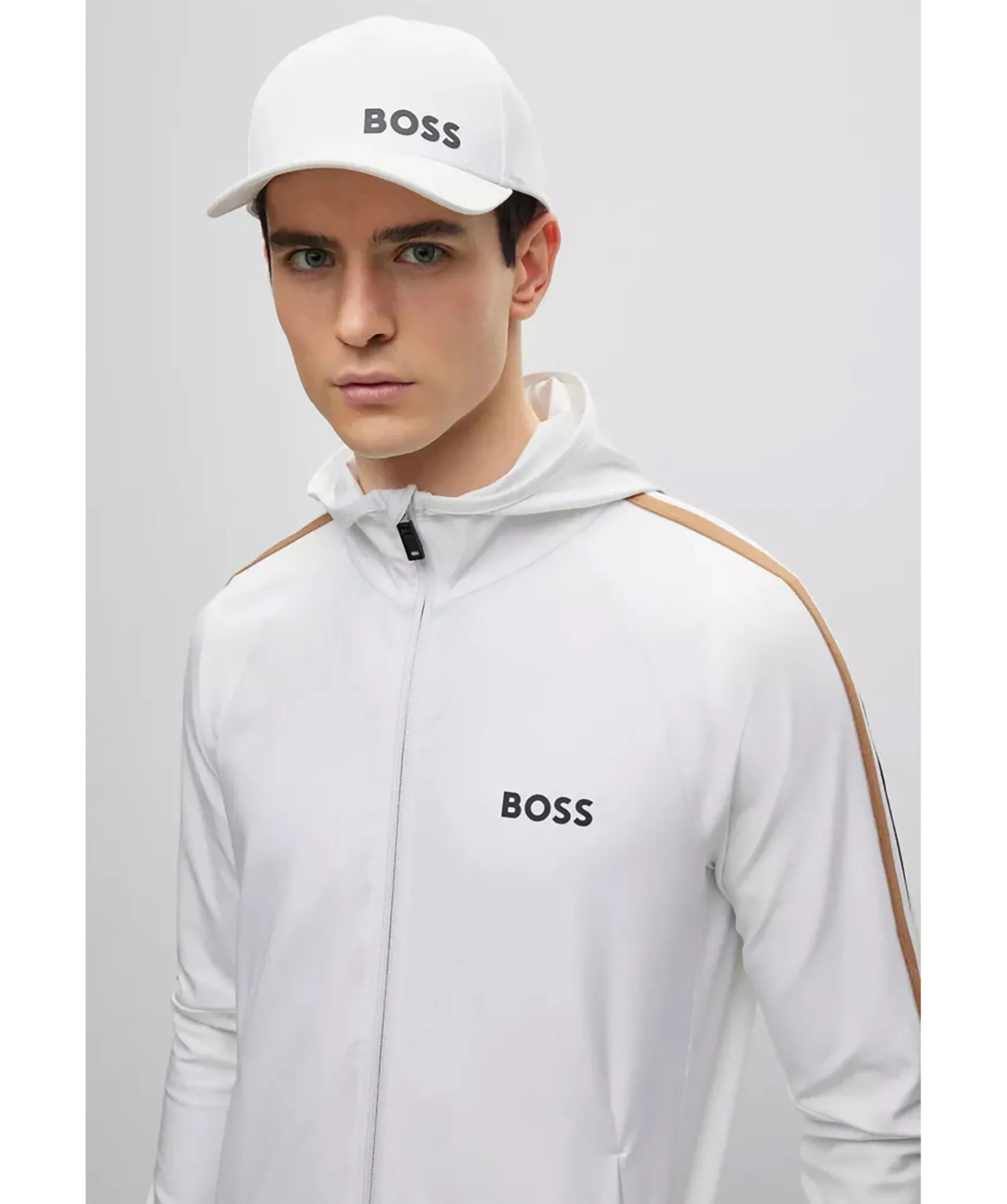 Vit Hoodie Med Dragkedja I Normal Passform I Stretchjersey Fran Boss Green. Signaturrevar Langs Axlarna Och Logotyp Pa Vanster Sida Pa Brostet. Luva Hog Krage, Sidofickor Samt Muddar I Armslut Och Plaggslut. En Del Av Den Dynamiska Kapselkollektionen Boss X Matteo Berrettini, Skapad Av Den Italienska Professionella Tennisspelaren.