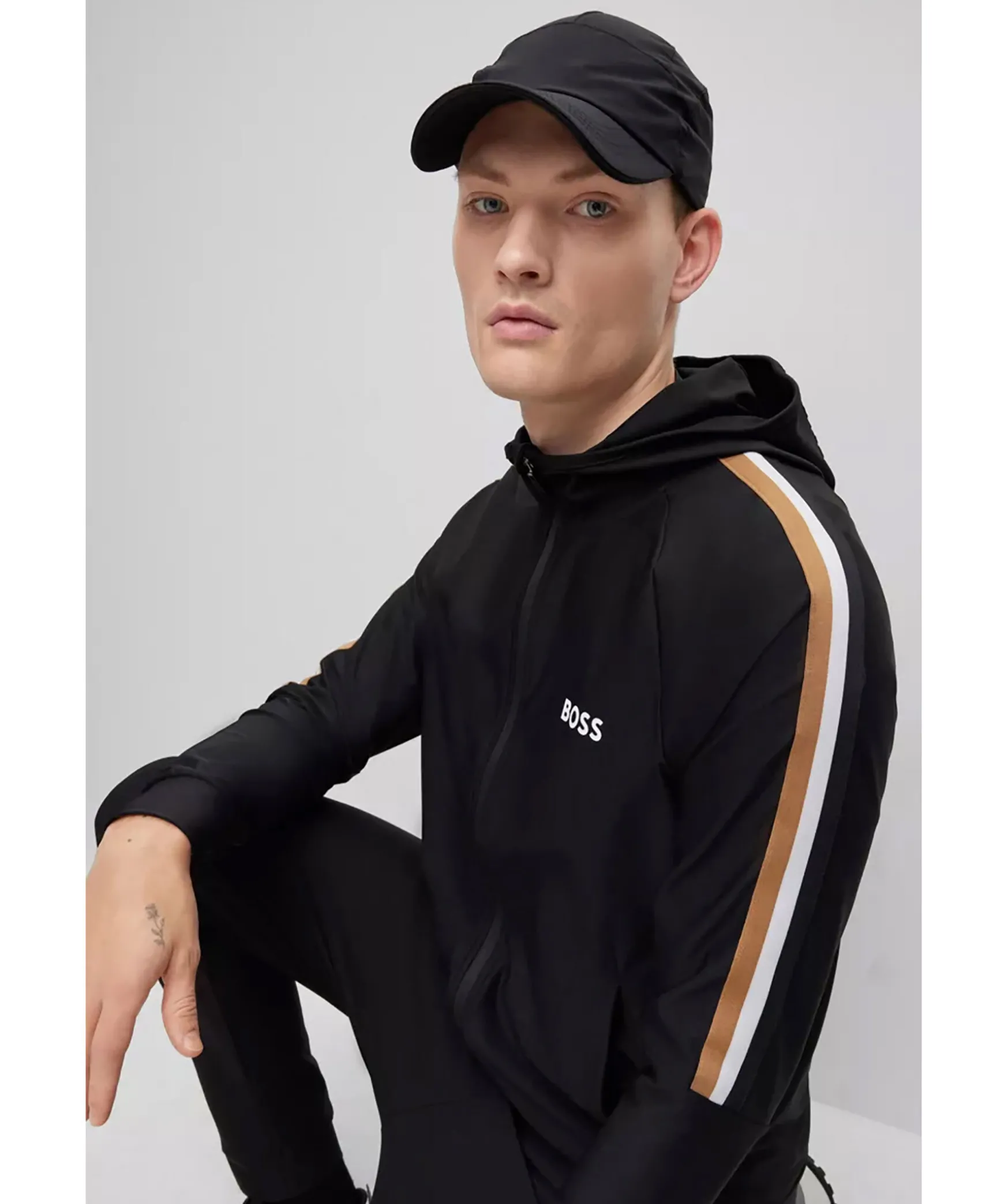 Svart Hoodie Med Dragkedja I Normal Passform I Stretchjersey Fran Boss Green. Signaturrevar Langs Axlarna Och Logotyp Pa Vanster Sida Pa Brostet. Luva Hog Krage, Sidofickor Samt Muddar I Armslut Och Plaggslut. En Del Av Den Dynamiska Kapselkollektionen Boss X Matteo Berrettini, Skapad Av Den Italienska Professionella Tennisspelaren.