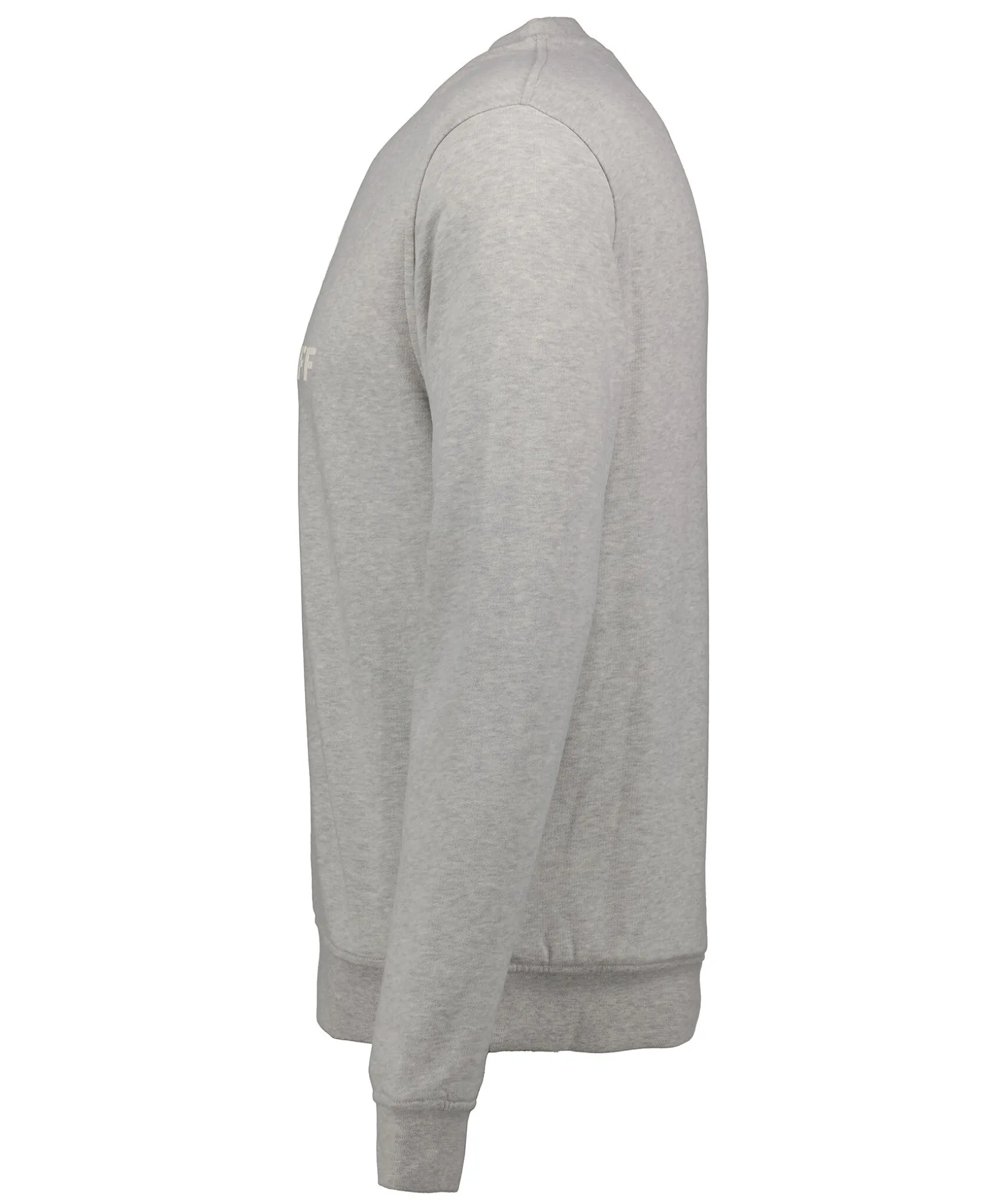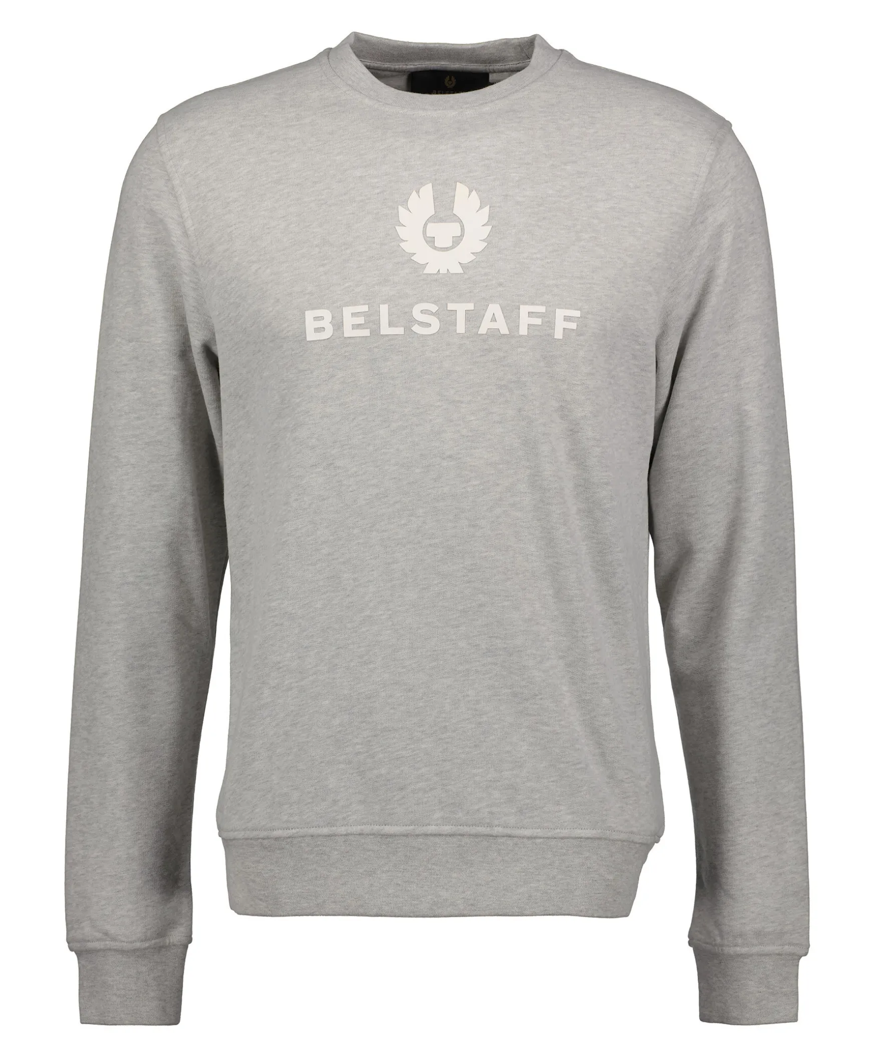 Ljusgra Sweatshirt Fran Belstaff. Vit Gummerad Logotyp Over Brostet. Ribbstickad Mudd Vid Halsringningen, Arm- Och Plaggslut. Tillverkad I Bomull.