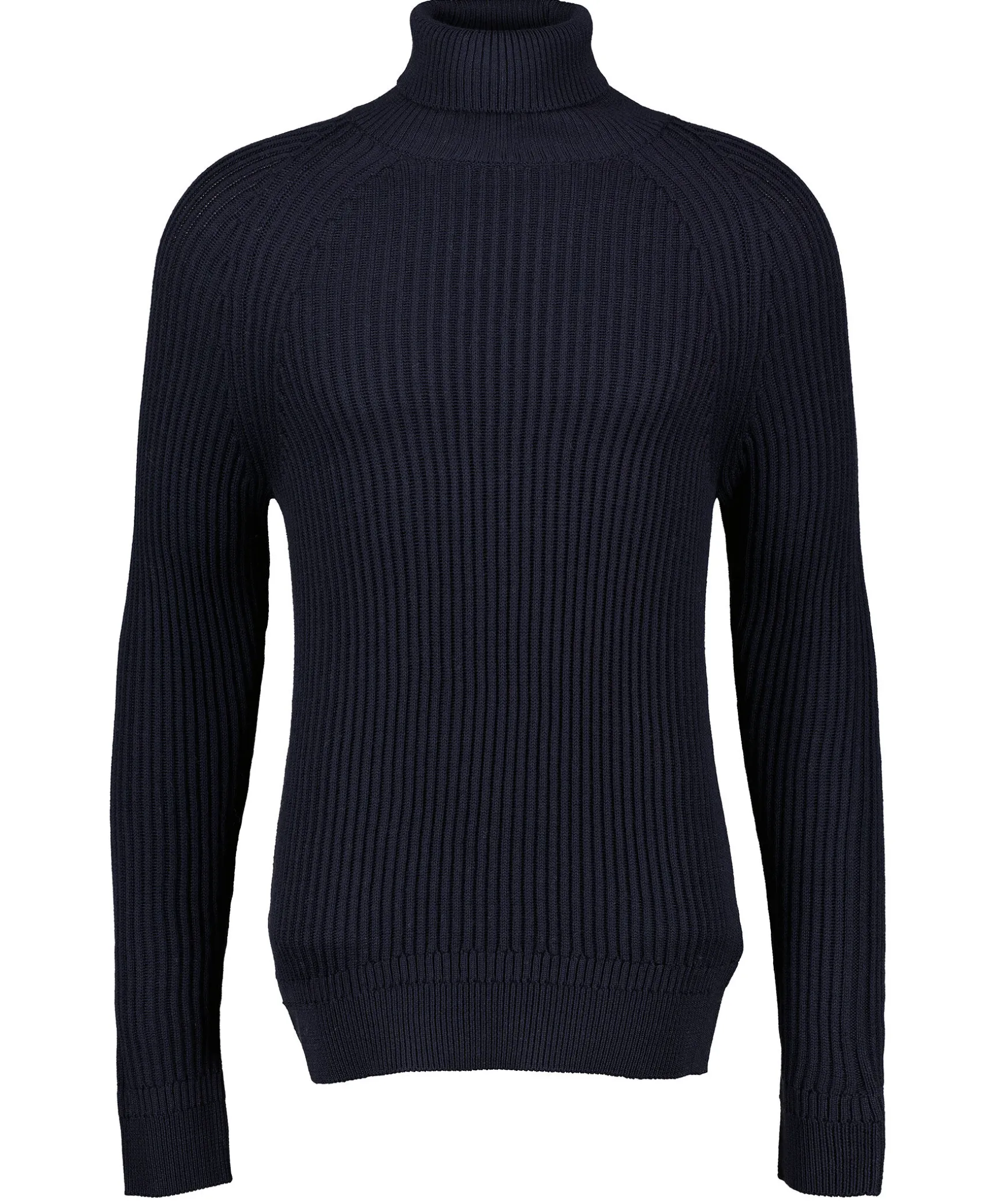 Morkbla Melerad Ribbstickad Polotroja Fran Zanone. Ribbstickad Krage, Mudd Vid Arm- Och Plaggslut. Tillverkad I 100% Virgin Wool.
