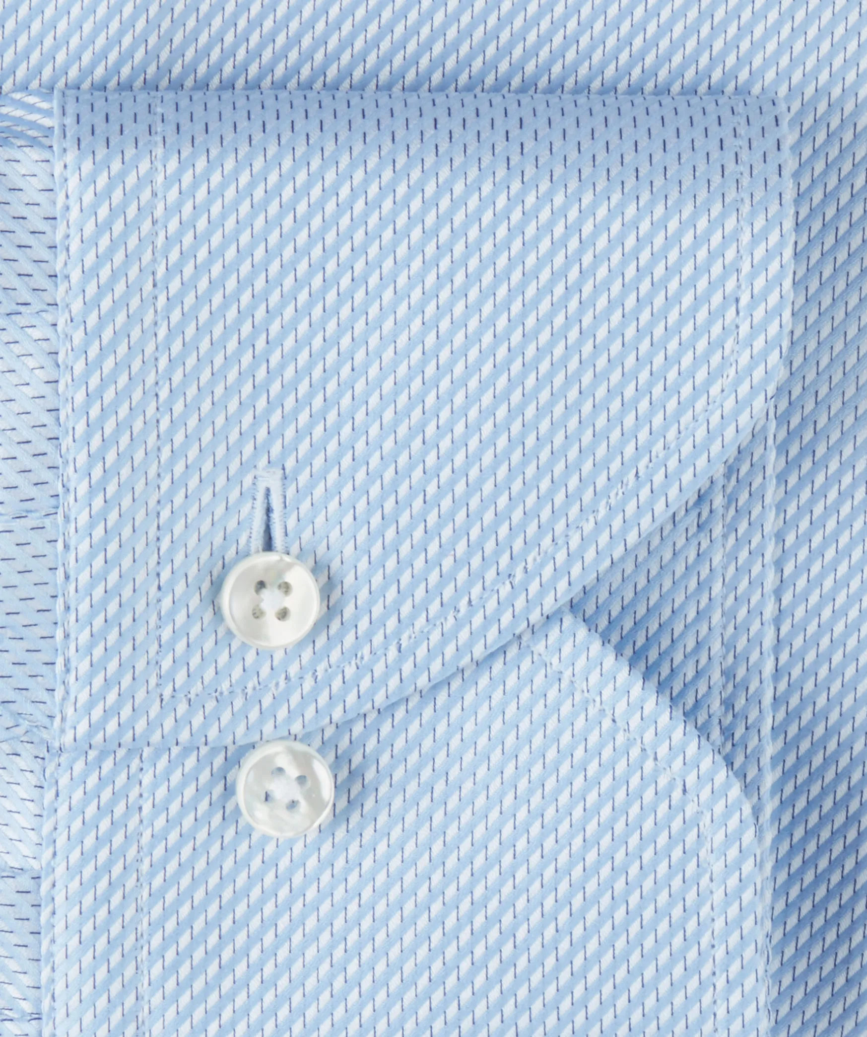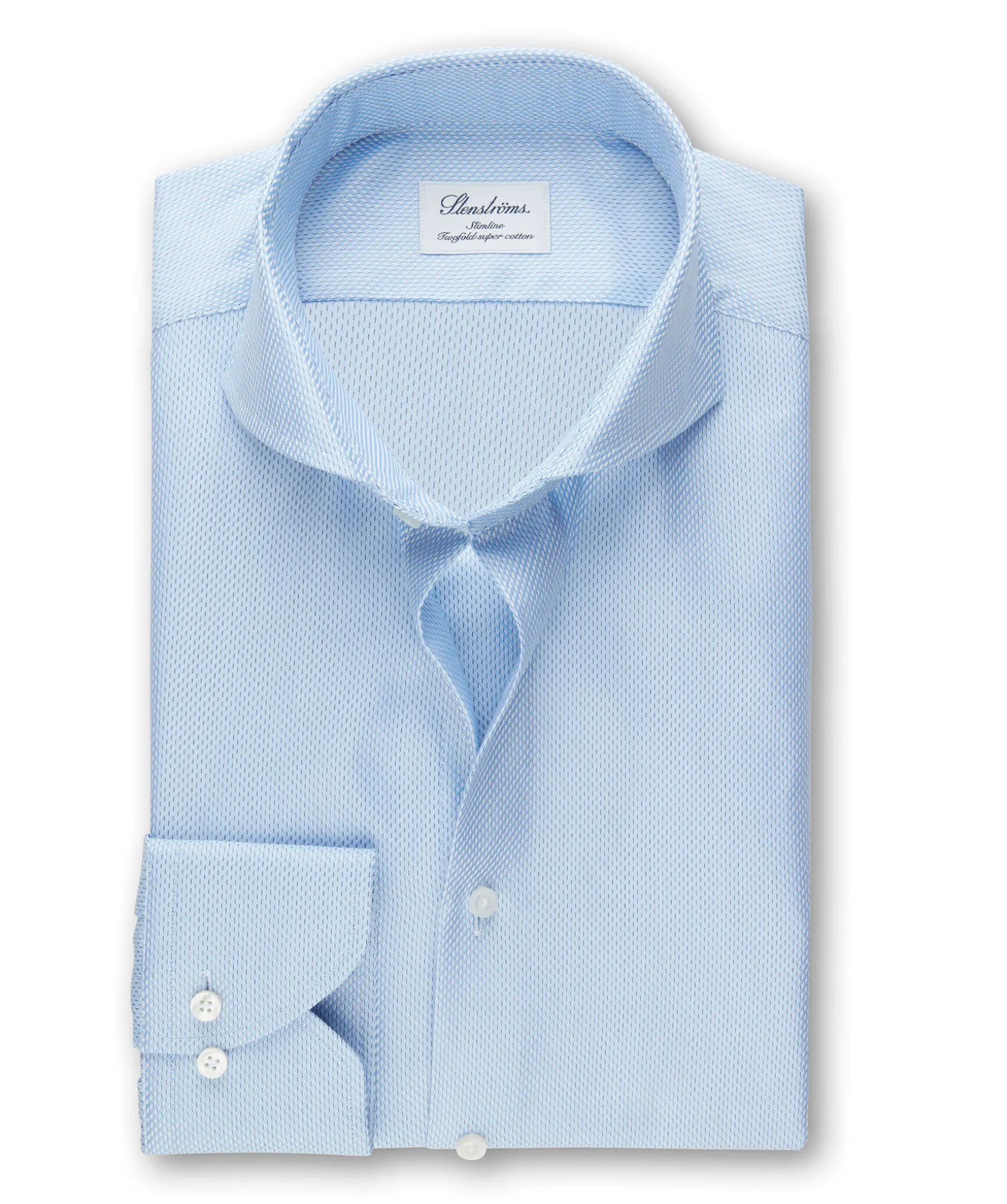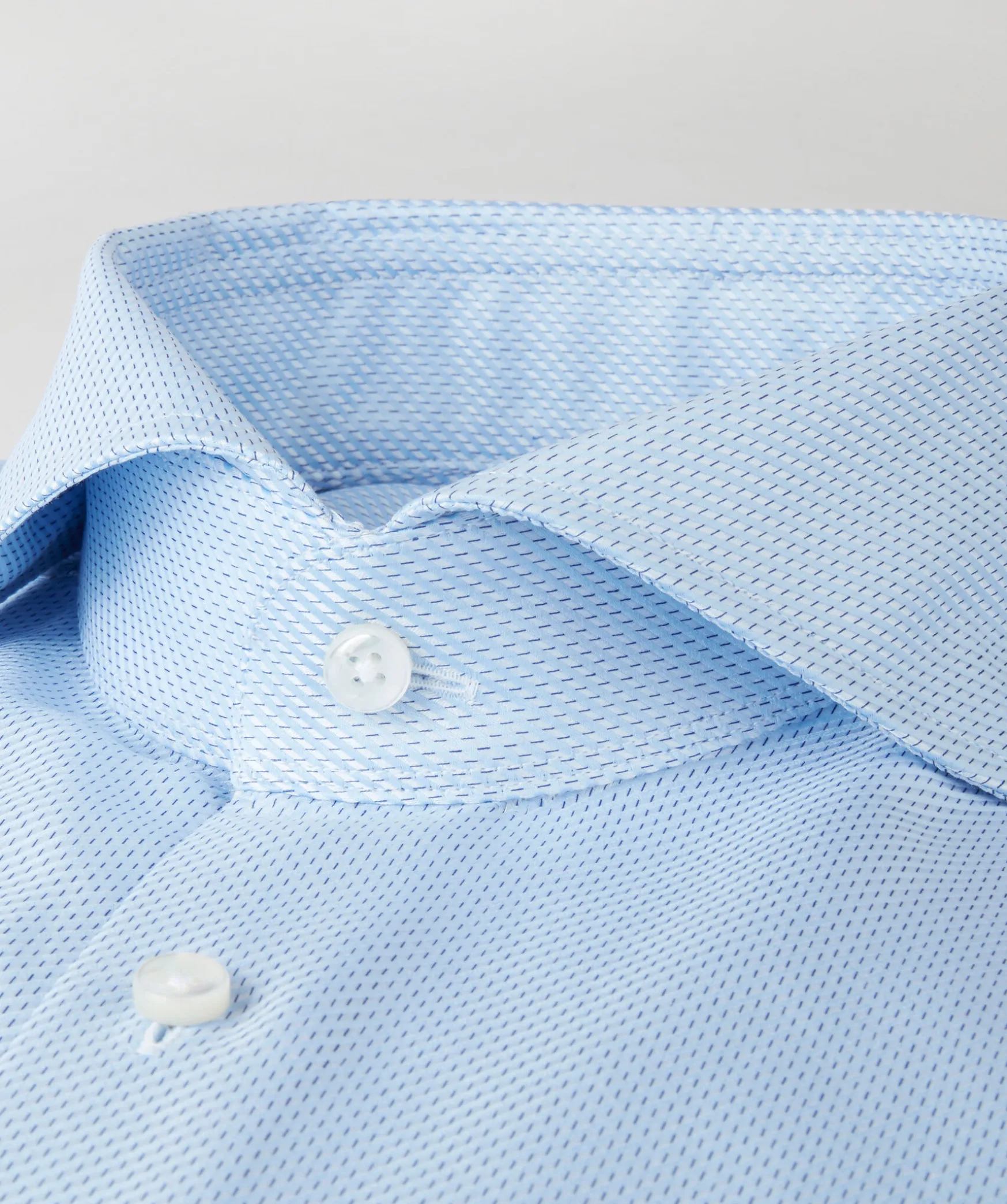 Ljusbla Slimline-Skjorta Skuren Fran Mjuk Twofold Super Cotton For En Smalare Passform. Mikromonstret Adderar En Fin Detalj Och Gor Skjortan Bade Tidlos Och Mangsidig. Enkla Manschetter, Knappar Av Parlemor Och Cut Away-Krage. Bar Den Som Den Ar Eller Under En Stickad Troja I Matchande Farg.