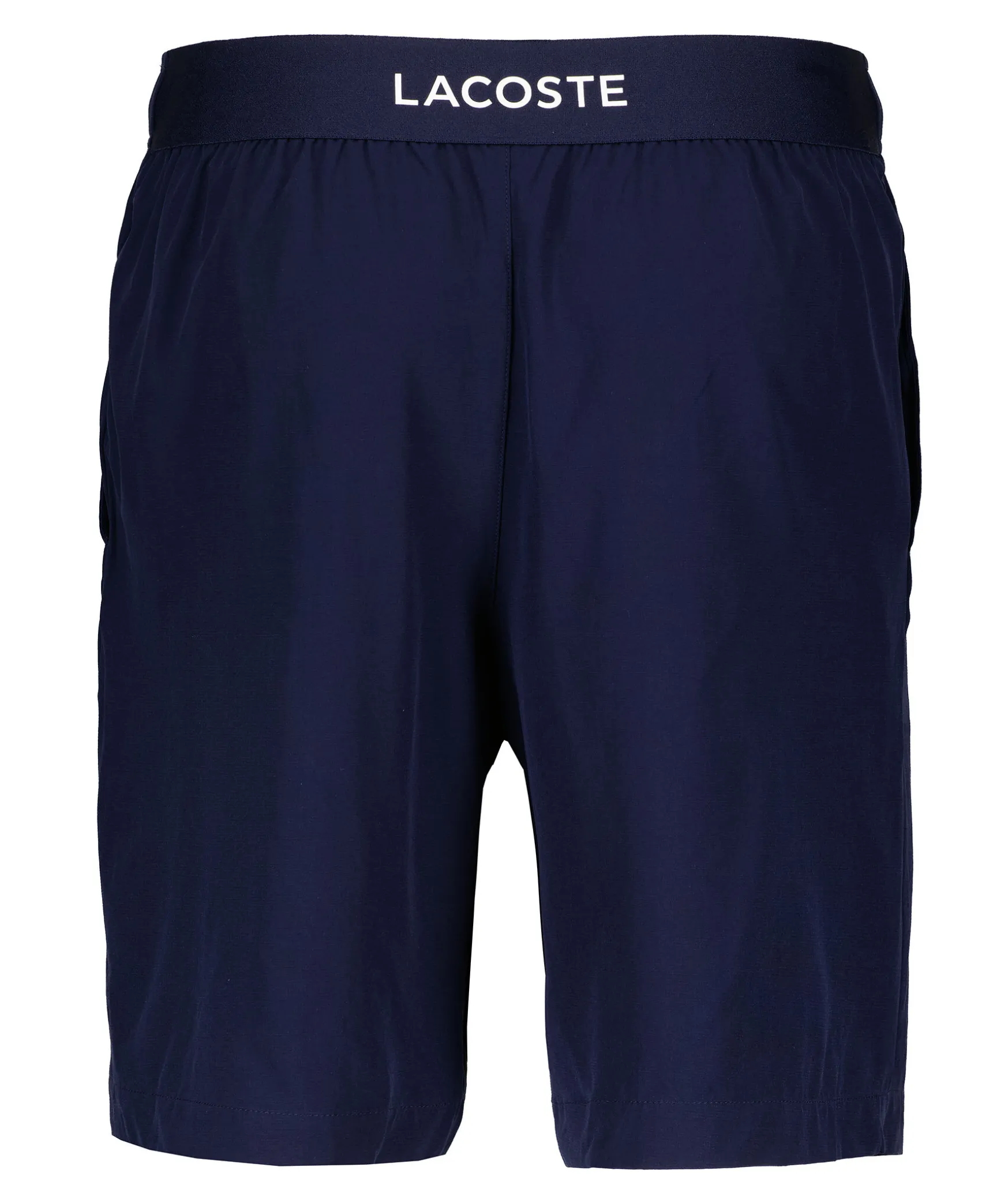 Marinblaa Shorts Fran Lacoste. Resar Och Dragsko I Midjan. Tva Fickor Framtill. Gummerad Logotyp Vid Hoger Benslut. Tryckt Logotyp Baktill Pa Resaren I Midjan.