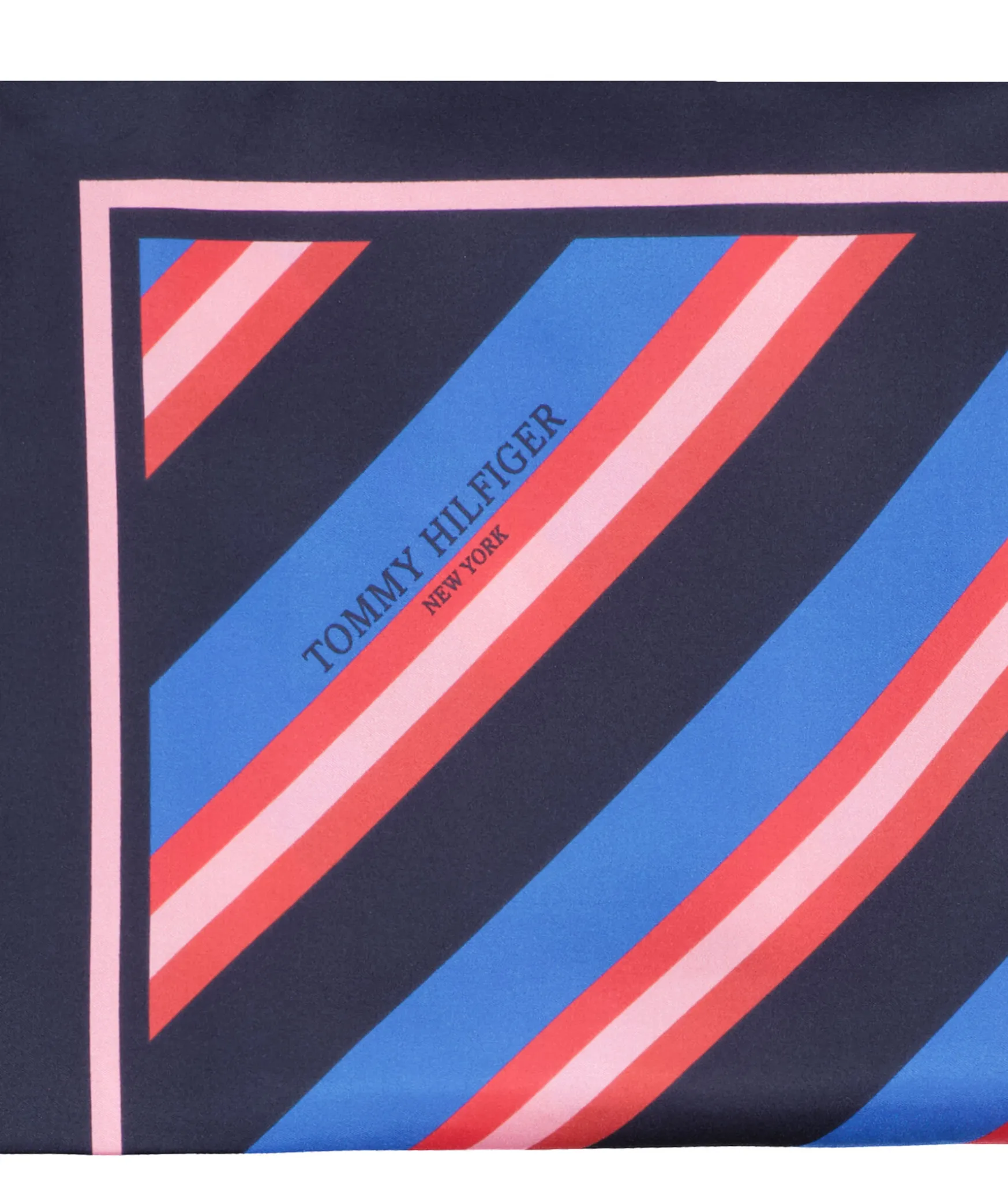 Marinbla Silkesscarf Med Randigt Monster Fran Tommy Hilfiger. Randerna Gar I Rosa, Rott, Blatt Och Marinblatt. Matt: 51 X 52 Cm. Logotyp Pa Ena Kanten.