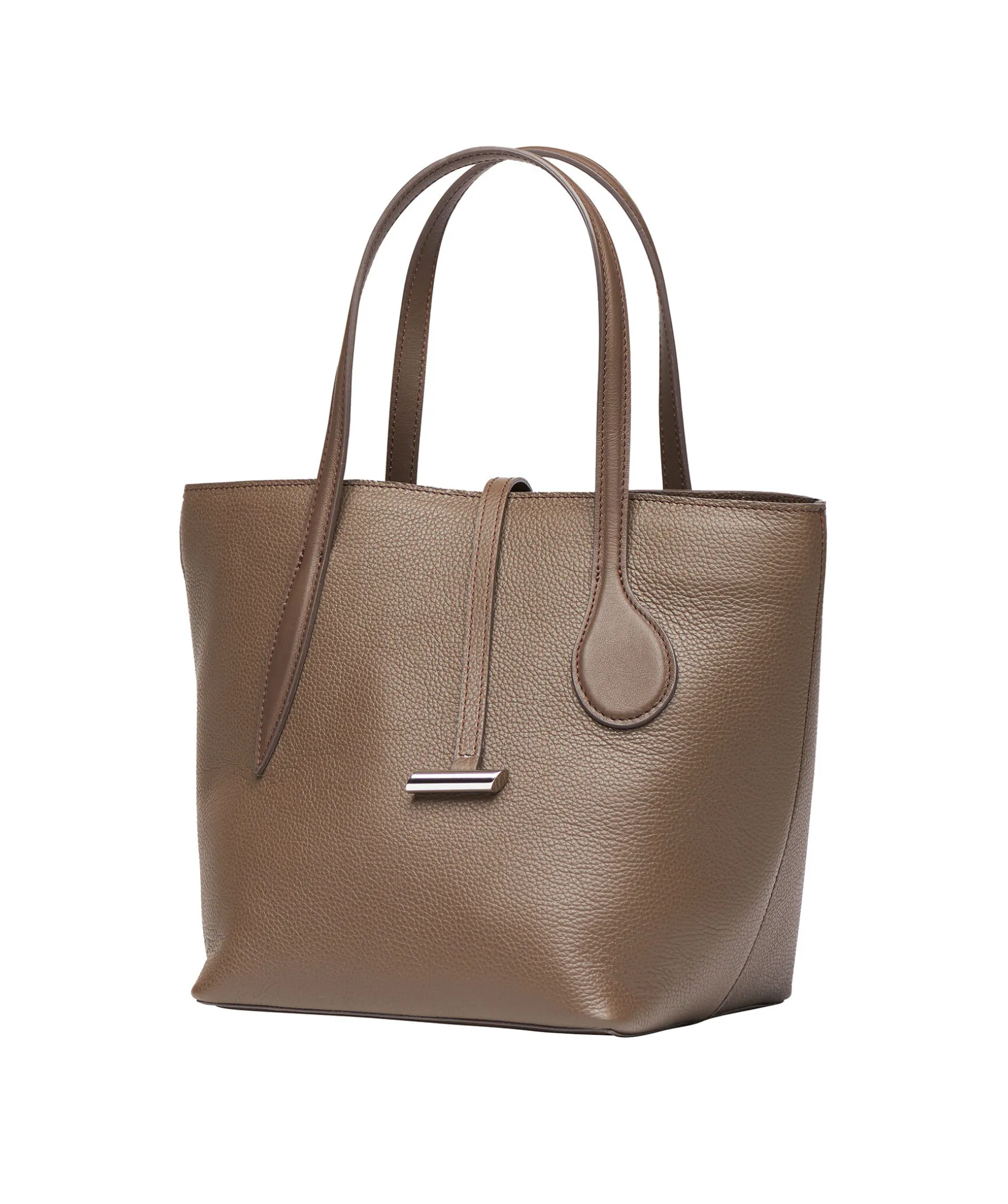 Taupefargad Handvaska Gjord I Lader Fran Little Liffner. En Liten Version Av Deras ’The Sprout Tote’. Vaskan Har Tva Handtag Och Kommer Aven Med Ett Avtagbart Axelband. Detalj I Silver Forestallande En Penne Formad Pasta Som Hanger Over Vaskan. H: 20 X B:18 (Botten) X D: 18 Cm