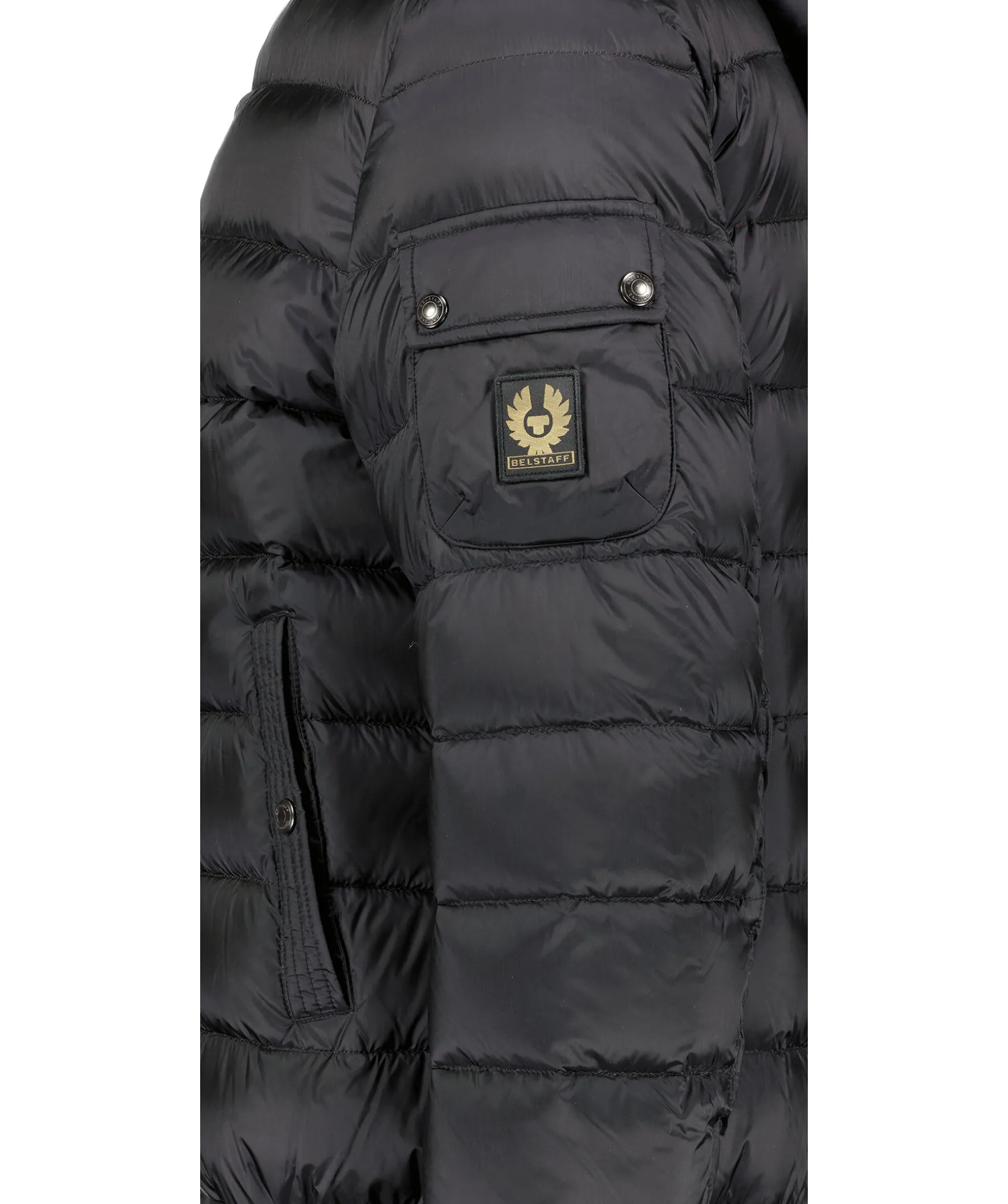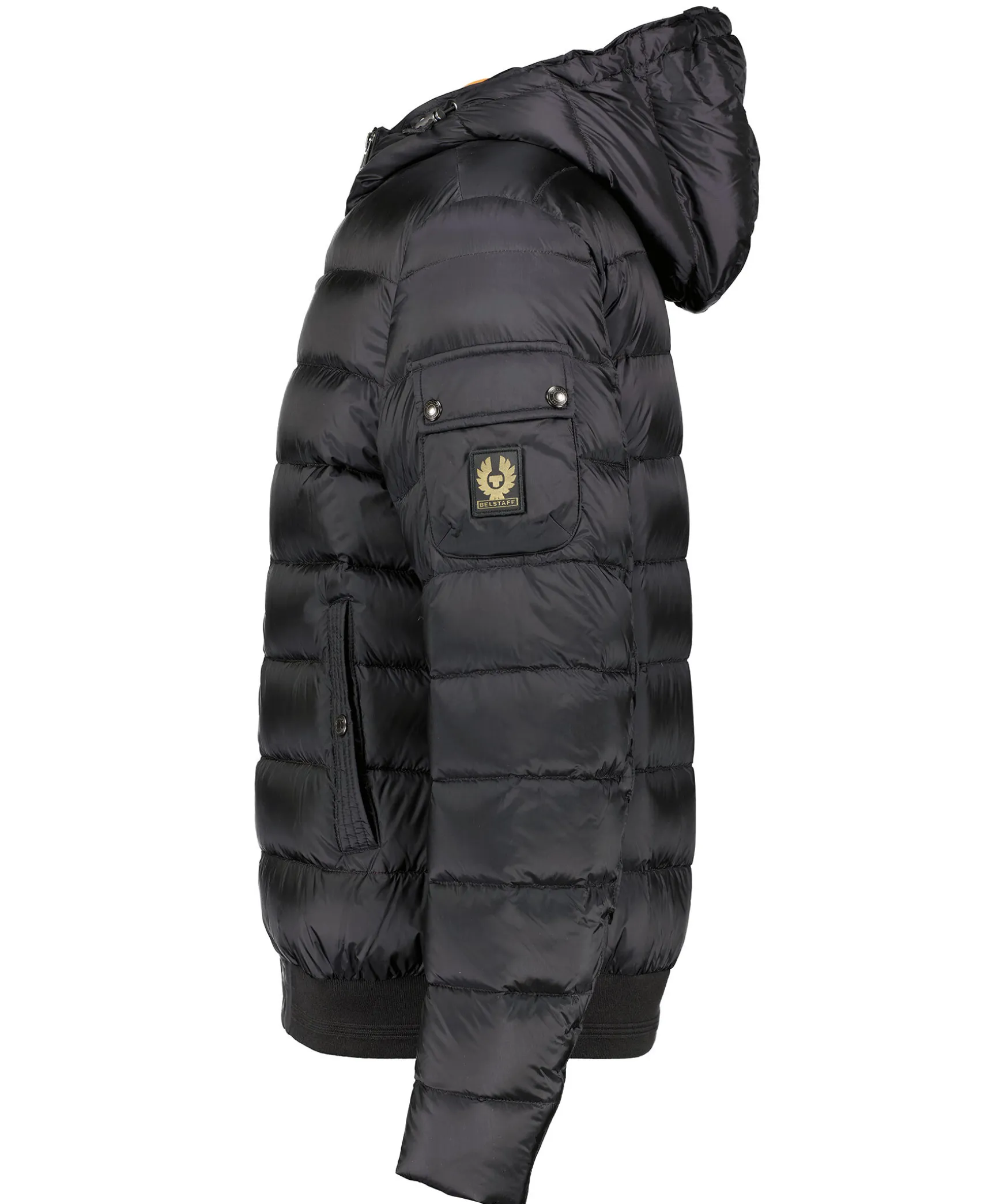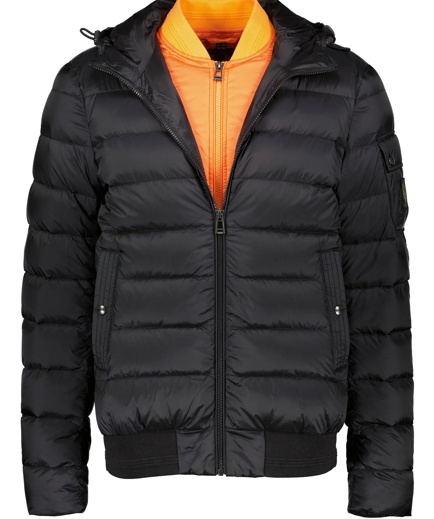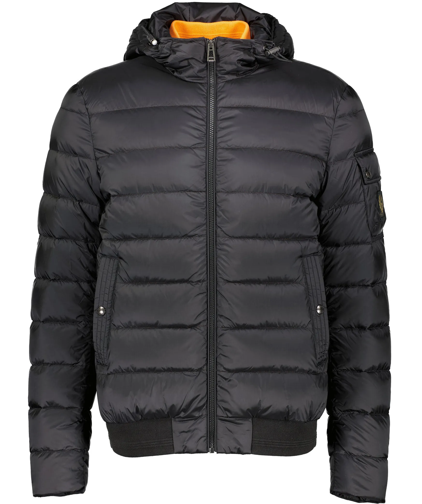 Svart Quiltad Dunjacka Fran Belstaff. Stangs Framtill Med Dragkedja. Orange Innerjacka Med Ribbstickad Krage. Luva Med Dragsko. Ficka Pa Vanster Arm Som Stangs Med Tryckknappar Och Patch Med Logotyp. Tva Fickor Framtill Som Stangs Med Tryckknapp. Ribbstickad Mudd Vid Jackslut. Innerficka Som Stangs Med Tryckknapp.