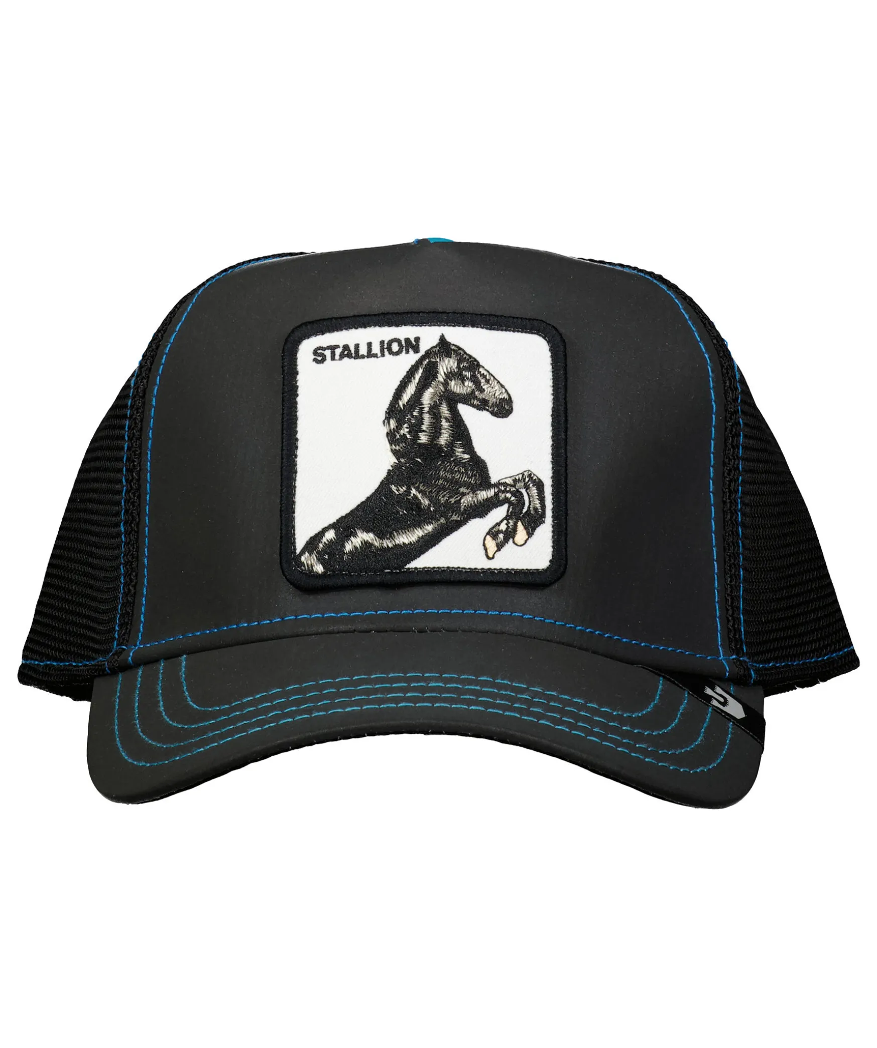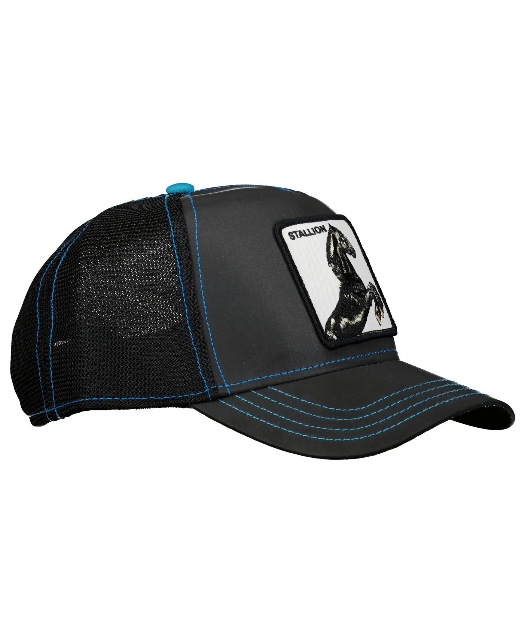 Svart Keps Med Bla Sommar Och Framsida I Reflexmaterial I Trucker-Basebollmodell Med Fyrkantig Patch Med En Hast Framtill Fran Goorin Bros. Onesize Storlek Med Ett Justerbart 4-Snap-In-Rem, Vilket Betyder Att Storleksintervallet Ar 55 Cm-61 Cm Med 58 Cm I Mitten. Ett Bomullssvettband Finns Fastsytt Pa Insidan. Tillverkad I Polyester Bak Och Polyuretan Pa Framsidan.