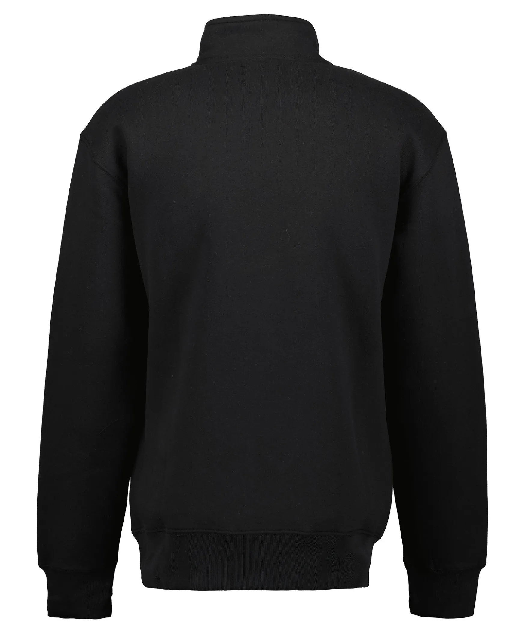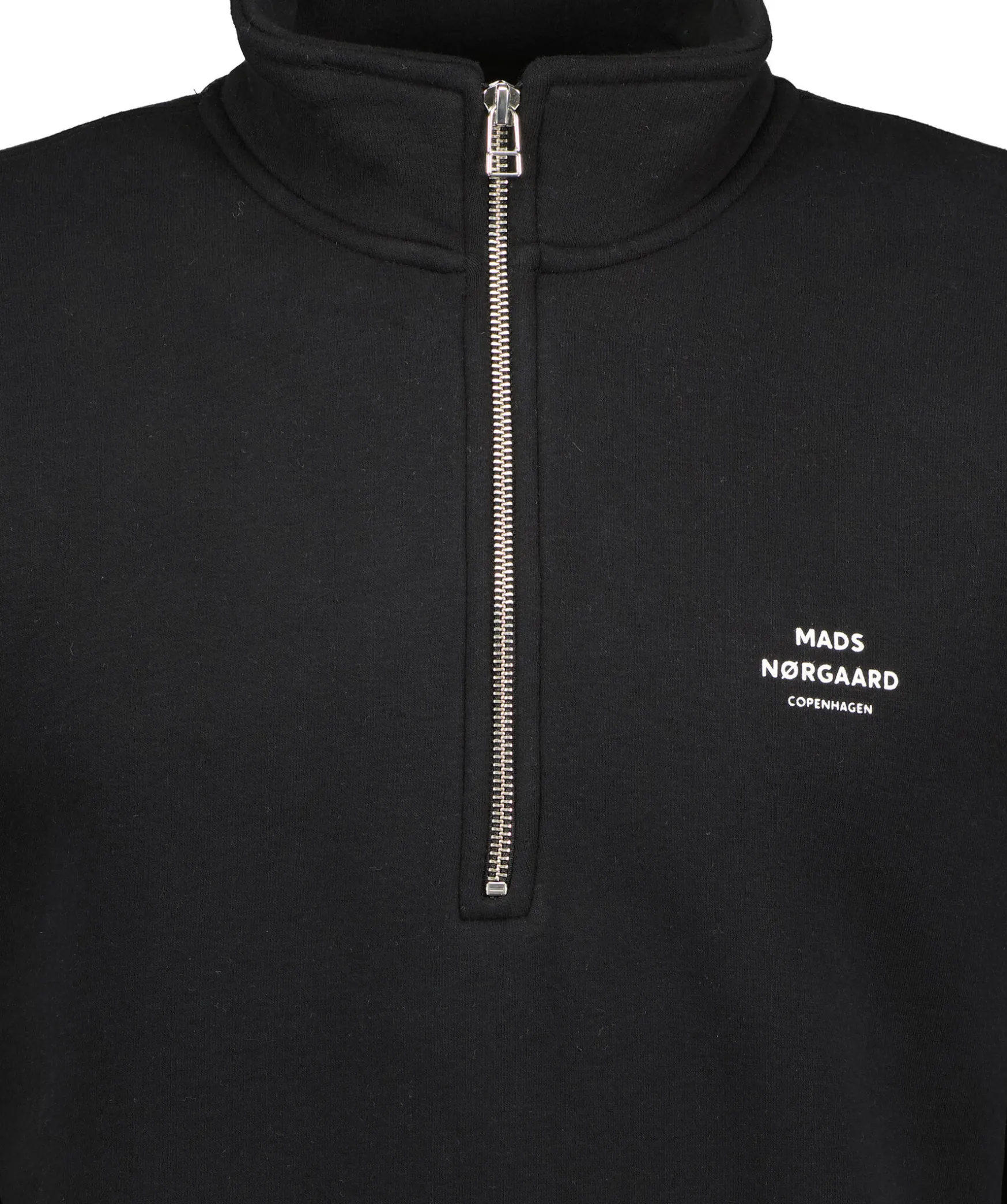 Svart Sweatshirt Med Half Zip Fran Mads Norgaard. Tillverkad Av En Bomullsblandning Och Har En Liten Vit Logotyp Pa Vanster Sida Pa Brostet. Den Har Ribbade Kanter Och Den Hoga Halsen Har En Dragkedja.