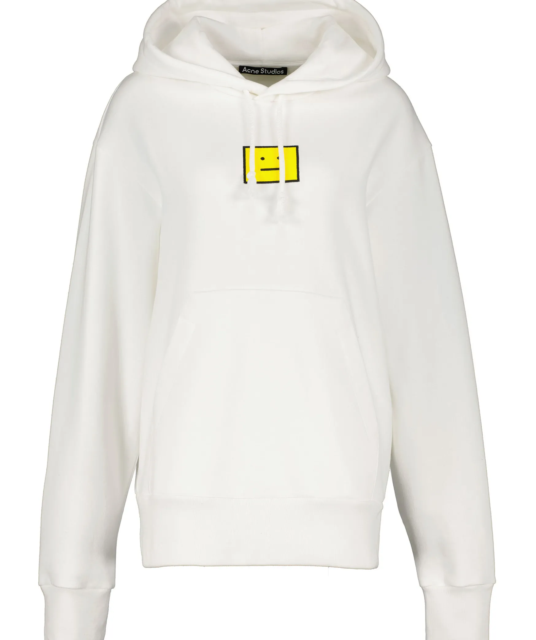 Vit, Hoodie Fran Acne Studios. Tillverkad I Ett Mjukt Bomullstyg Med Borstad Insida. Luva Med Snorning Och Kanguruficka Pa Magen. Gul Face Logo Broderad Mitt Pa Brostet. Avslappnad Passform Och Ribbade Muddar I Armslut Och Plaggslut.
