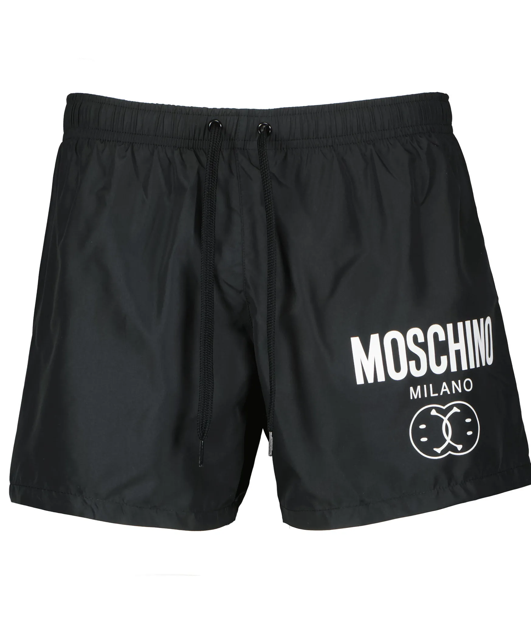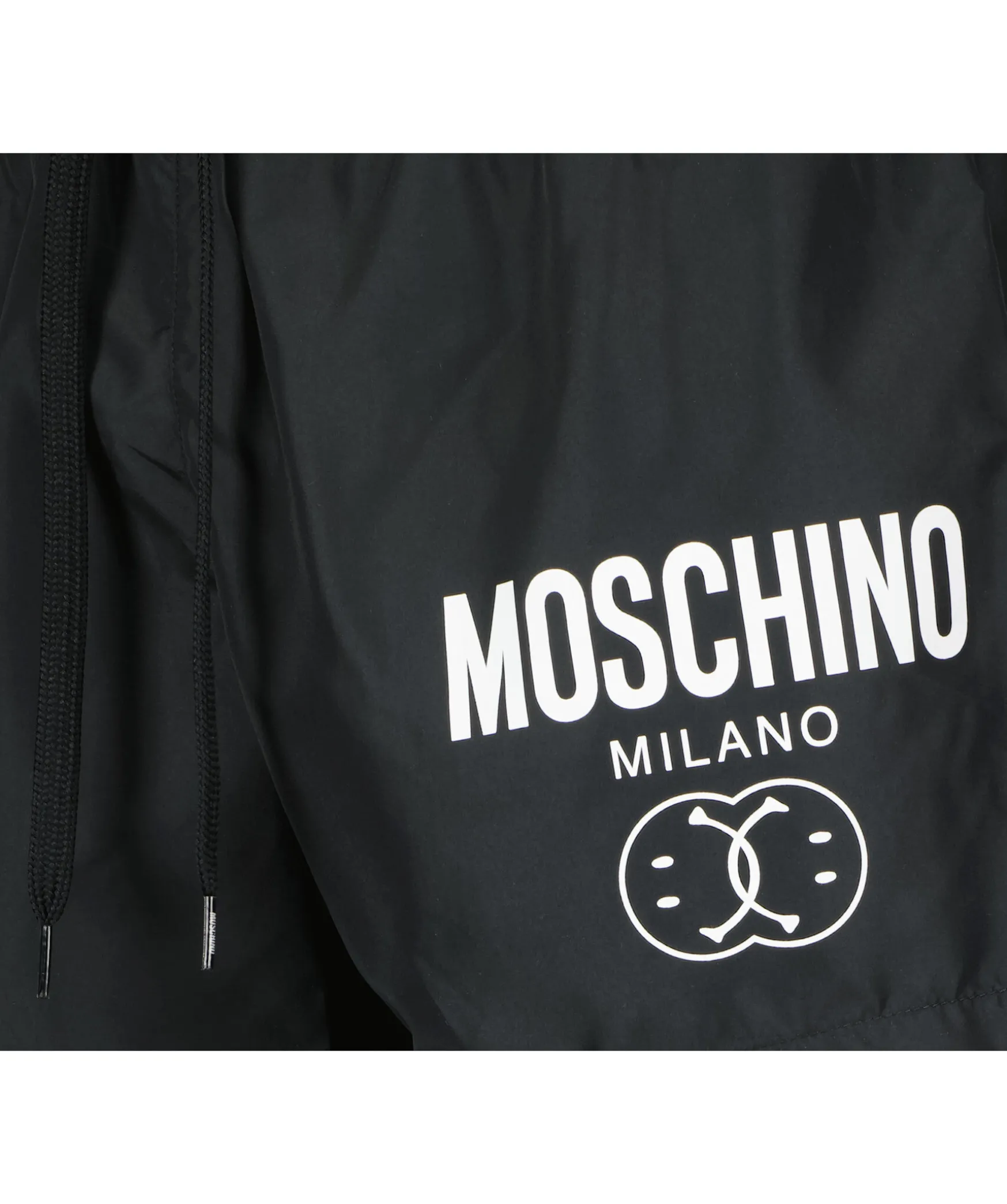 Svarta Badbyxor Fran Moschino. Tryckt Logotyp Pa Vanster Lar. En Ficka Baktill Pa Hoger Sida. Resar Och Dragsko I Midjan.