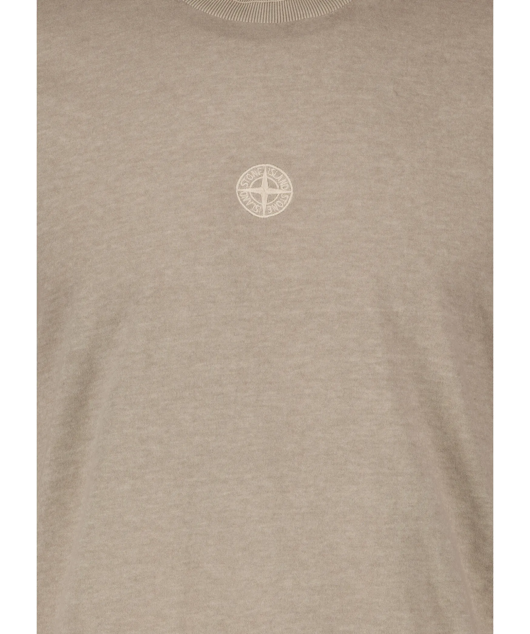 Beige T-Shirt Fran Stone Island. Rundad Halsringning, Med Ribbstickad Mudd. Tillverkad I 100% Bomull. Synliga Overlocksommar. Broderad Logotyp Pa Brostet.