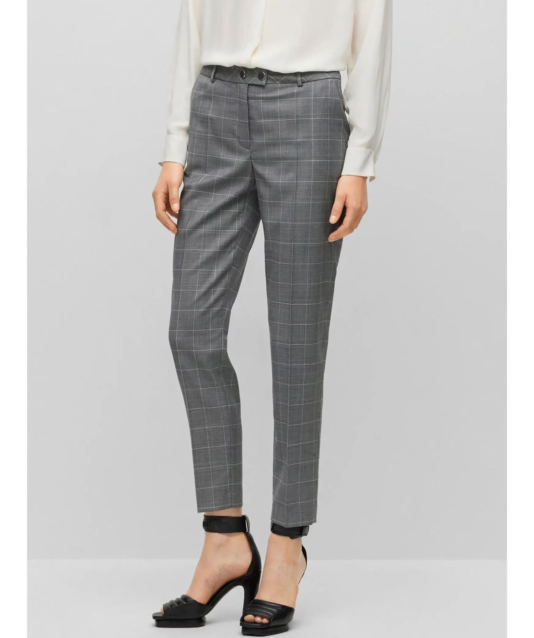 Graa Kostymbyxor Fran Boss Black. Byxor Med Hog Midja I Rutig Jungfrulig Ull, Skuren Till Rak Passform Med Smala, Avskurna Ben Fran Boss Womenswear. Tva Sidfickor Samt En Passpoal Bakficka. Balteshallor I Midjan.