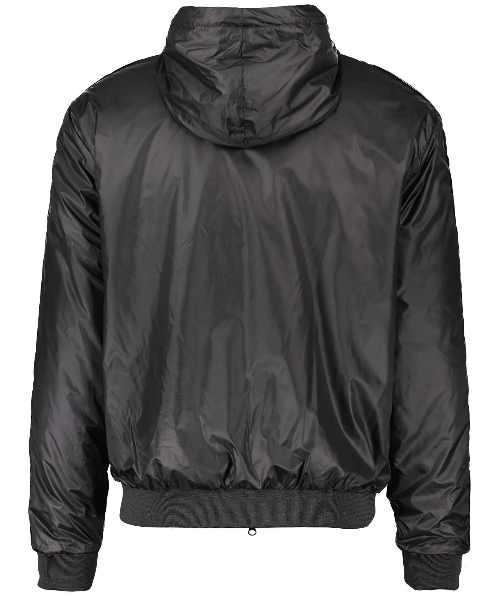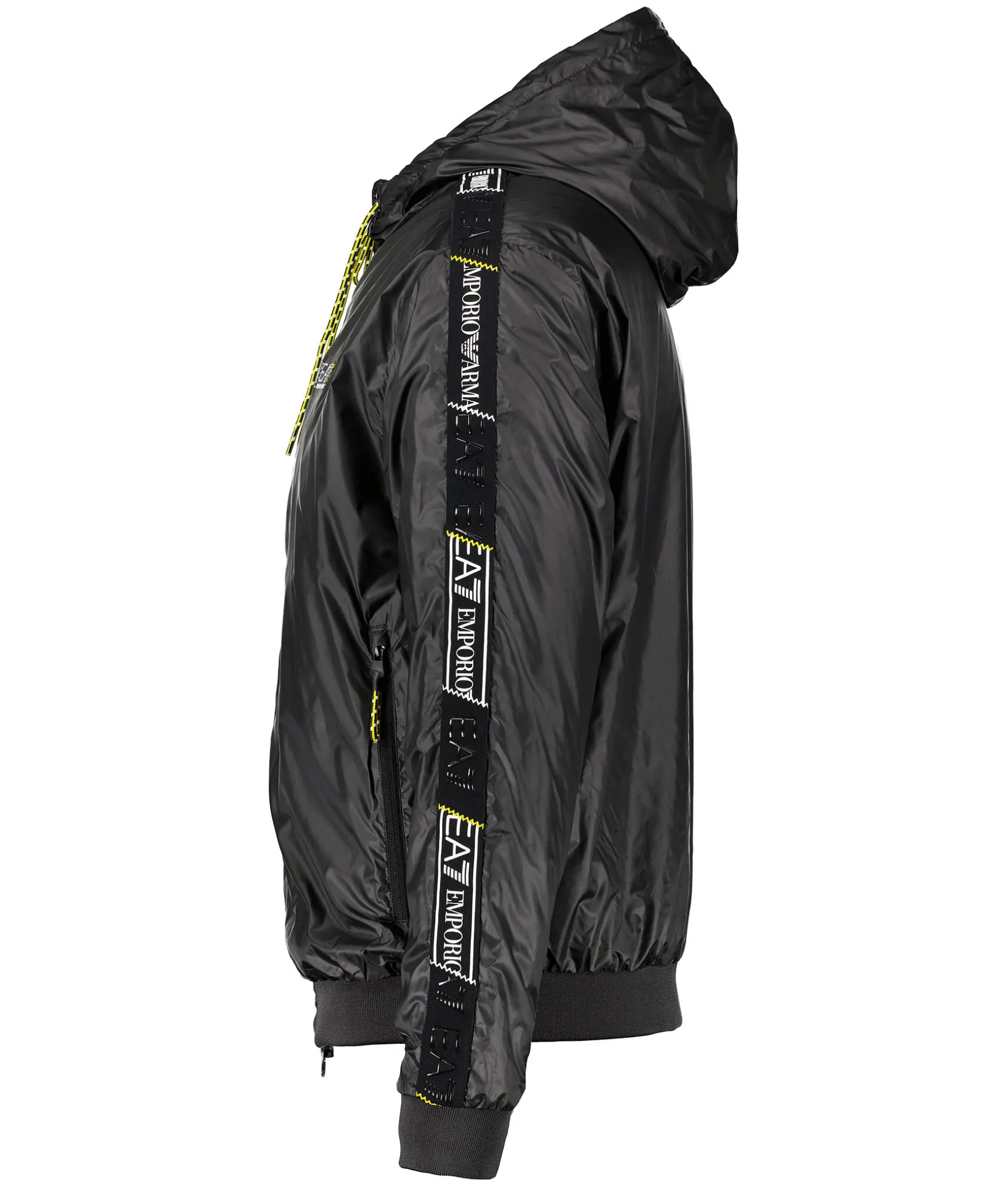 Morkgra Vindjacka Med Luva Och Tunn Fyllning I Polyester Fran Armani Ea7. Stangs Med Tvavagsdragkedja Framtill, Har En Hog Krage Och Luva Med Gulmonstrad Snorning. Svarta Revarer Med Svarta Och Vita Gummerade Logotyper. Tryckt Logotyp Pa Vanster Brost Och Fint Ribbade Muddar Vid Arm- Och Plaggslut. Tva Framfickor Och En Innerficka, Alla Stangs Med Dragkedja.