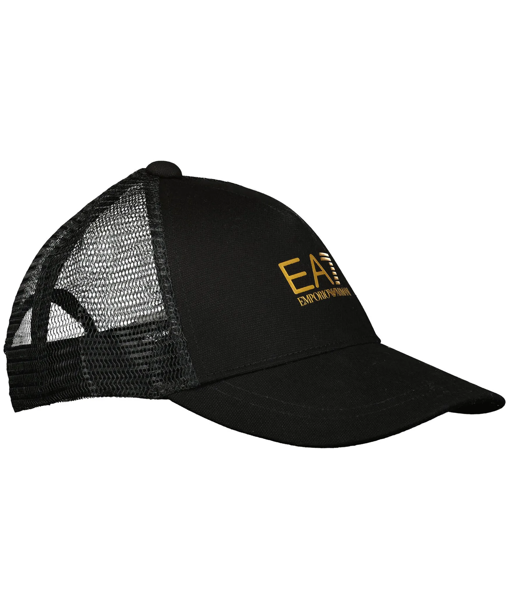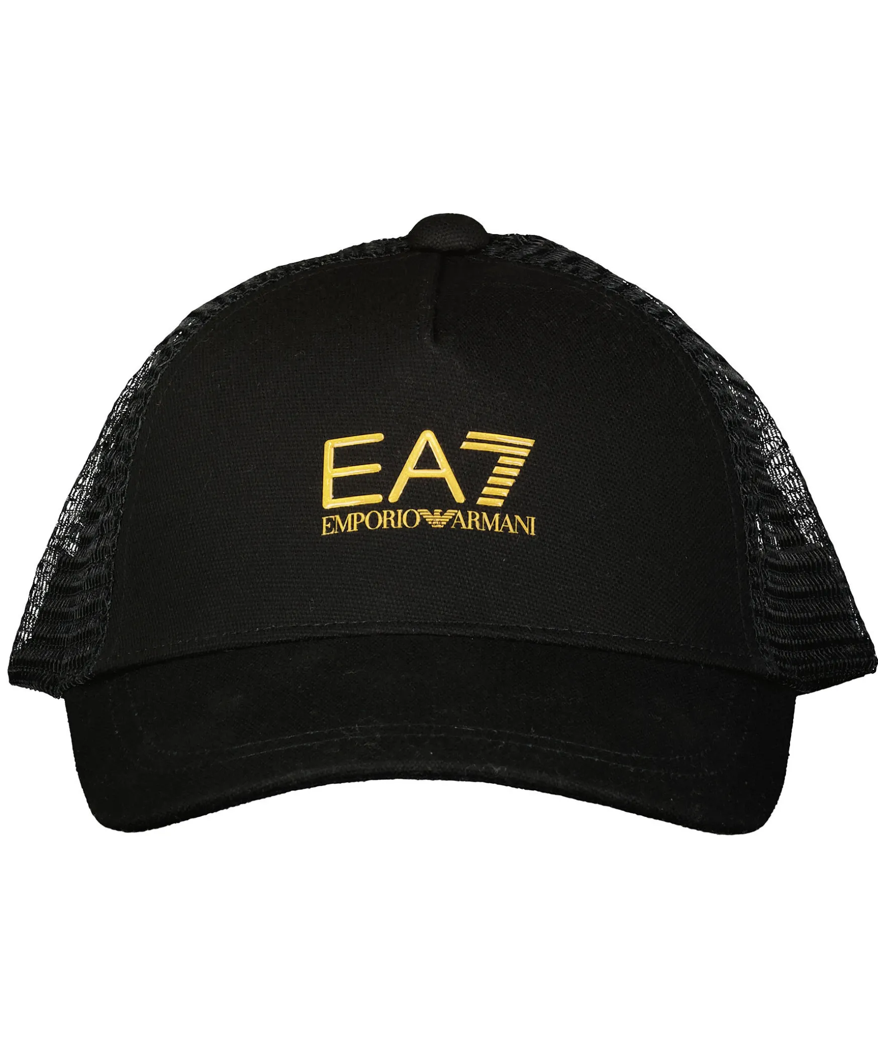 Svart Keps I Trucker-Basebollmodell Fran Armani Ea7. Gjord I Bomull Och Har Ett Natparti Baktill. Guldfargad Logotyp Pa Framsidan Och Ett Justerbart Snap-In-Rem.