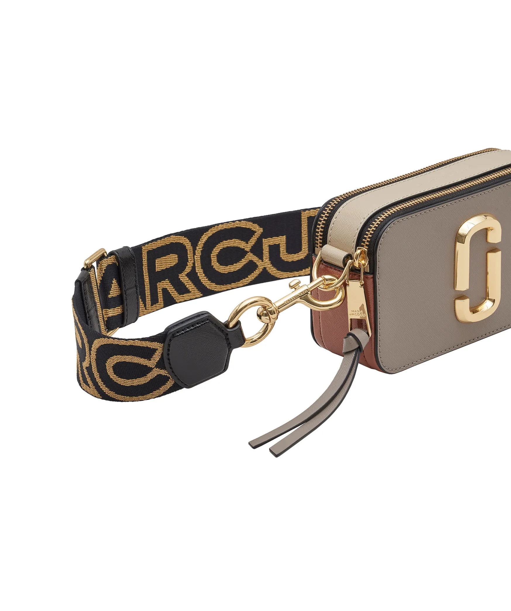 Taupefargad Handvaska Med Brunt Kontrasttyg Pa Sidorna Fran Marc Jacobs. Camera Bag Stil, Saffiano Lader, Justerbart Axelband I Svart Med Guldfargad Logotyp. Tva Fack Med Dragkedja, En Ytterficka. Guldfargade Detaljer.