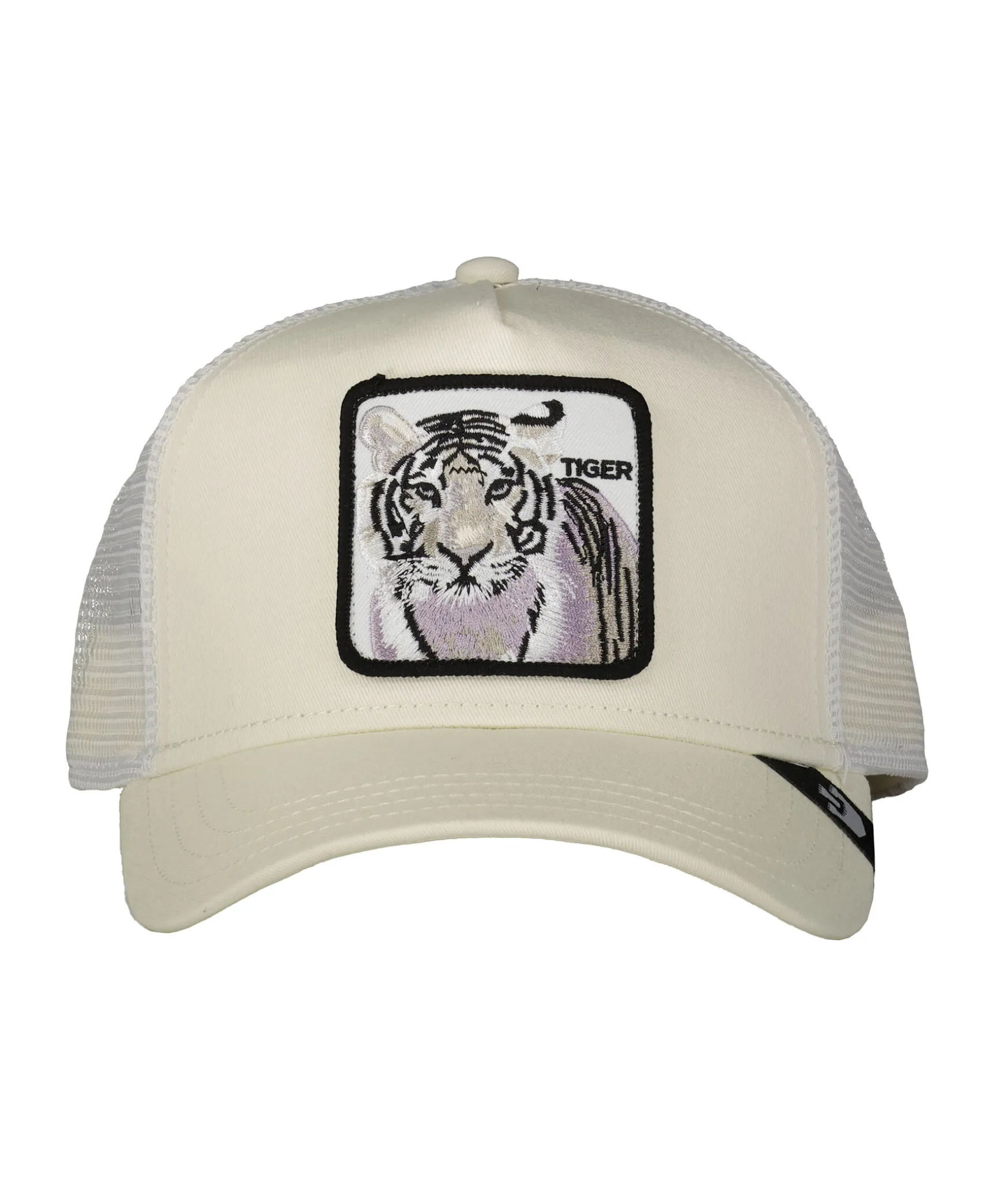 Vit Keps Med Meshtyg I Trucker-Basebollmodell Fran Goorin Bros. Fyrkantig Patch Med En Tiger Framtill. Onesize Storlek Med Ett Justerbart 4-Snap-In-Rem, Vilket Betyder Att Storleksintervallet Ar 55 Cm-61 Cm Med 58 Cm I Mitten. Ett Bomullssvettband Finns Fastsytt Pa Insidan. Tillverkad I En Polyesterblandning.