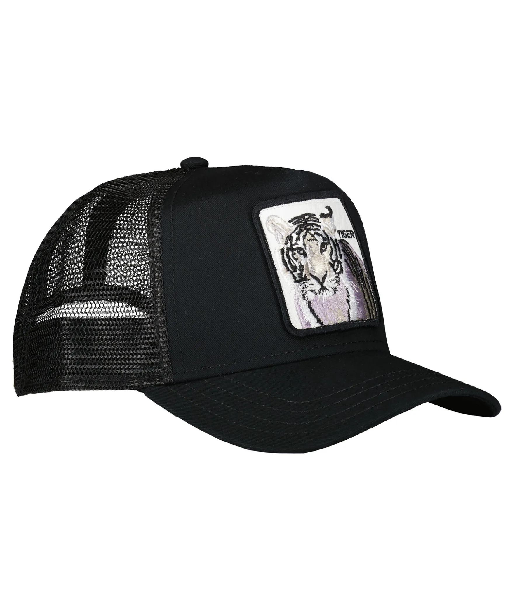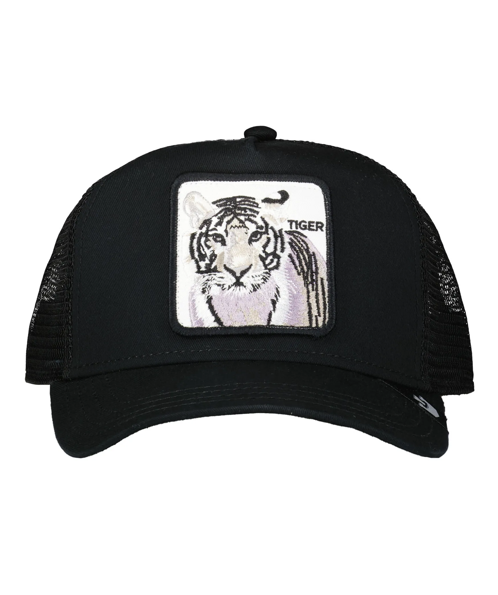 Svart Keps Med Meshtyg I Trucker-Basebollmodell Fran Goorin Bros. Fyrkantig Patch Med En Tiger Framtill. Onesize Storlek Med Ett Justerbart 4-Snap-In-Rem, Vilket Betyder Att Storleksintervallet Ar 55 Cm-61 Cm Med 58 Cm I Mitten. Ett Bomullssvettband Finns Fastsytt Pa Insidan. Tillverkad I En Polyesterblandning.