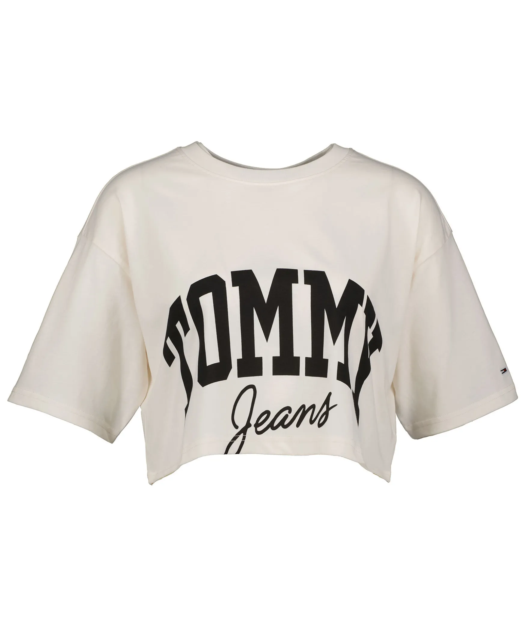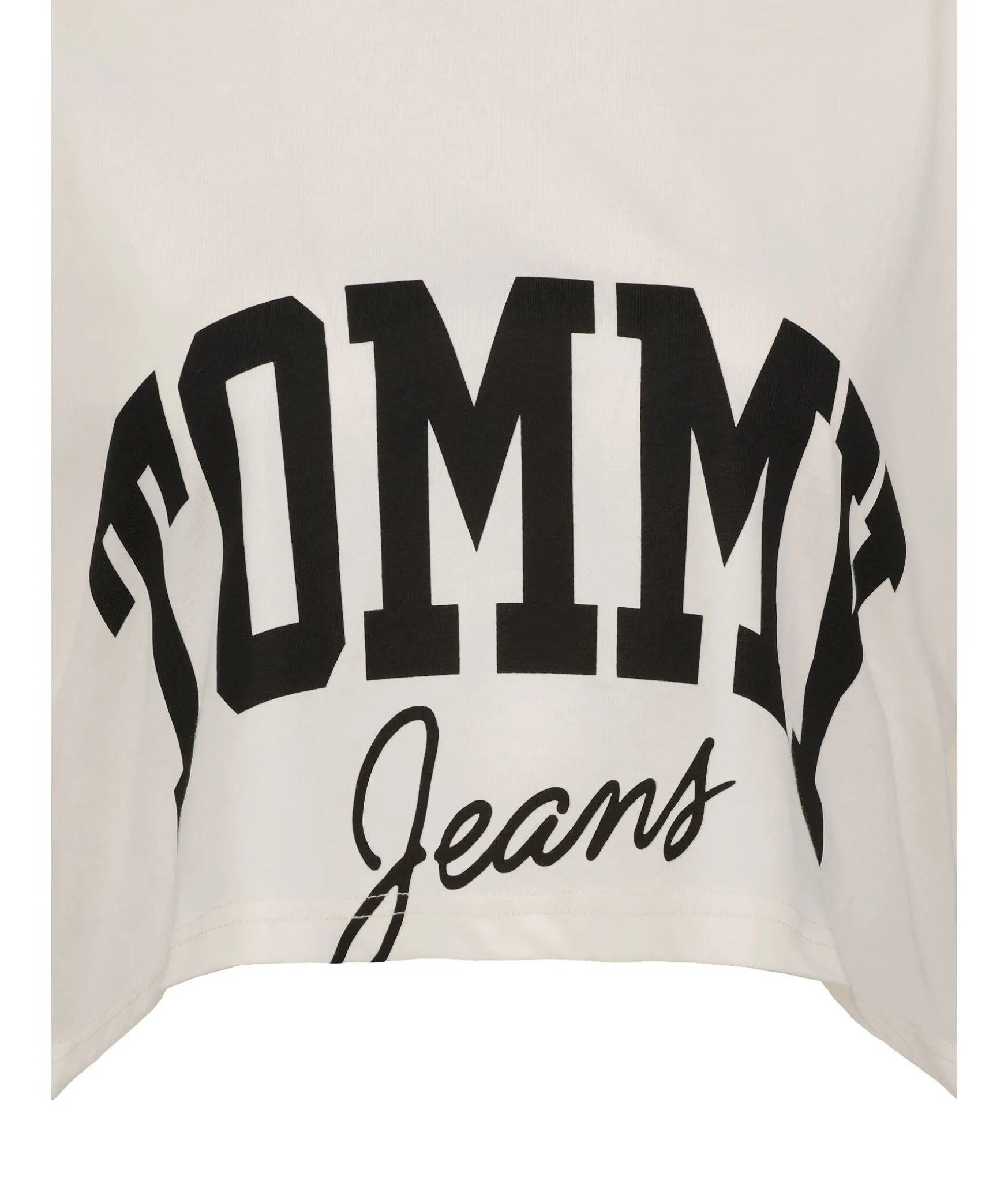 Benvit Croppad T-Shirt Fran Tommy Jeans. Tillverkad I 100% Bomull. T-Shirten Har Ett Svart Logotyptryck I Nederkant Av Trojan. Ribbstickad Halsring. Liten Broderad Logotyp Pa Vanster Arm.