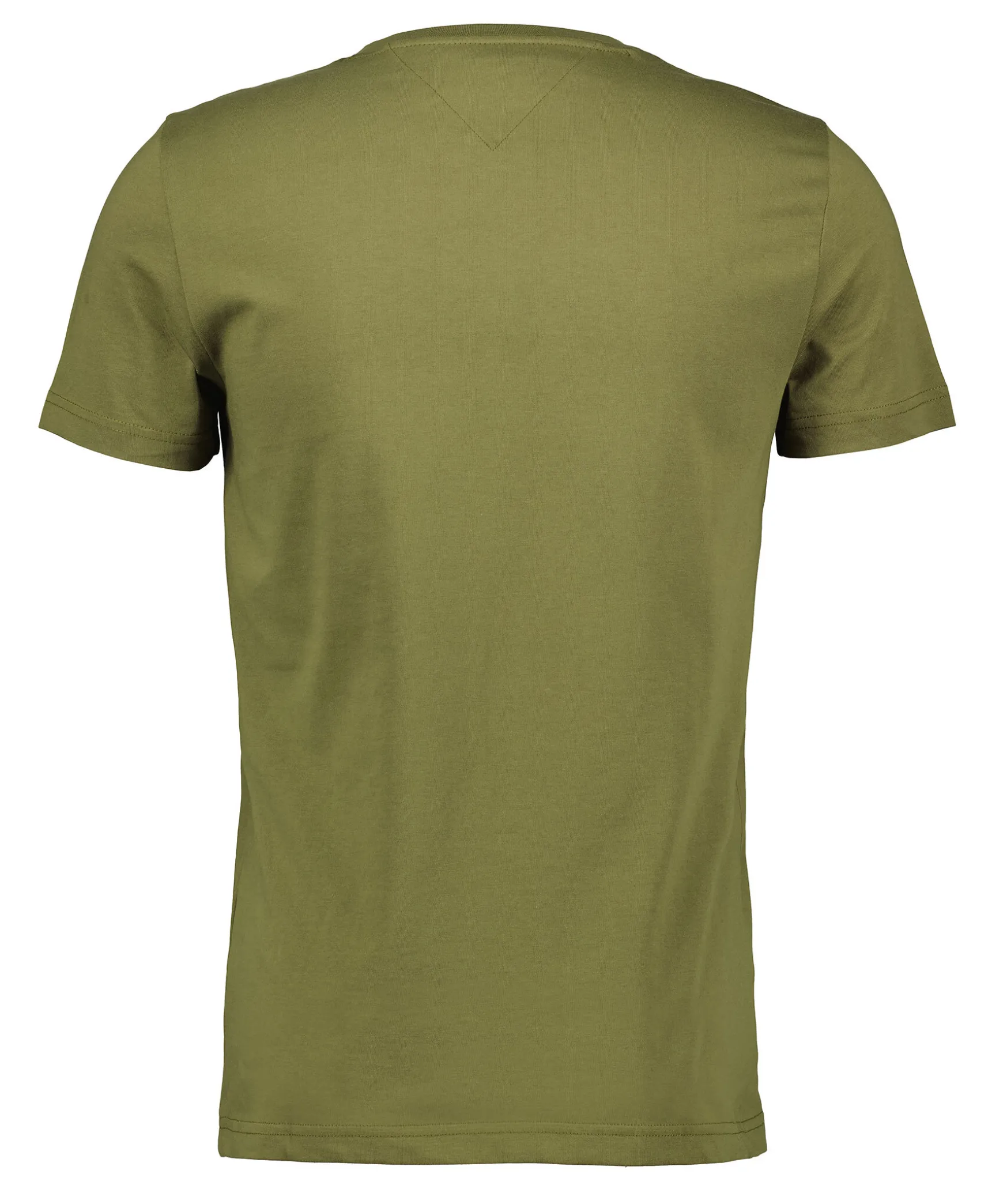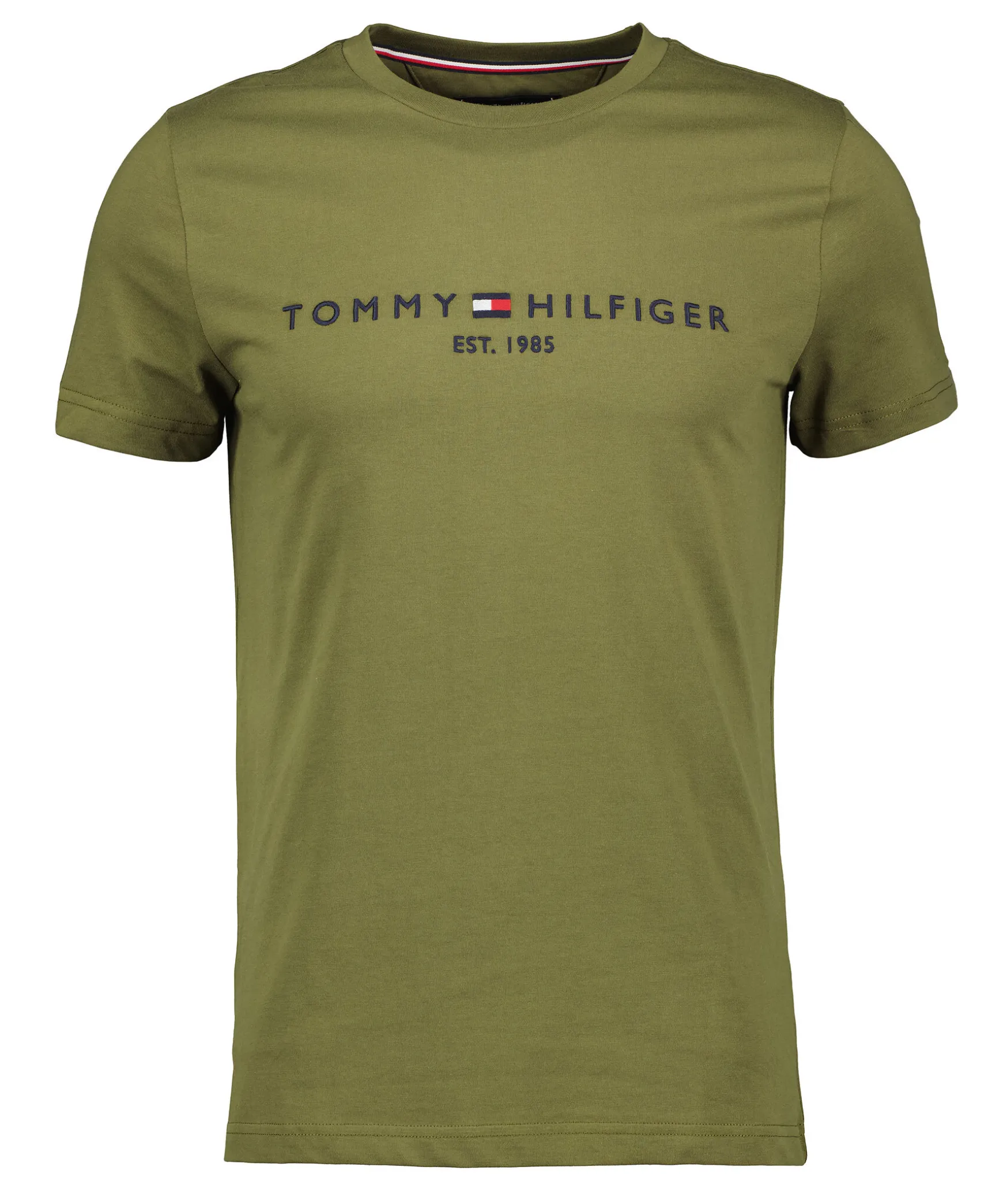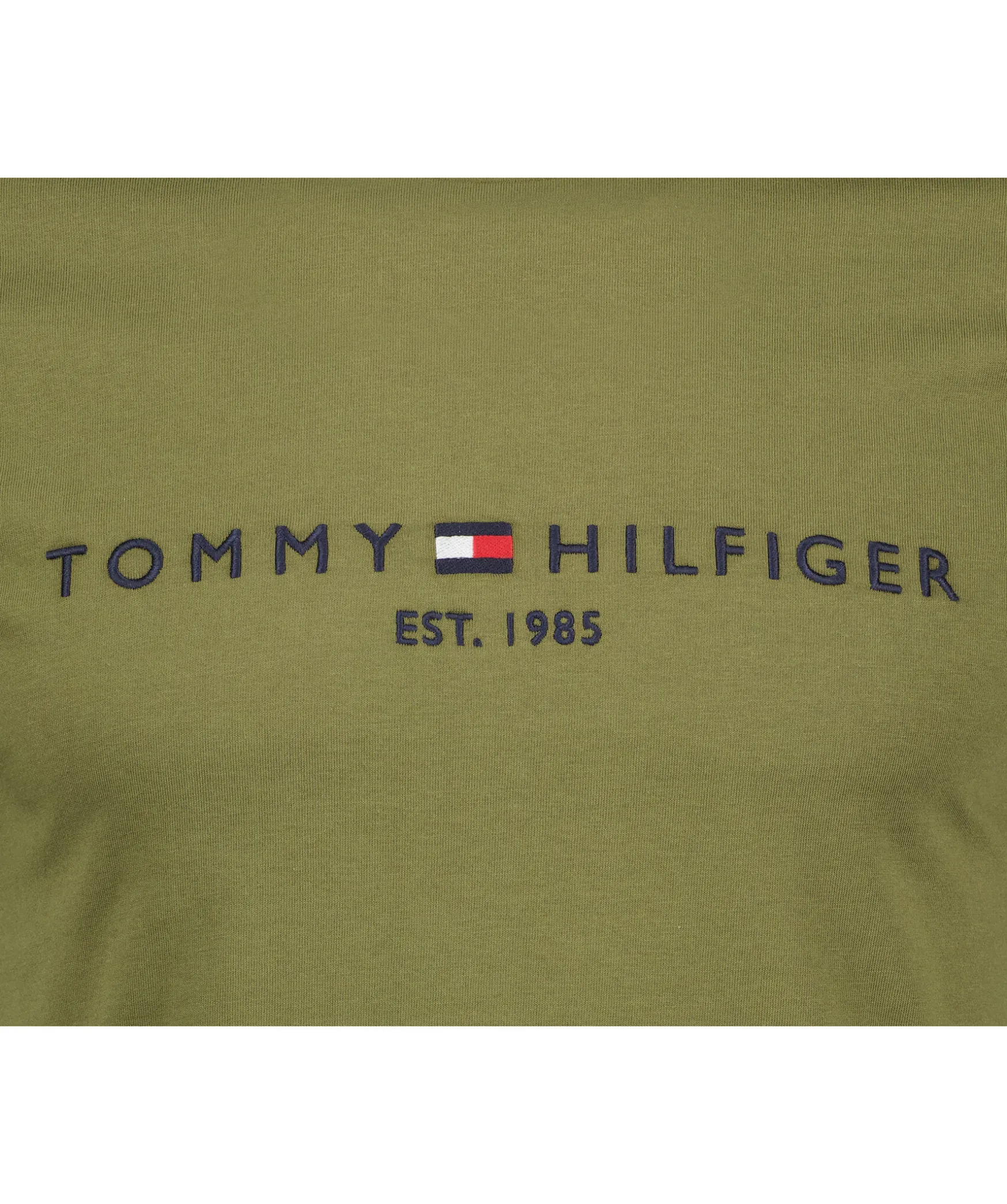 Olivgron T-Shirt Fran Tommy Hilfiger. Rundad Hals, Stor Broderad Logotyp Pa Brostet, Liten Broderad Logga Pa Vanster Arm. Tillverkad I 100% Bomull.