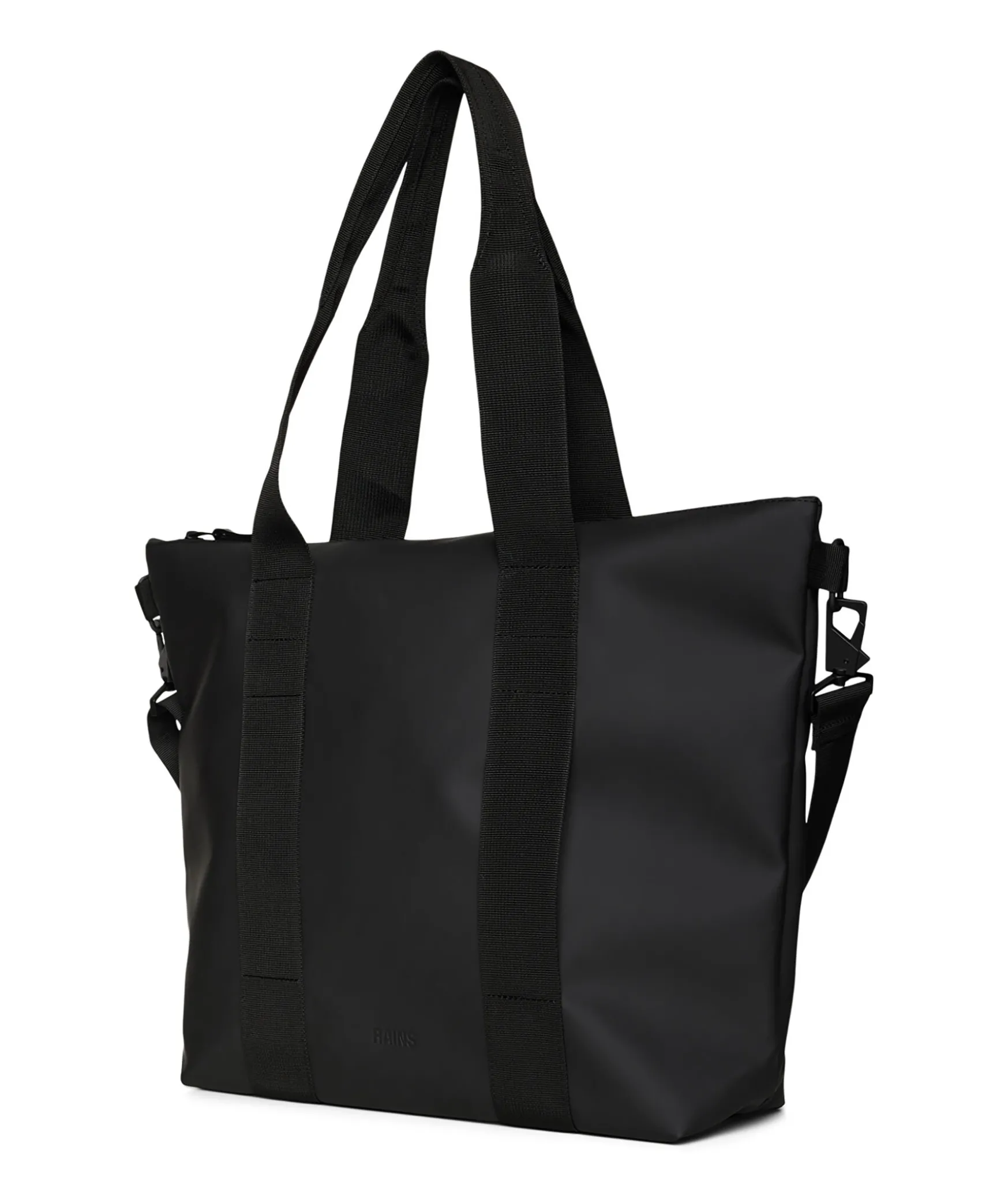 Svart Liten Totebag I Vattentatt Tyg Fran Rains. Vaskans Huvudfack Stangs Med Dragkedja. Vavda Barhandtag, Avtag- Och Justerbar Axelrem. Vaskans Matt: H 36 Cm X B 35 X D 13Cm.