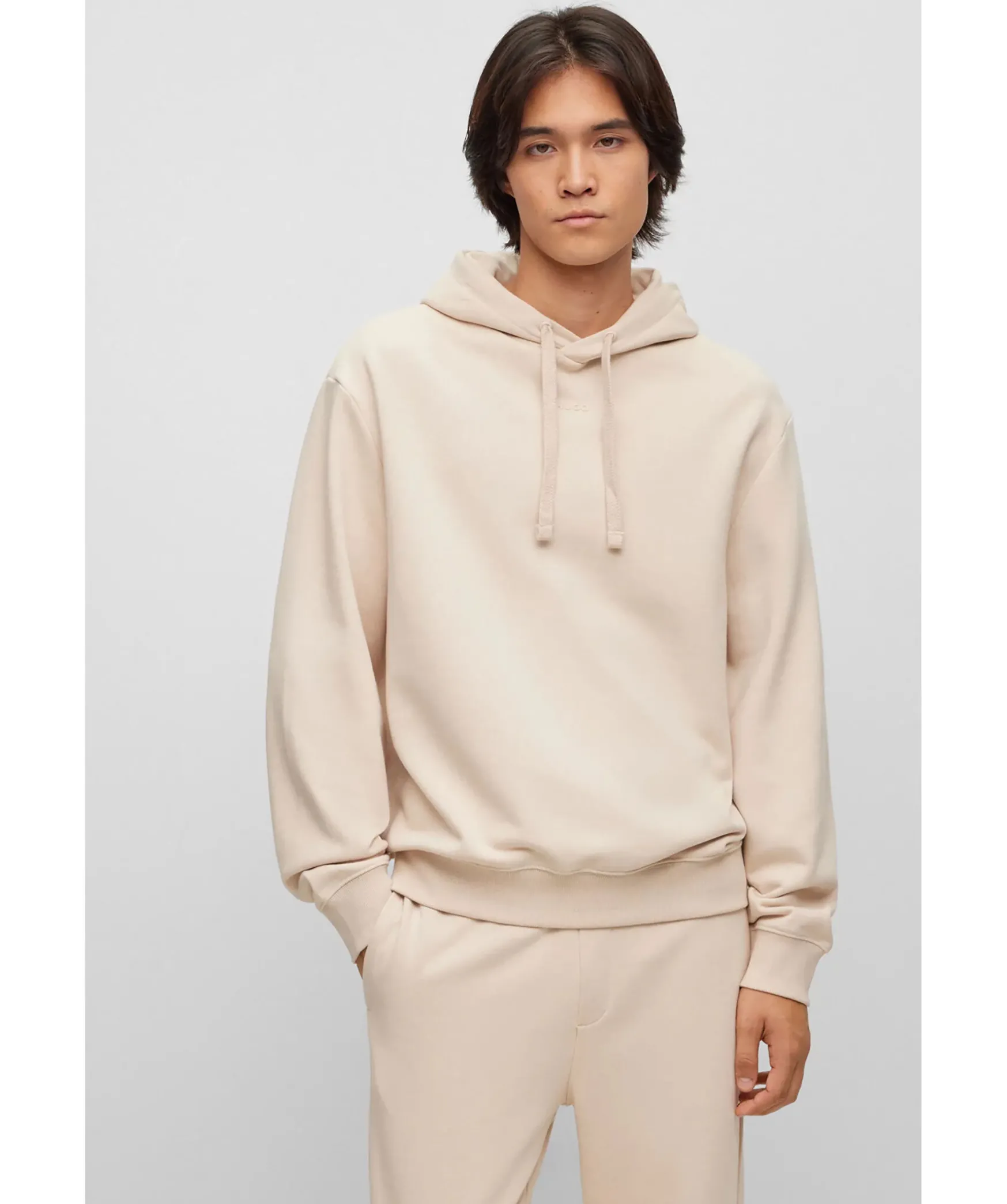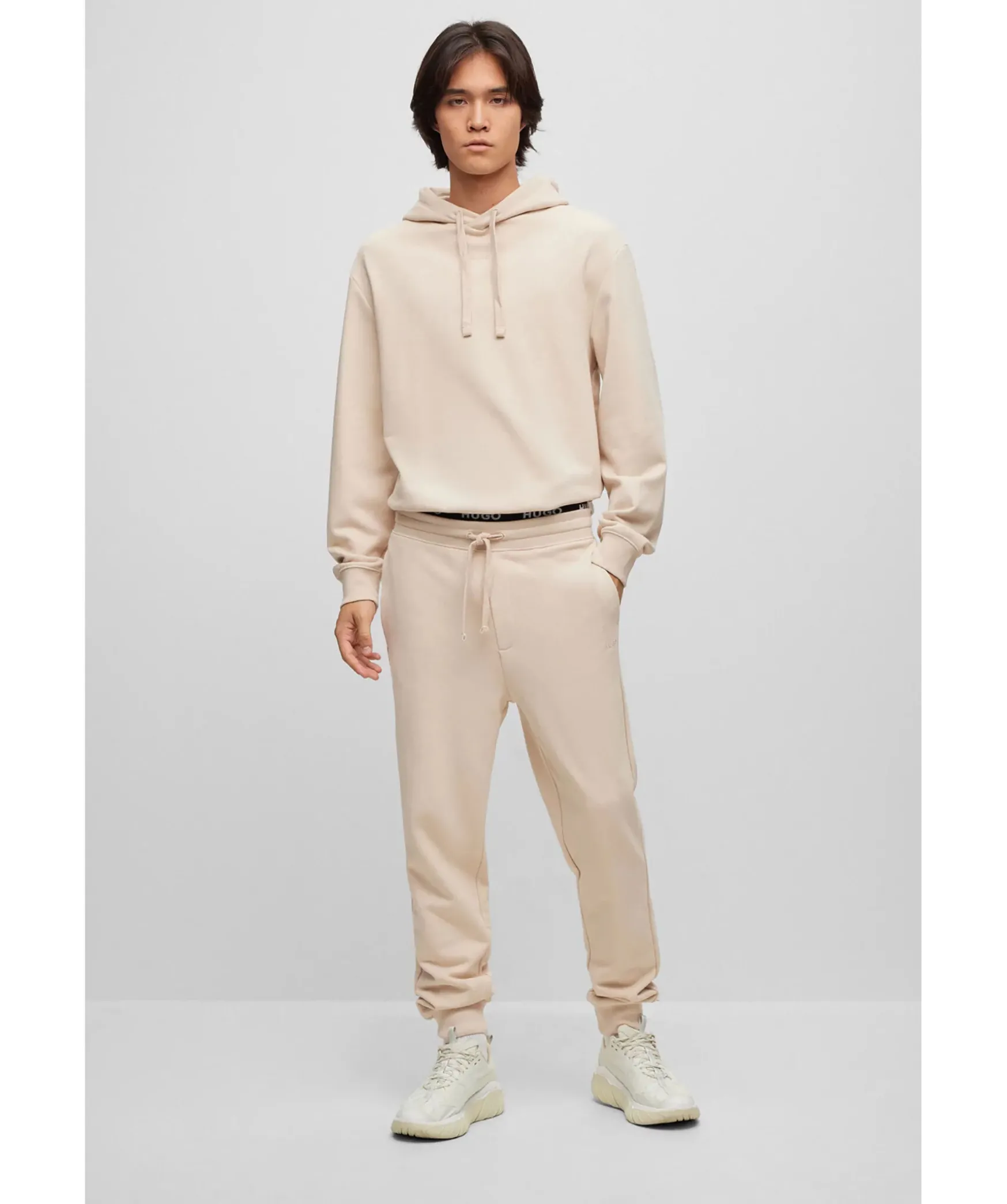 Beige Tracksuit Set I Relaxed-Fit Fran Hugo. Tillverkad Av Mjuk Terry-Bomull Och Med Loggor I Ton-I-Ton. Trojan Har Huva Med Snorning Och Extra Langa Armar Samt Ribbstickade Muddar Vid Arm Och Plaggslut. Byxorna Har Resar I Midjan Med Snorning Samt Ribbstickad Benslut Och Tva Sidfickor.