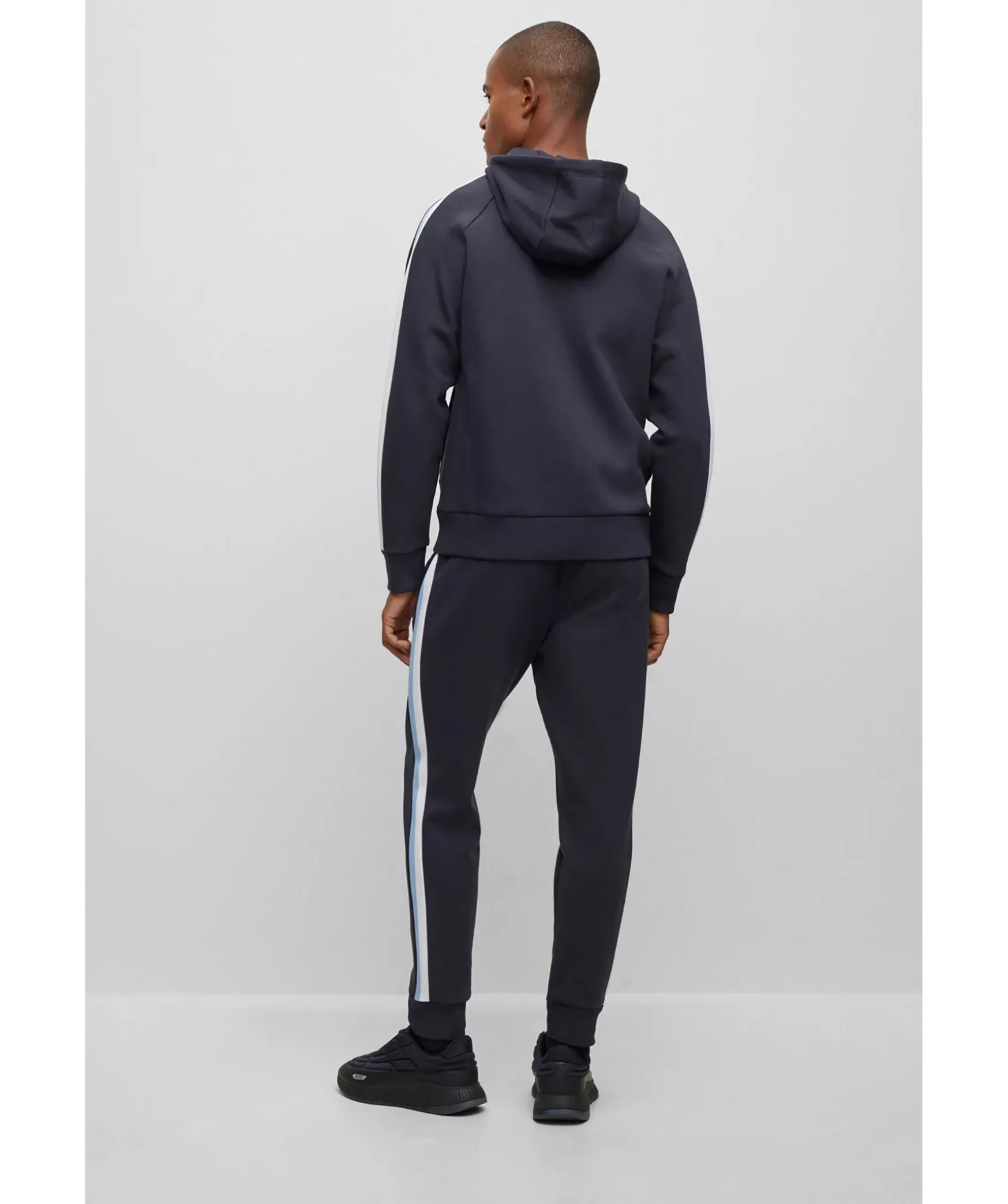 Morkblatt Tracksuit Set Fran Boss Green. Normal Passform Tillverkad I Stretchig Bomullsblandning. Trojan Och Byxorna Kommer Med En Sportig Randig Tejp Och Kontrastmarke Fran Boss Menswear. Trojan Har Huva Med Snorning Och Trojan Stangs Med Dragkedja. Ribbstickade Muddar. Byxorna Har Resar Och Snorning I Midjan.