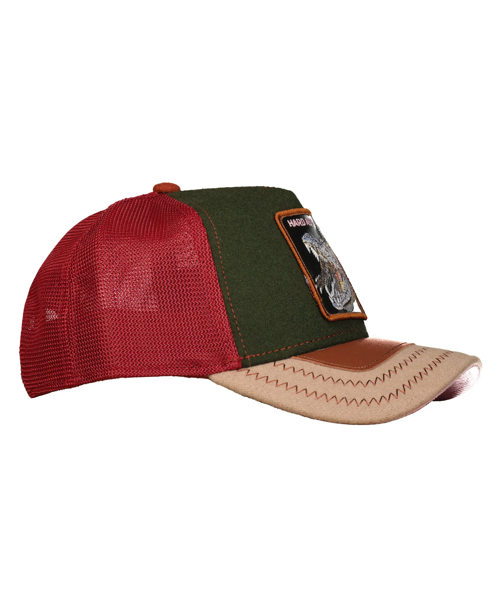 Flerfargad Keps I Trucker-Basebollmodell Fran Goorin Bros. Rodfargat Meshtyg Baktill. Morkgront Tyg Framtill Med Fyrkantig Patch Med En Krokodil Och En Text ”Hard Ass”. Brunt Tyg Med En Laderlapp Och Sick-Sack Sommar Pa Skarmen. Onesize Modell Med Ett Justerbart 4-Snap-In-Rem. Rosa Manchstertyg Undertill. Kontrasttyg Pa Vanster Sidan.