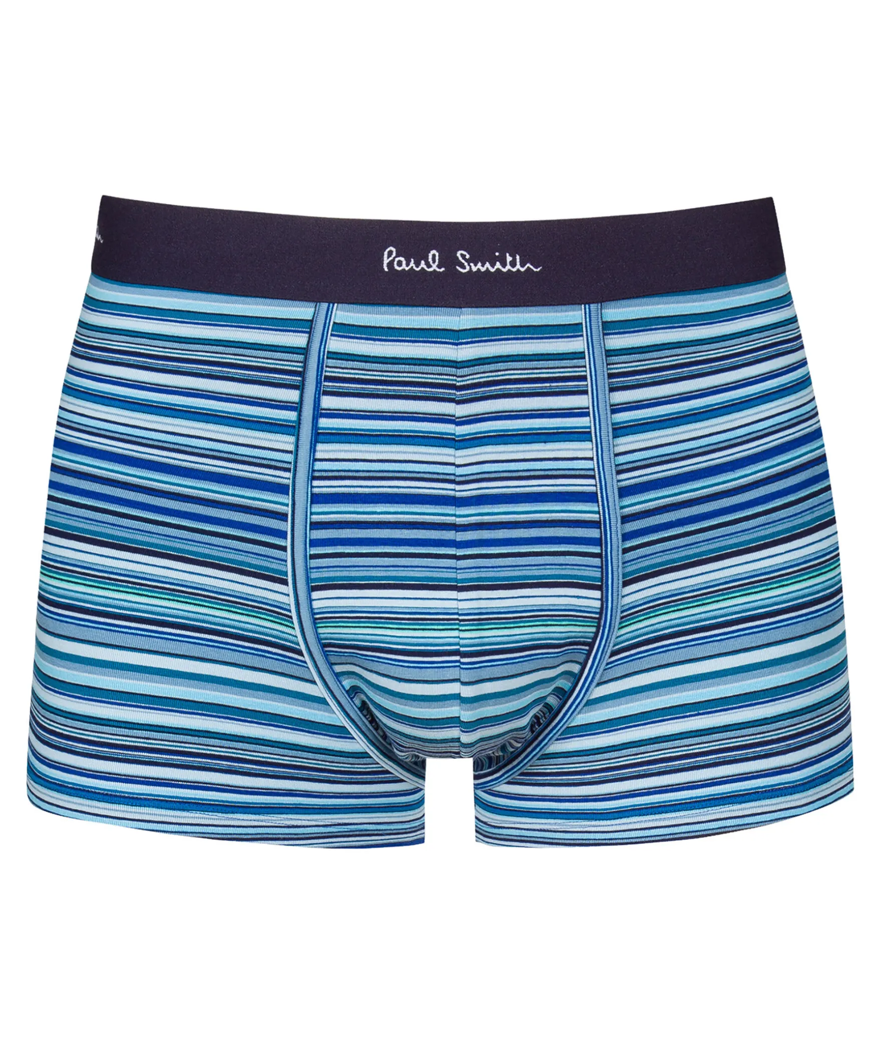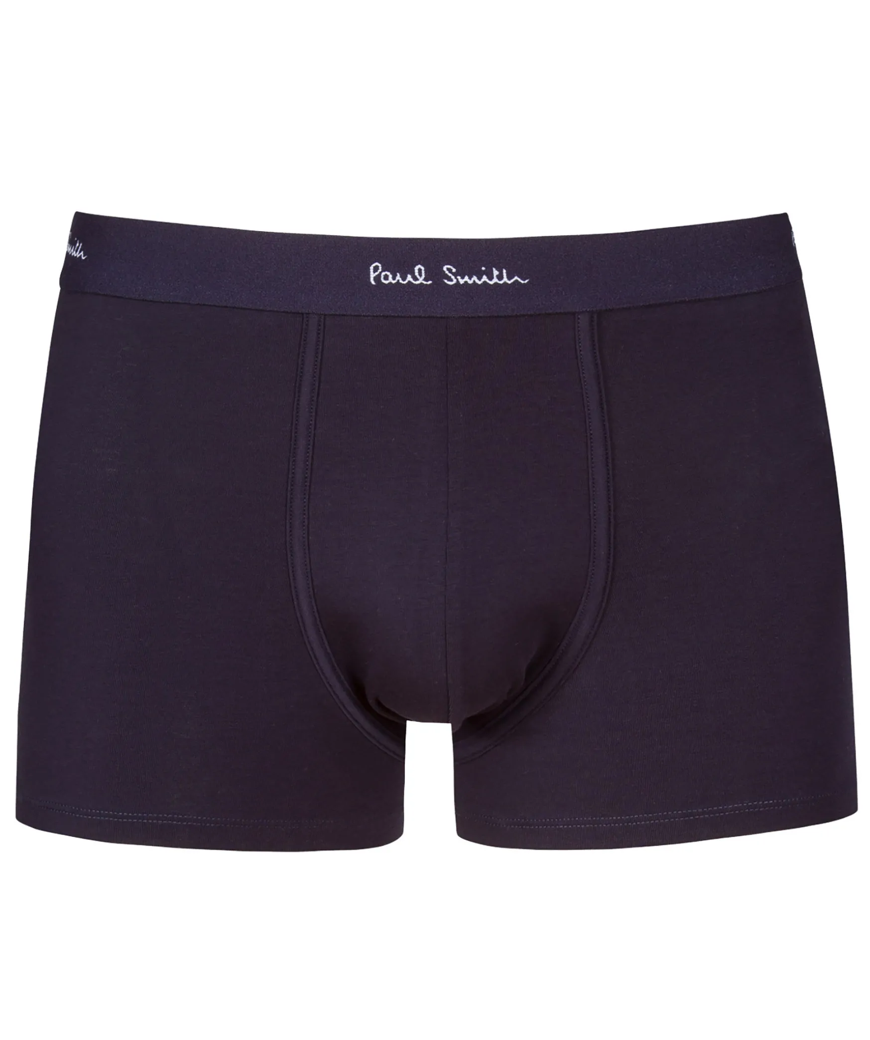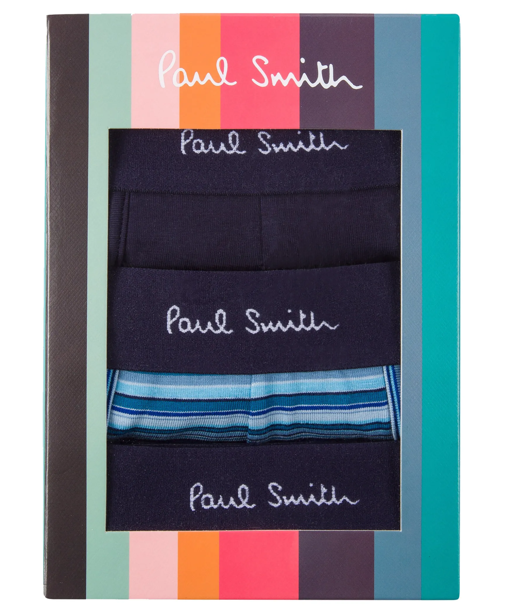 Tre Pack, Randiga Kalsonger I Boxermodell Fran Ps Paul Smith. Tva Enkla Marinbla Par Och En Bla Randig I Paul Smiths Signatur Rander. Marinbla Mudd I Midjan Med Vit Logotyp Pa.