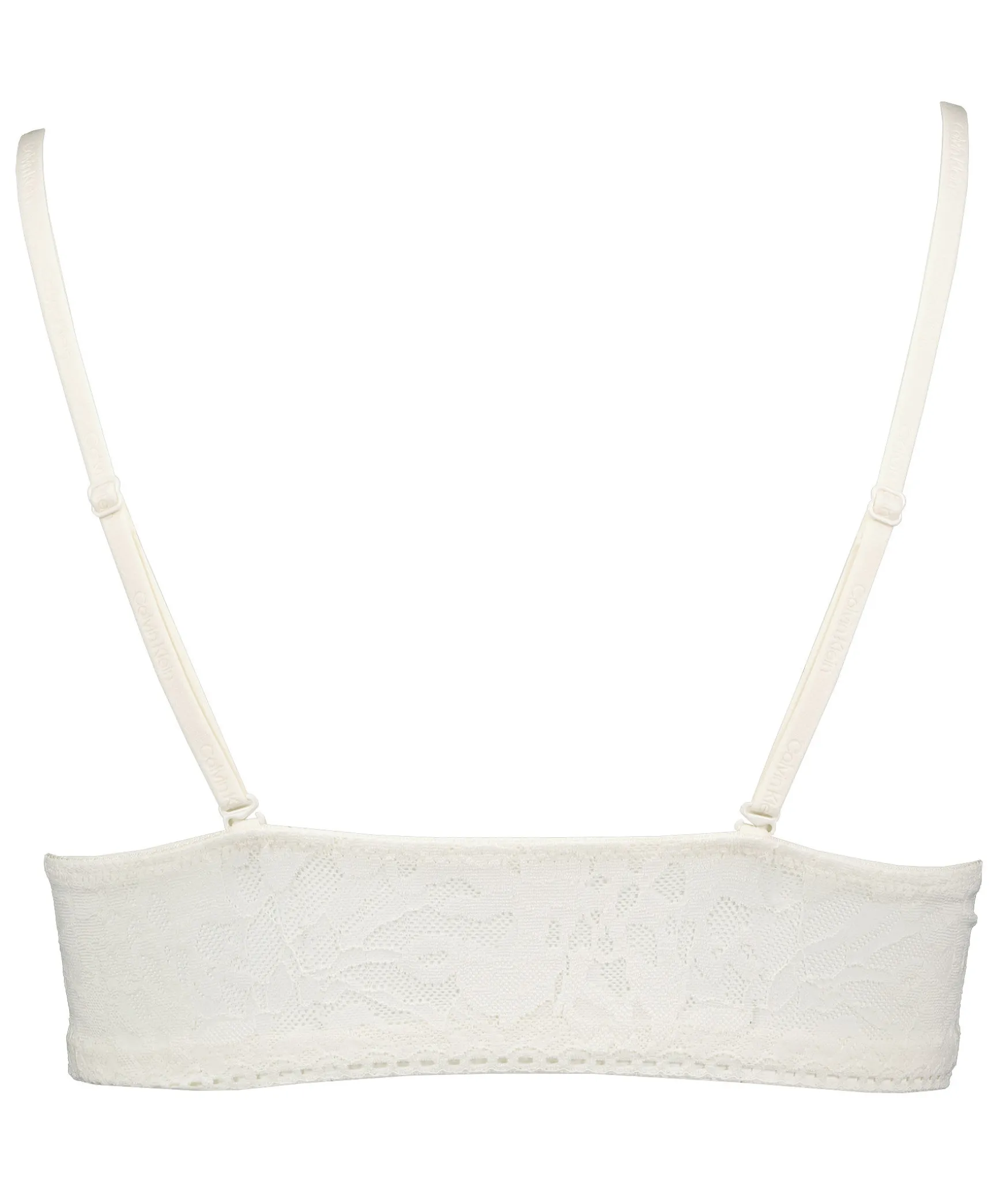 Kramvit Bralette I Blommig Stretchspets Fran Calvin Klein. Mjuka Koppar, Ingen Stoppning Och Design Utan Bygel. Spetskanter, Gar Att Justera Banden Till Korsryggstil Och Calvin Klein Signatur Pa De Elastiska Axelbanden.