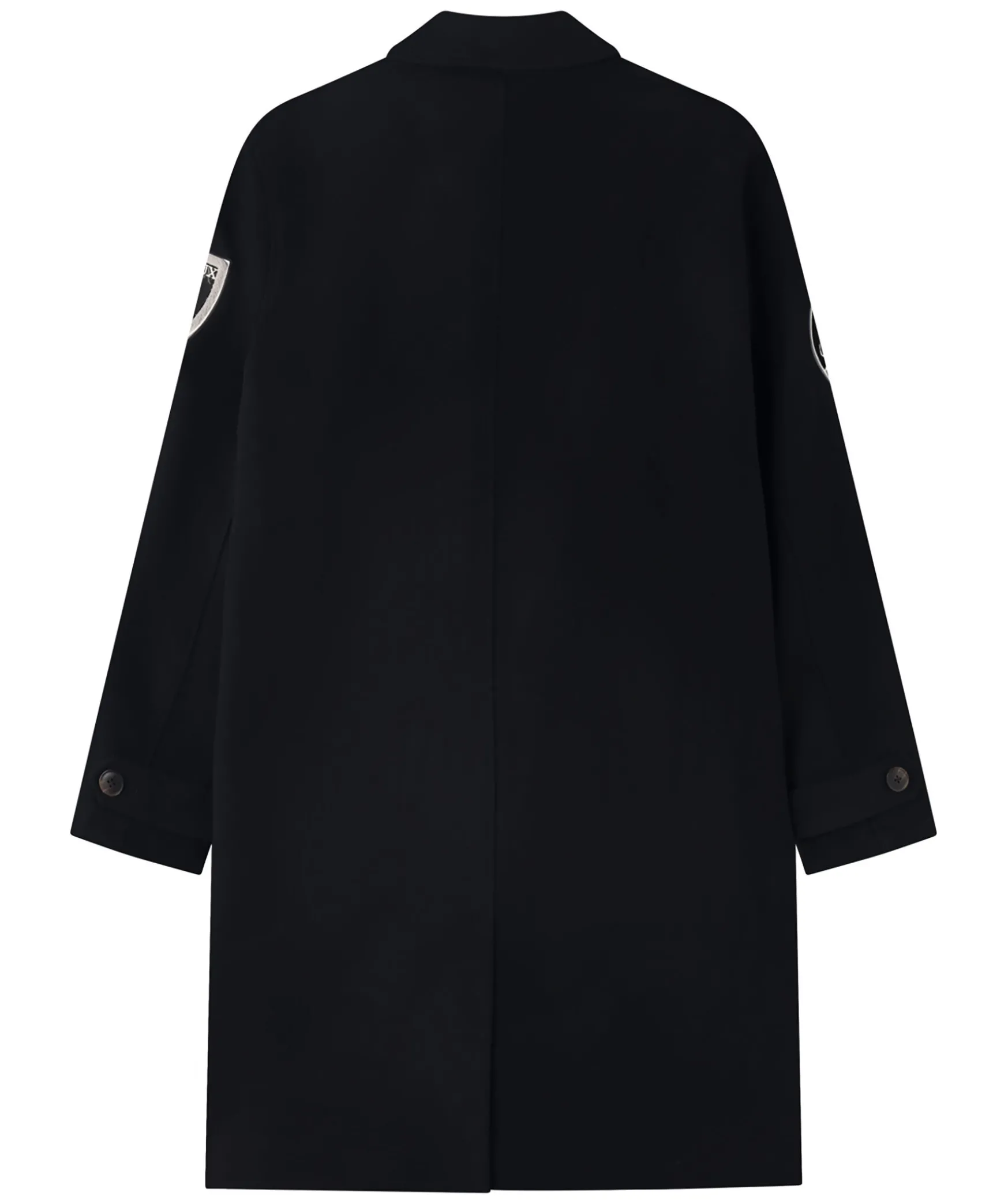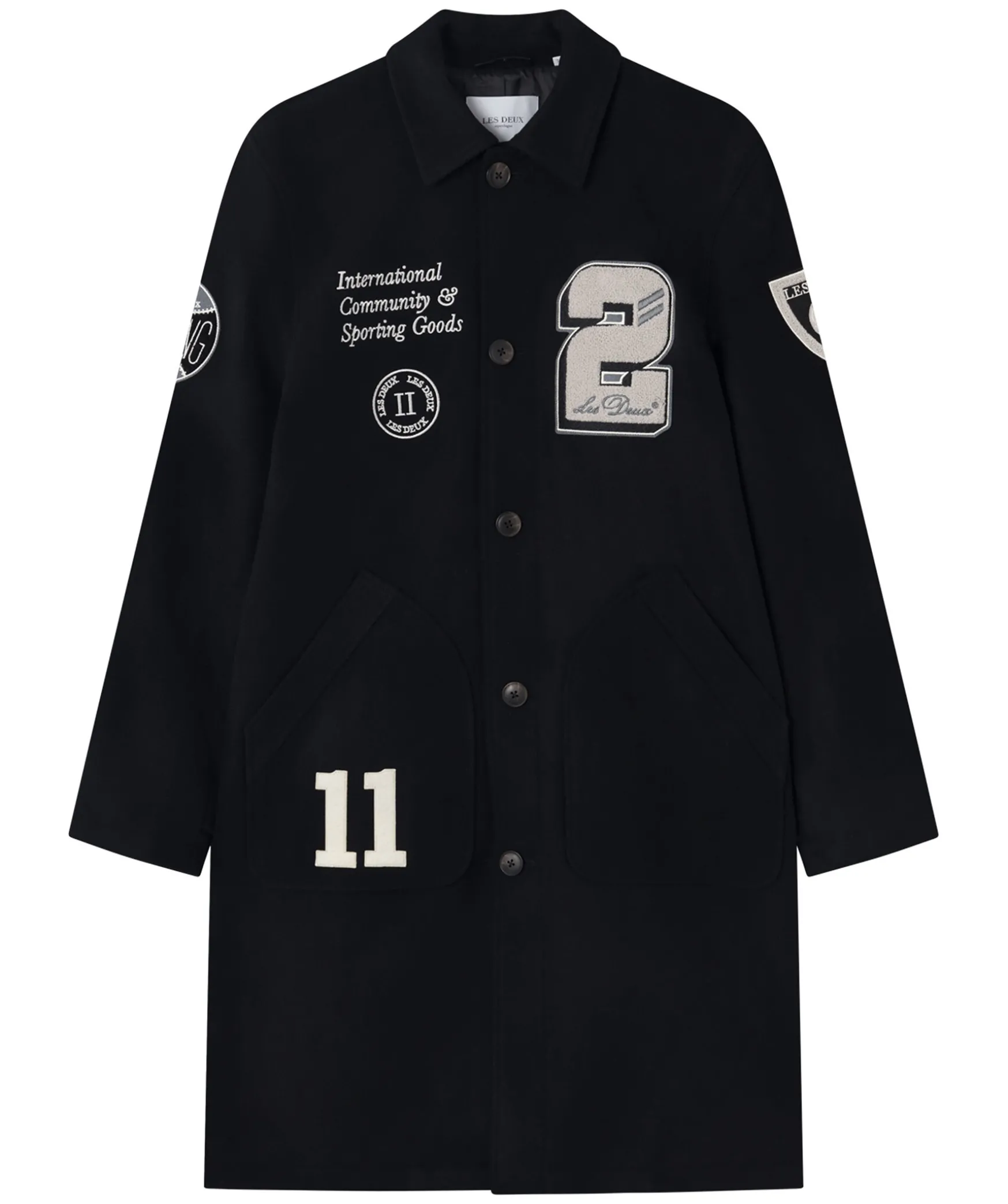 Svart Varsity Inspirerad Ullrock Fran Les Deux. Jackan Ar Gjord I En Skon Ullblandning Och Ar Dekorerad Med Broderade Tygpatches. Rocken Stangs Med Knappar, Har Tva Framfickor Och En Klassisk Krage.