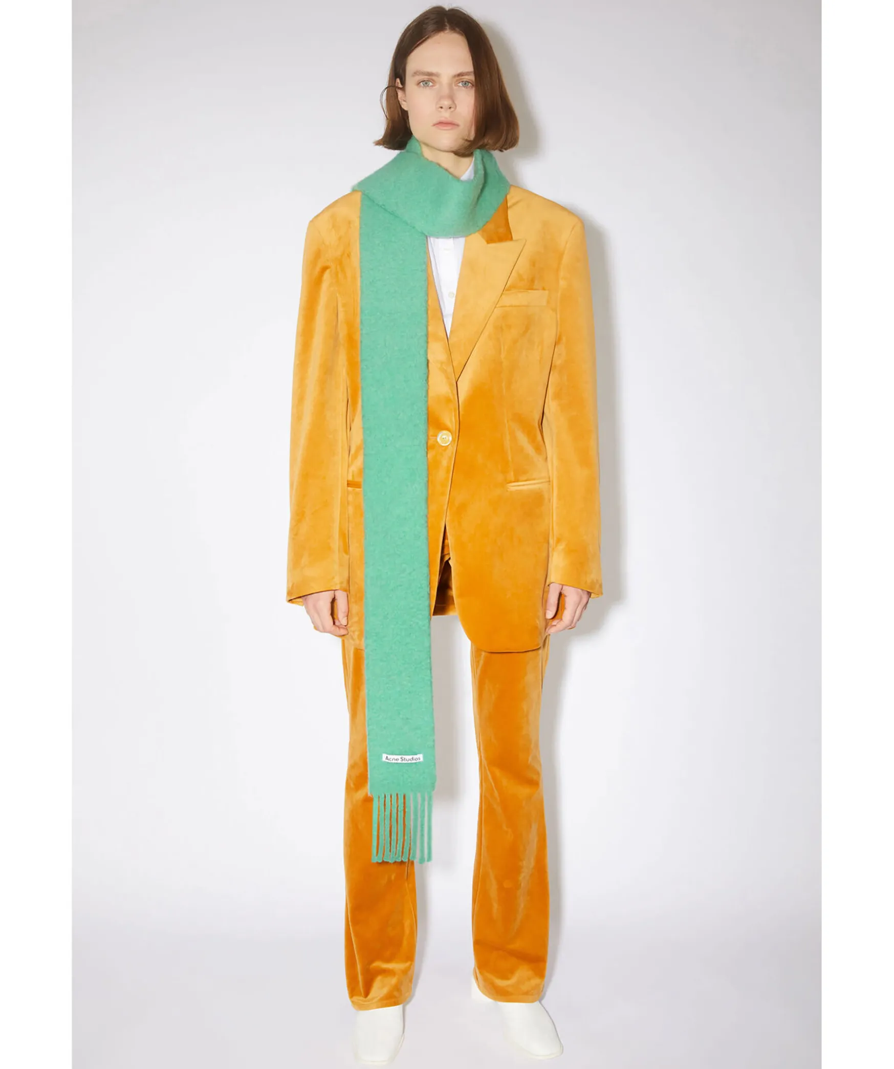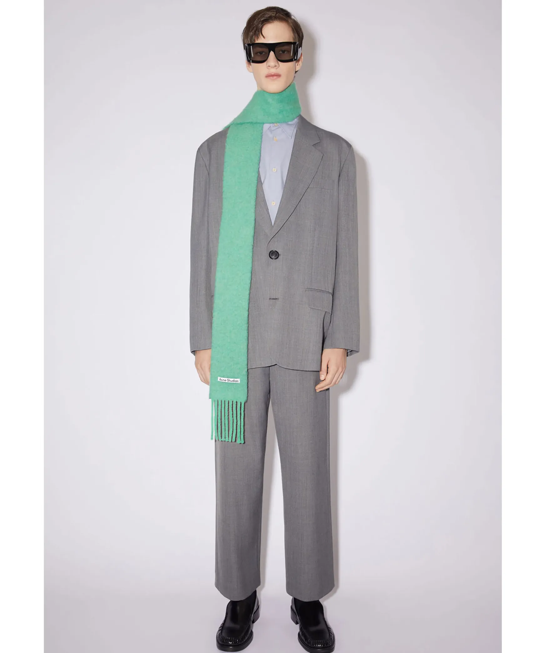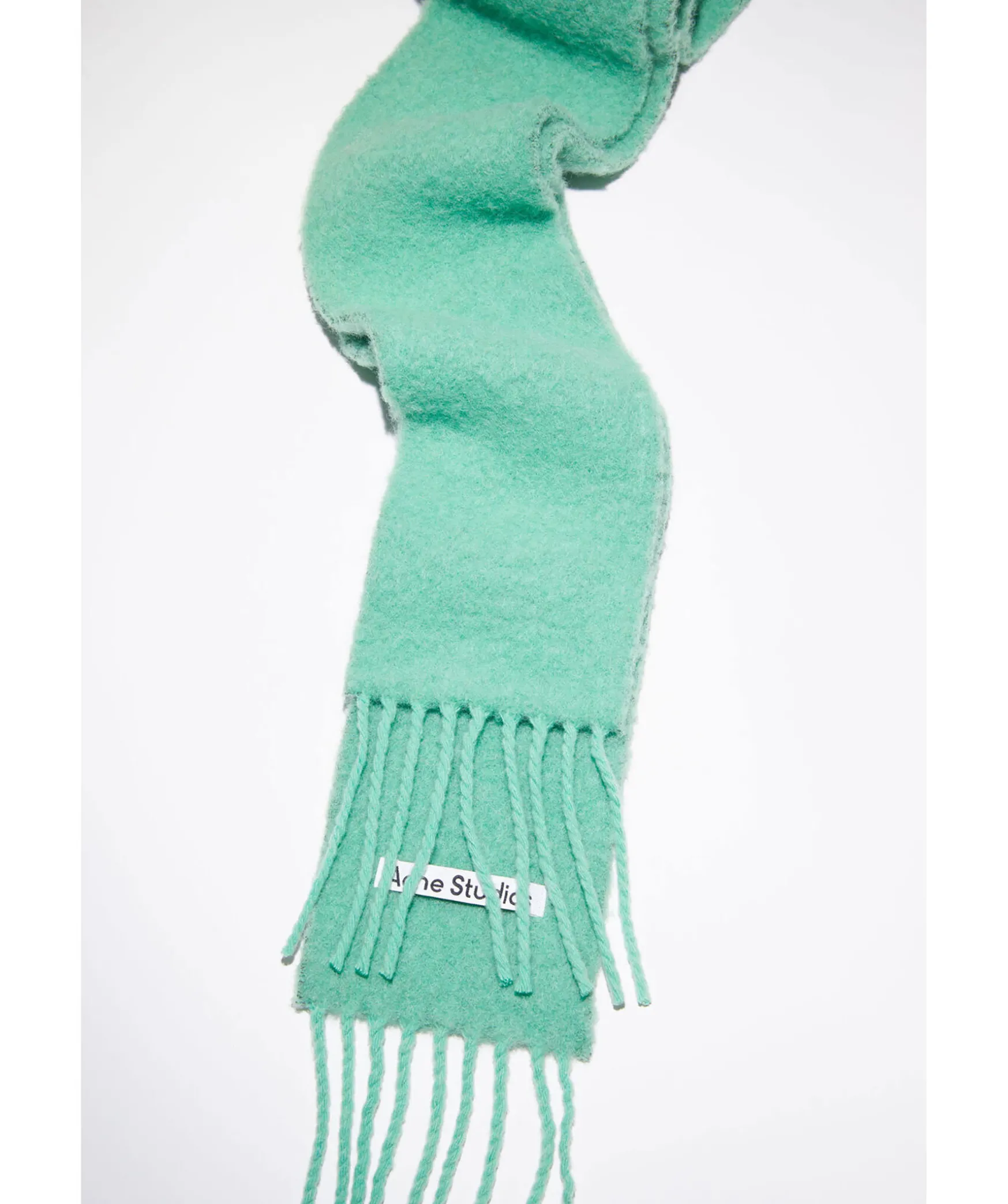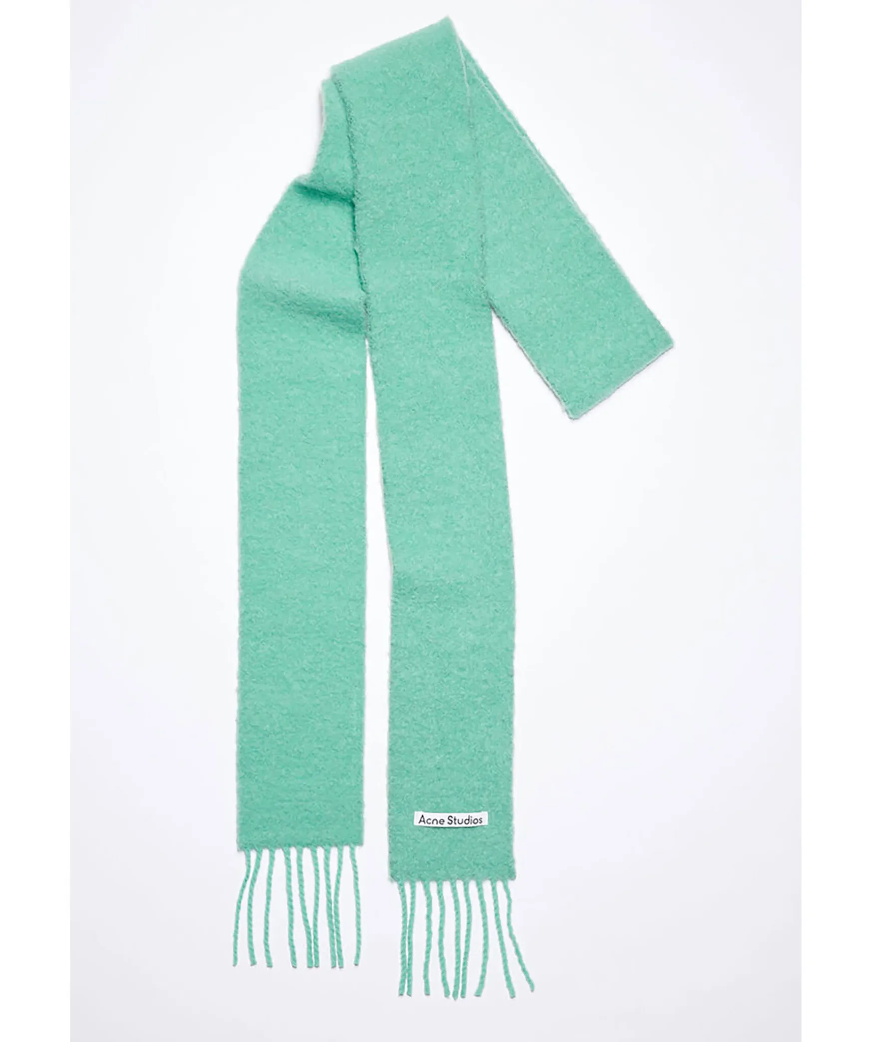 Jadegron Halsduk Som Ar Tillverkad Av En Ull-Alpackablandning Fran Acne Studios. Detaljerad Med En Acne Studios Logotypetikett Och Med Fransar I Kortandorna. Matt: 264 Cm X 10 Cm. Fransmatt: Ca 12 Cm.
