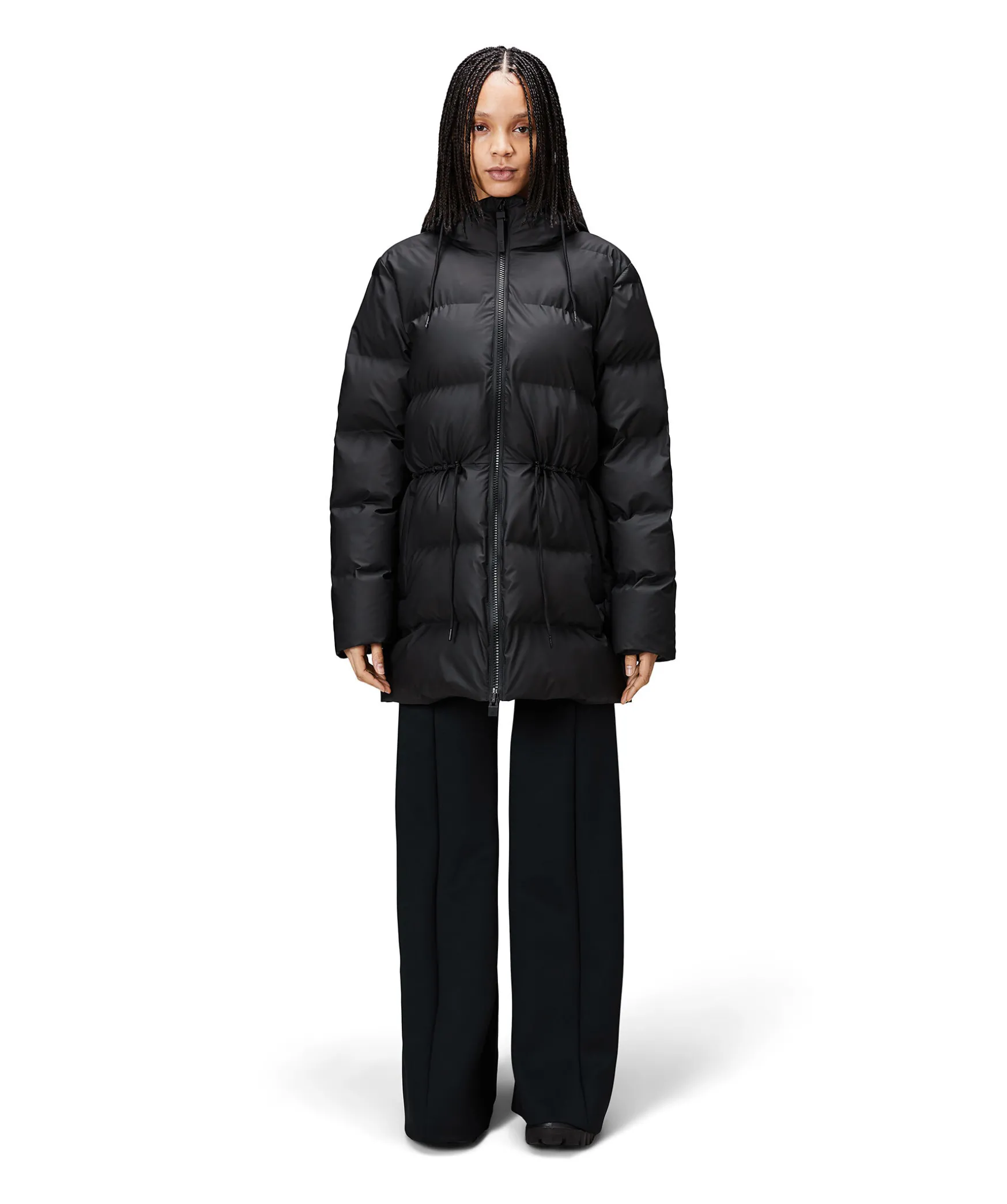 Svart Puffer Parka Jacka Fran Rains. En Lite Langre, Vattentat Vinterjacka Med En Ren, Lattburen Puffer-Estetik. Som En Del Av Alta Puffer-Serien Kannetecknas Plagget Av En Raffinerad Silhuett, Breda Signaturkammare Och Avskalade Detaljer. Den Har Lyxiga Puffern I Vattentatt Signaturtyg Som Andas Bygger Pa Fjaderlos Kammarteknologi Som Haller Dig Varm Och Bekvam I De Kallaste Vadren. Jackan Har Gummerat Tvavagsblixtlas, Ultraljudsgjutna Sommar, Rymliga Fleecefodrade Sidfickor, Dolda Stormmanschetter Och Inre Brostficka. Silhuetten Fullandas Av En Fodrad Dragskohuva Och Dragskomidja.