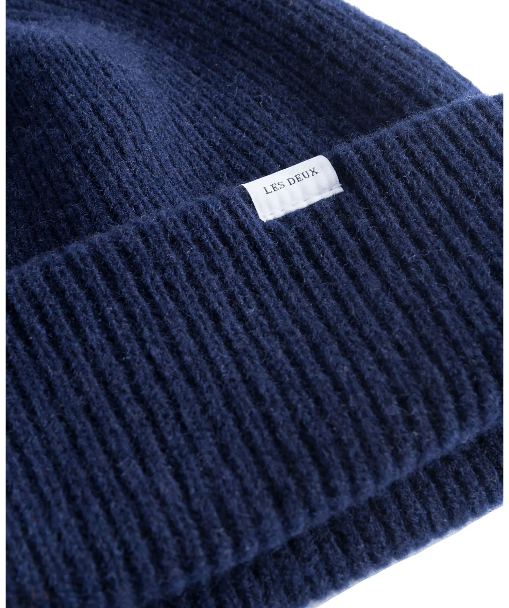 Marinbla Ribbstickad Mossa I Ull Fran Les Deux. Uppvikt Kant Med Liten Logotyp.